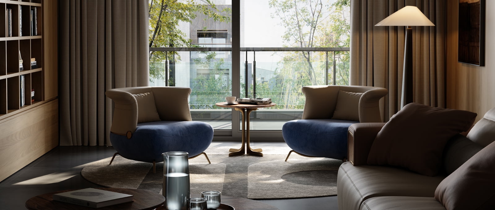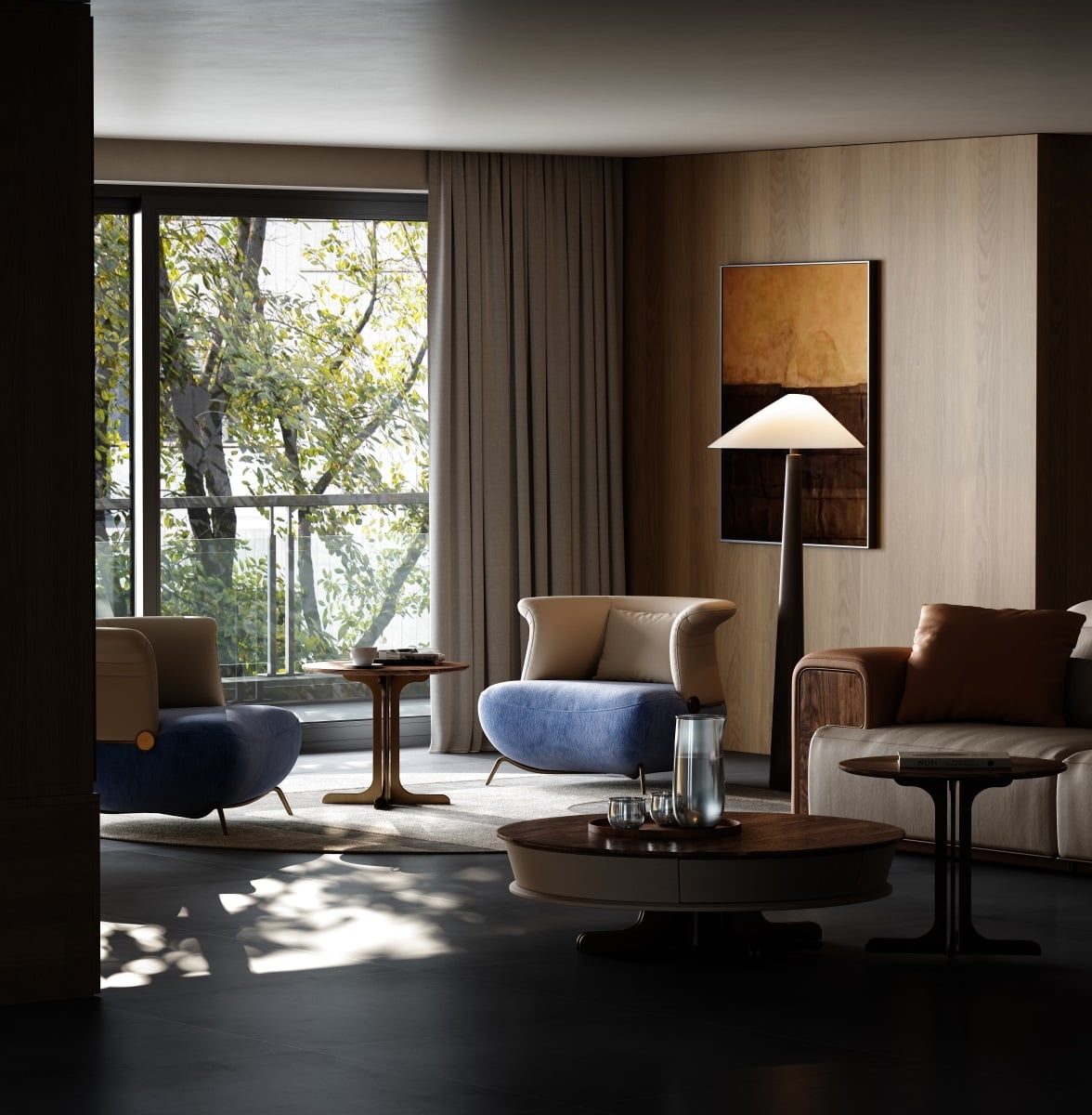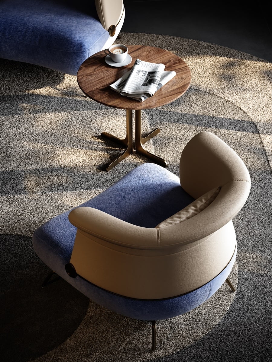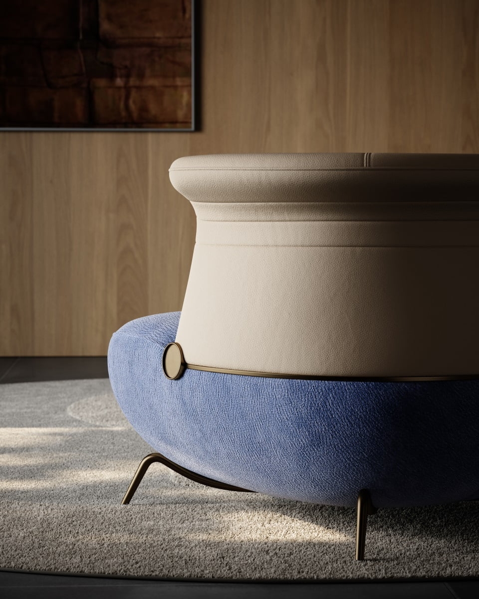 The backrest has a smooth curve, as if the petals of a flower are unfurling, providing comfortable support. The feet are designed to be low and slim and do not take up too much space, making them suitable for modern minimalist interior design.