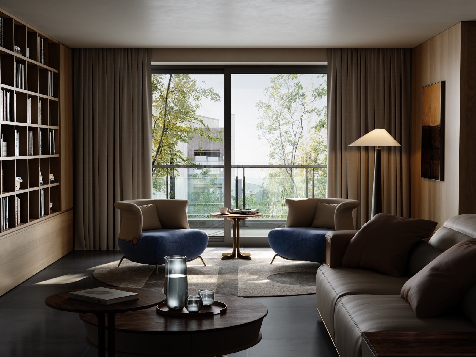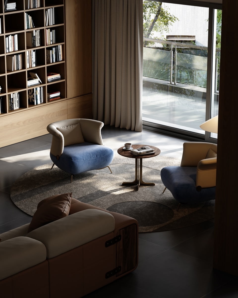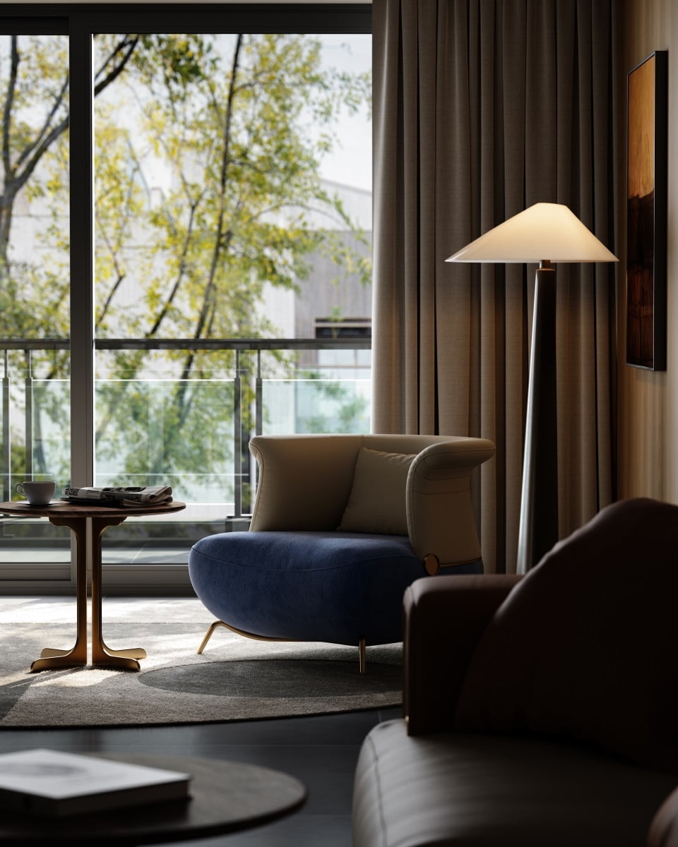 The backrest has a smooth curve, as if the petals of a flower are unfurling, providing comfortable support. The feet are designed to be low and slim and do not take up too much space, making them suitable for modern minimalist interior design.