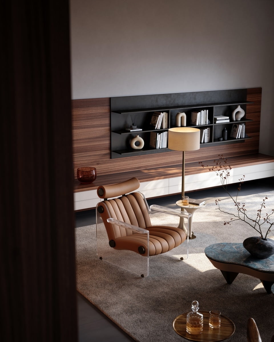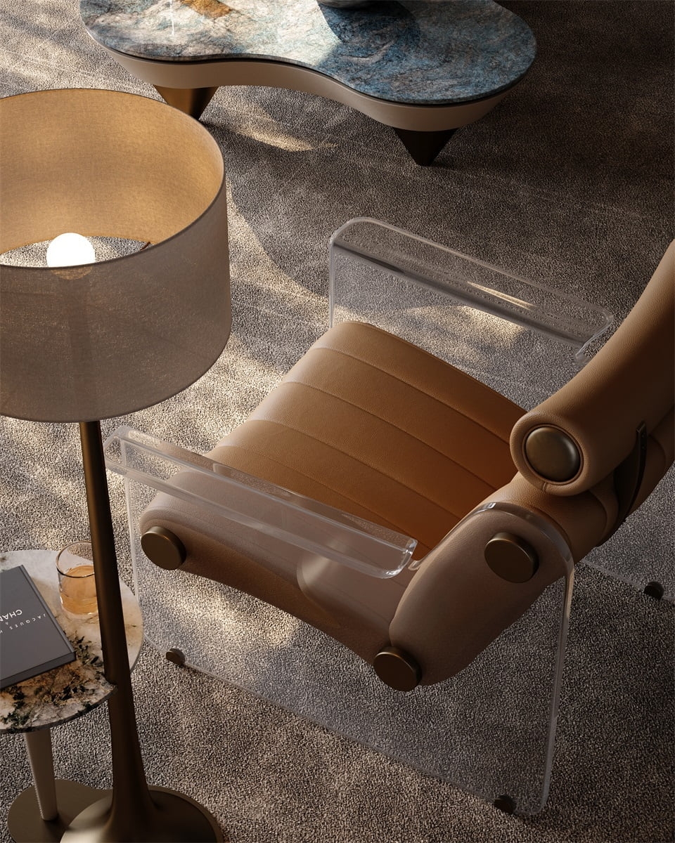 The high-transparency acrylic is used as the material of the support base. At the same time, the design structure integrated with the armrest makes the leisure chair present a fantasy picture suspended in the air, opening up an avant-garde design experience that dialogues with the space age.
