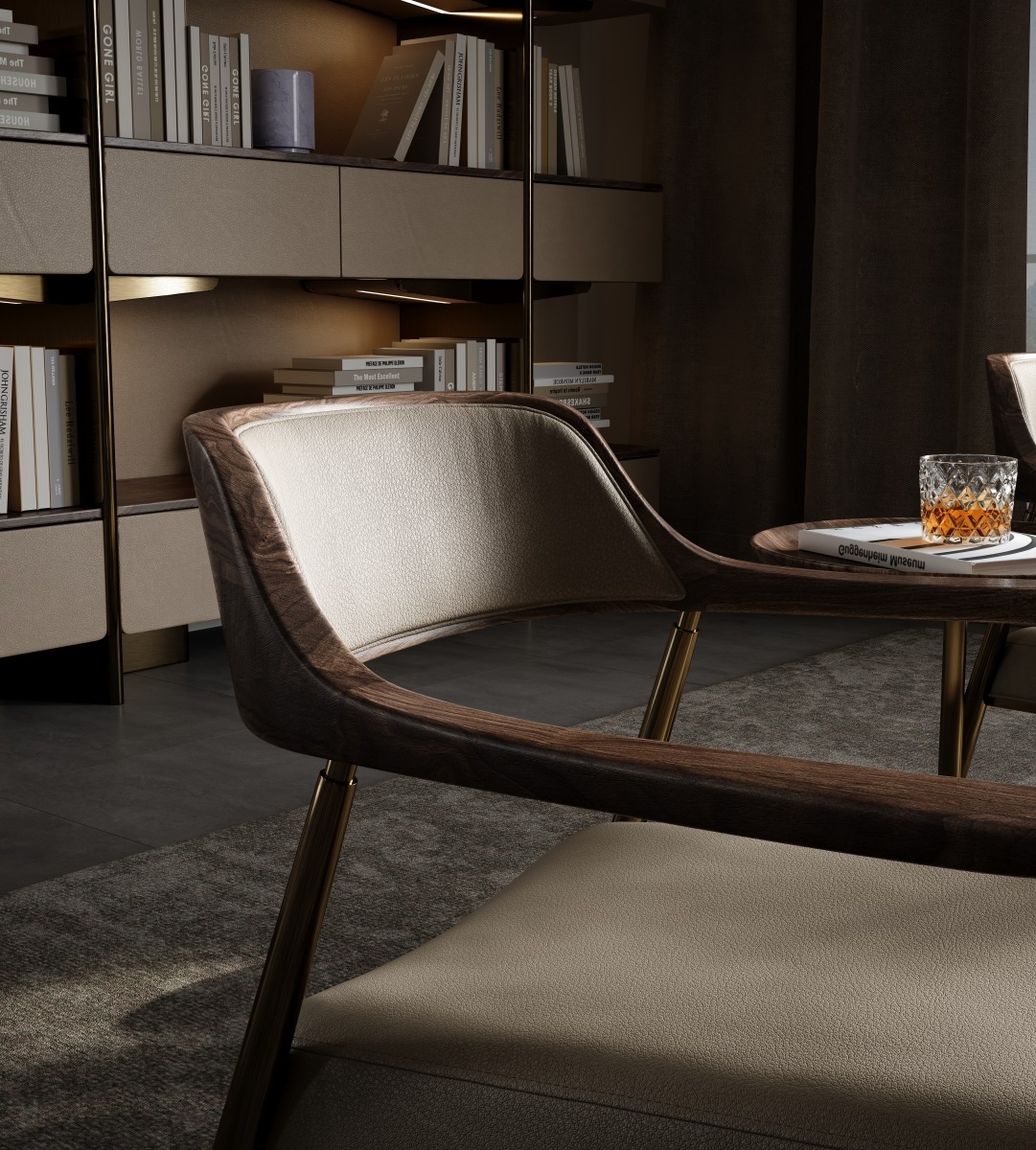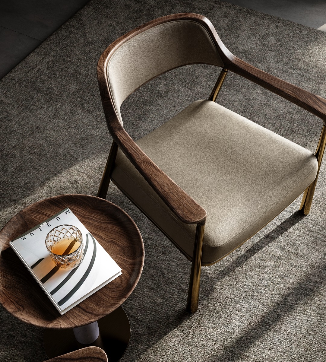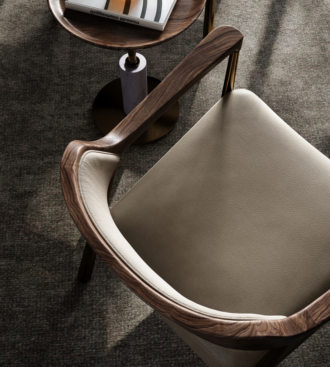 The chair body is made of light grey leather, which is delicate, soft and luxurious to the touch; the solid wood armrests are matched with metal brackets, the former is warm and natural, and the latter is neat and modern. The combination of the three injects an elegant and refined atmosphere into the space, suitable for a variety of scenes such as leisure and relaxation, reading and tea tasting.
