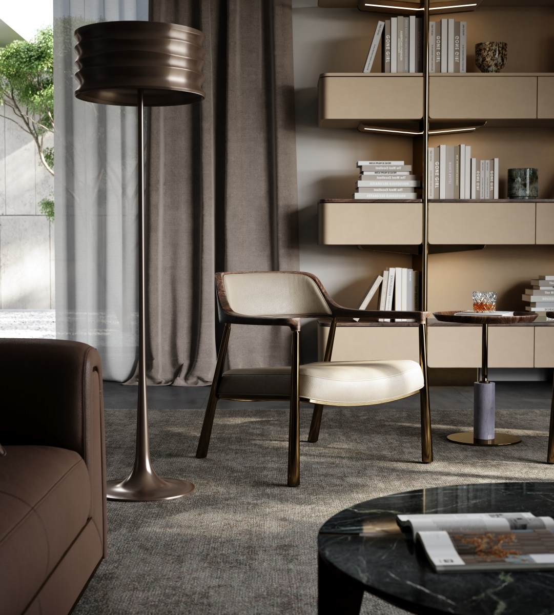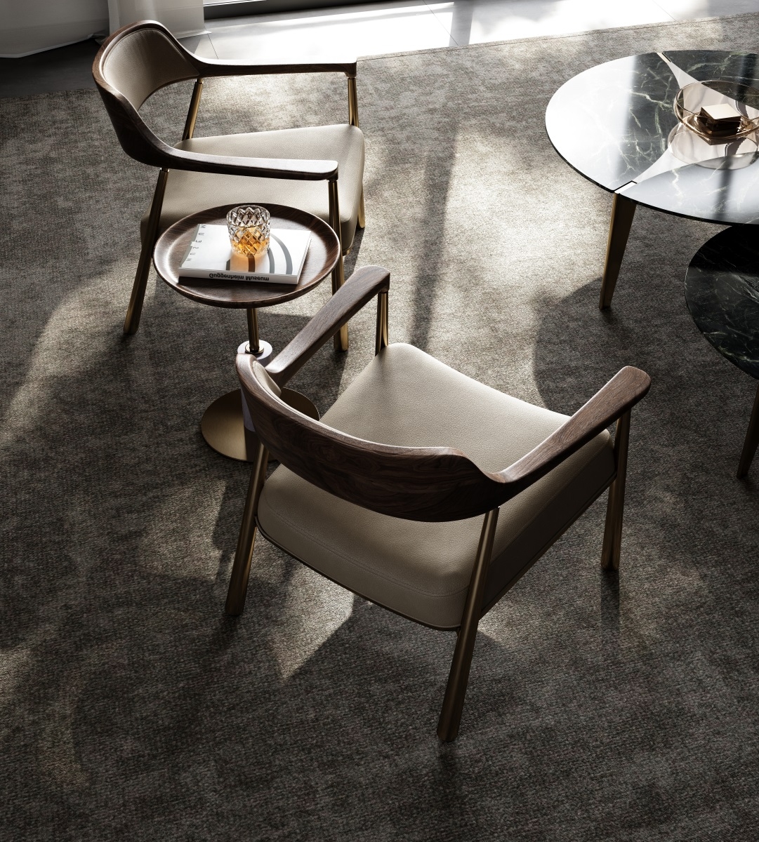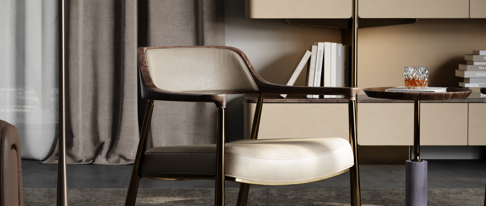 The chair body is made of light grey leather, which is delicate, soft and luxurious to the touch; the solid wood armrests are matched with metal brackets, the former is warm and natural, and the latter is neat and modern. The combination of the three injects an elegant and refined atmosphere into the space, suitable for a variety of scenes such as leisure and relaxation, reading and tea tasting.