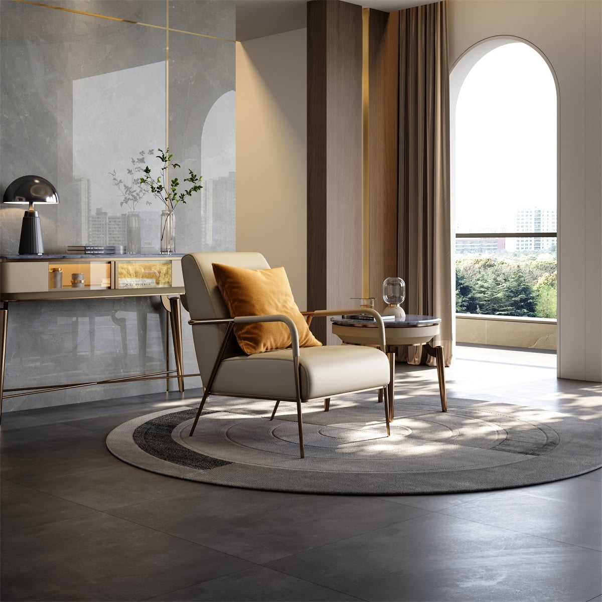 This armchair is a perfect embodiment of modern luxury. Upholstered in smooth, light - toned leather, it offers a soft and inviting surface. The sleek, metallic - finished frame in a warm brown hue not only provides sturdy support but also adds a touch of sophistication.