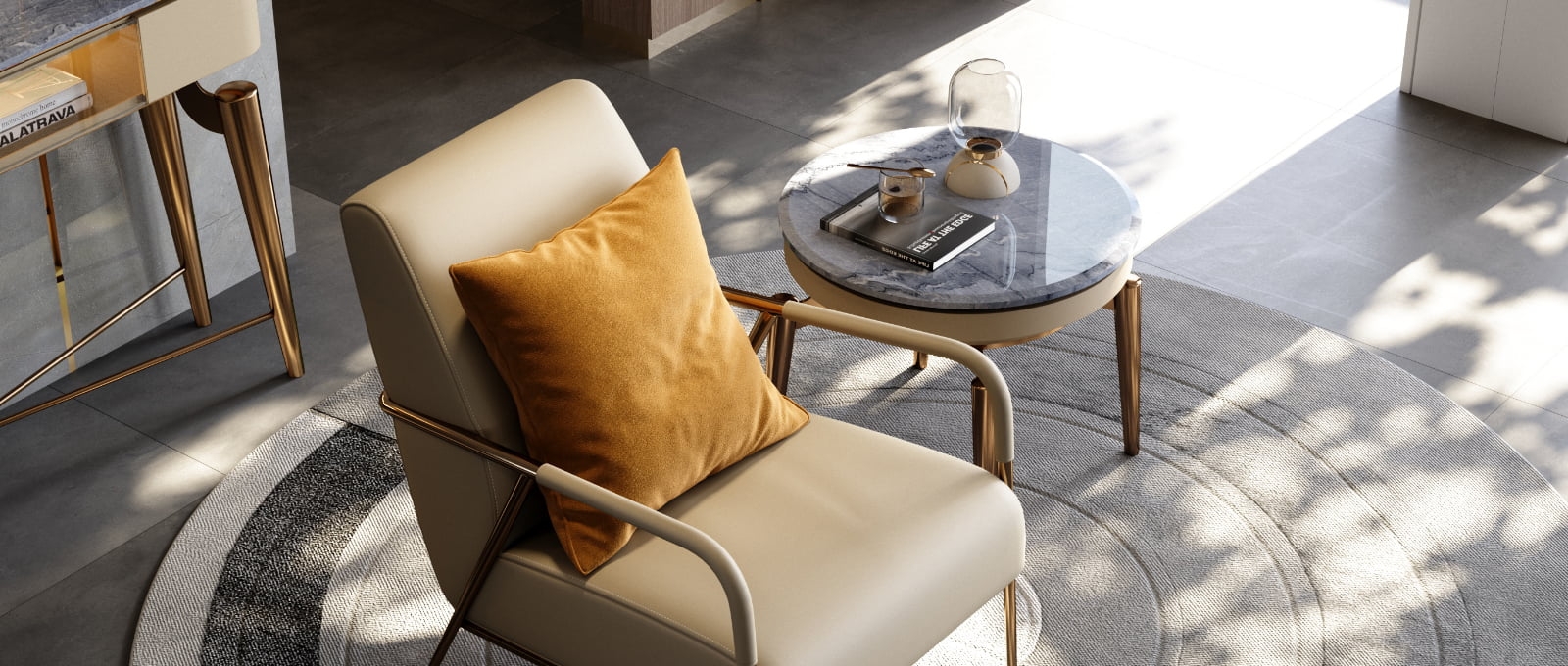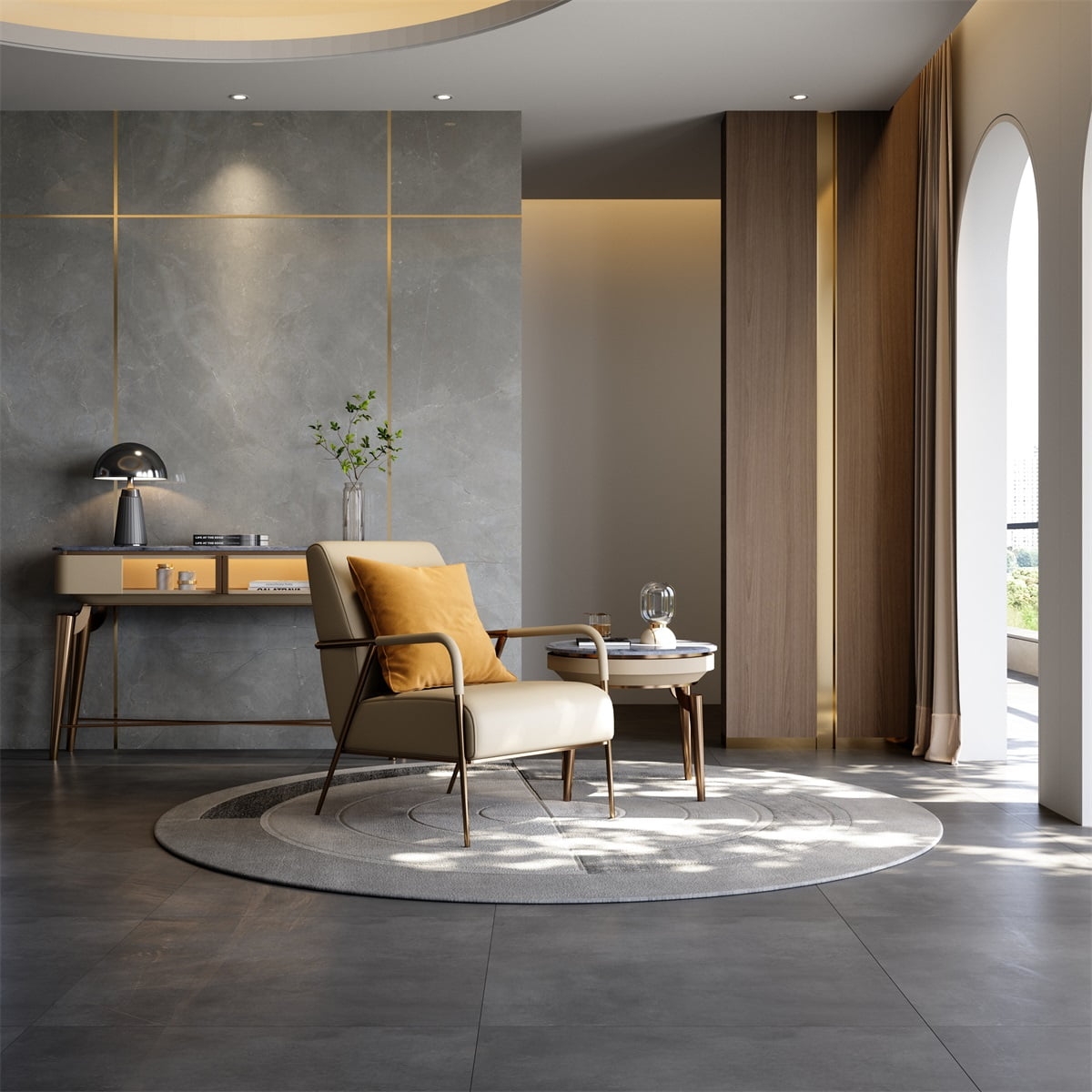 The high leg support design makes the lounge chair look light and stable. The front end of the armrest is wrapped in leather, and the metal representing modern luxury is integrated with the design temperature of humanistic care.