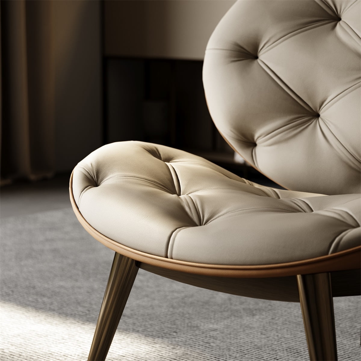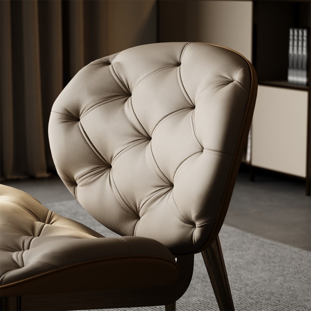 The chair body is made of beige genuine leather with exquisite diamond-shaped stitching on the surface, and the touch is delicate and luxurious; the solid wood footrest has a warm color and natural texture. The combination of the two injects an elegant and calm atmosphere into the space, suitable for a variety of scenes such as leisure and relaxation, reading and tea tasting.