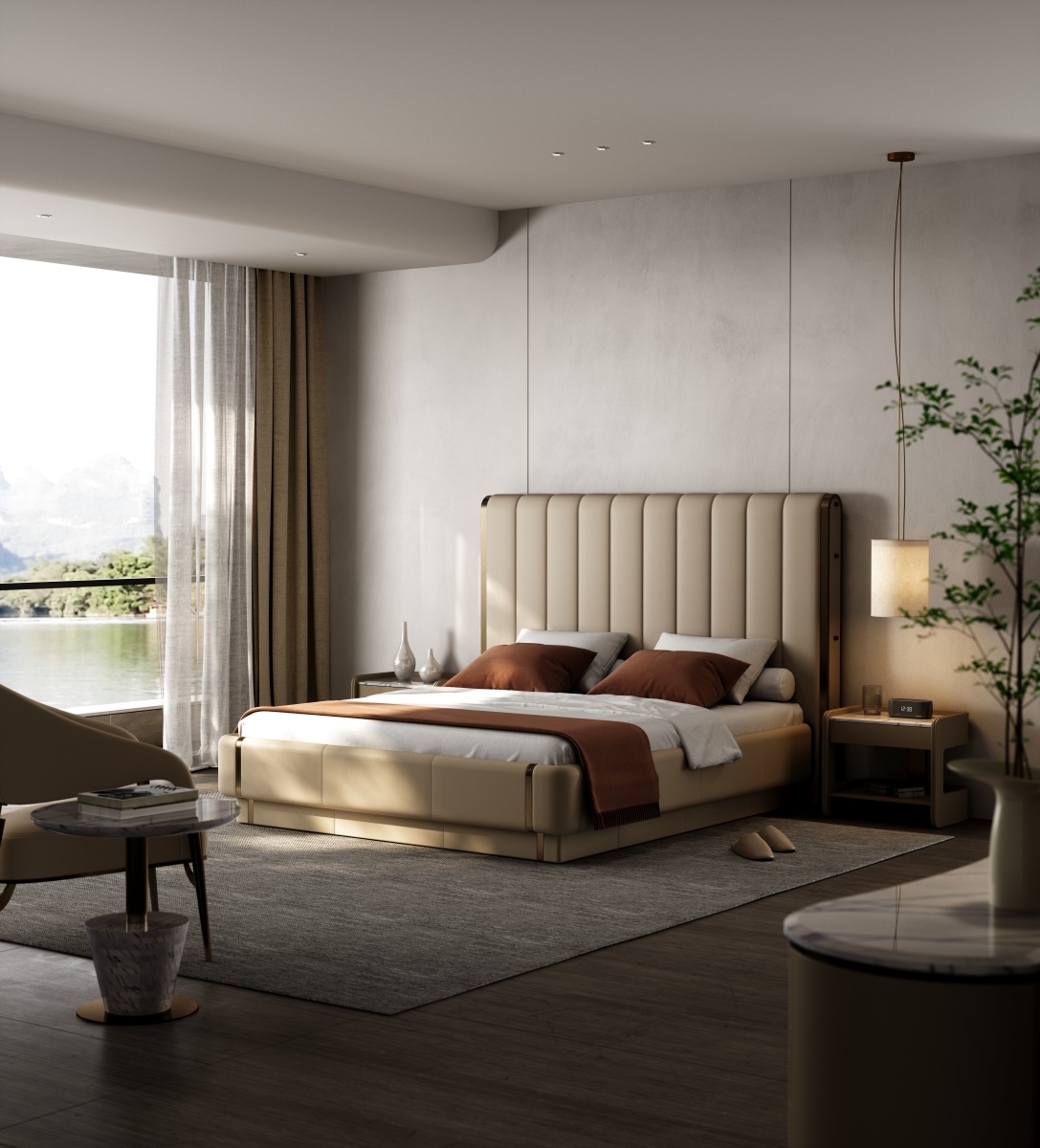 The design of relative symmetry adds stability and symmetrical beauty to the product; The soft bag headboard, which combines leather and metal, not only continues the modern luxury aesthetics, but also ensures a comfortable and practical experience.