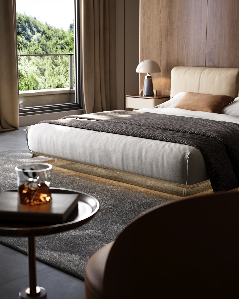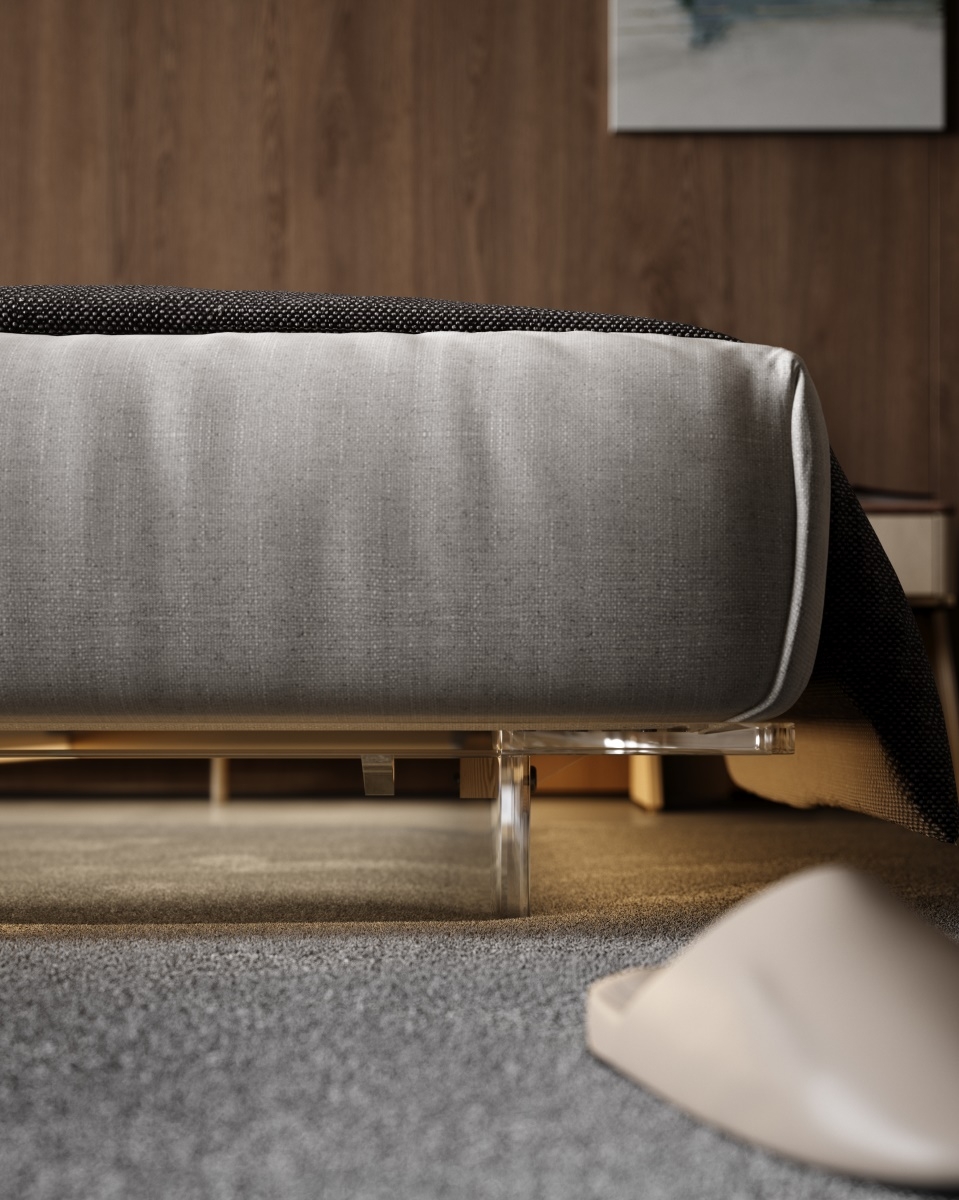 Supporting feet: The acrylic atmospheric backrest design becomes the visual focus, colliding with the acrylic suspended bed feet to create an extraordinary sense of luxury. The exquisite design of the bed bottom adds a unique charm to life with ambient lighting, paired with elegant leather soft bags, comfortable and gentle.