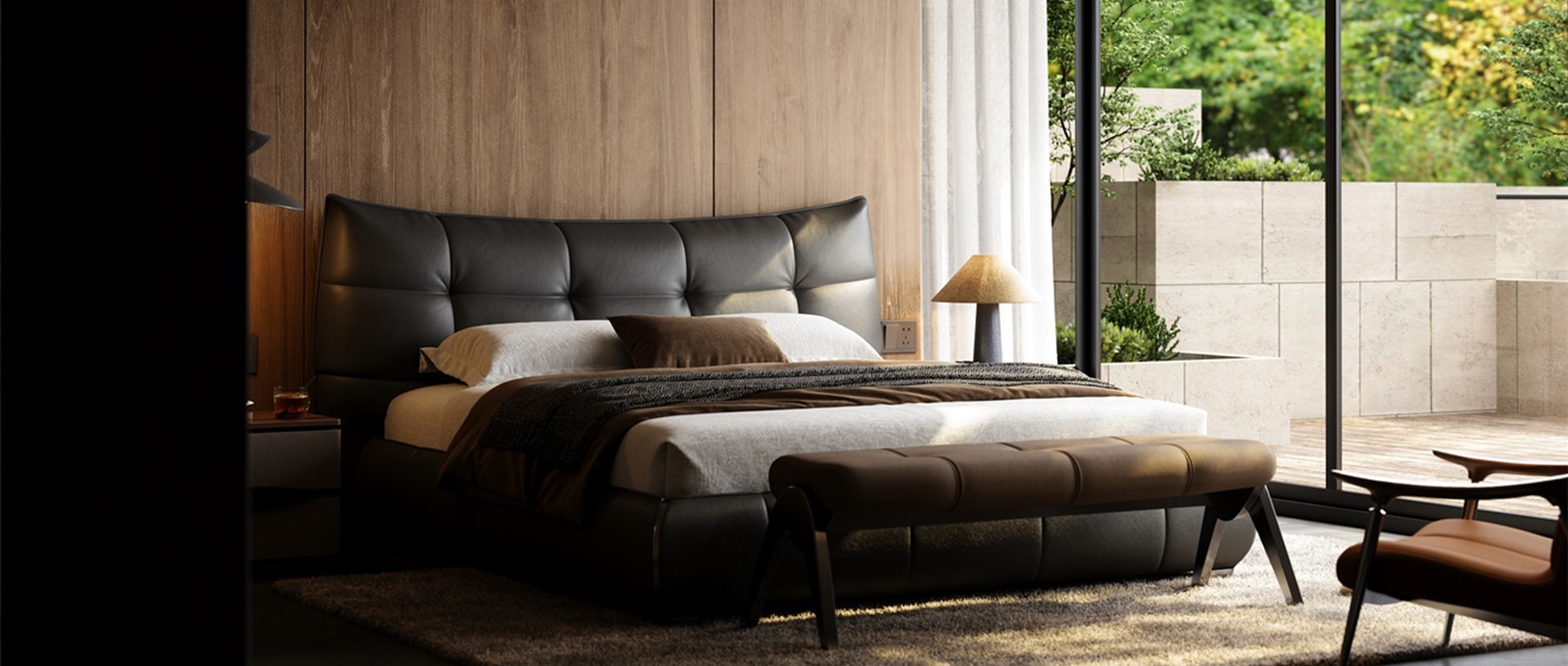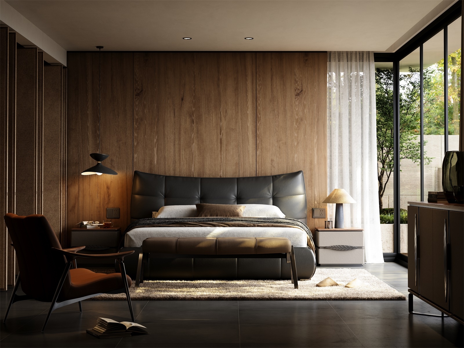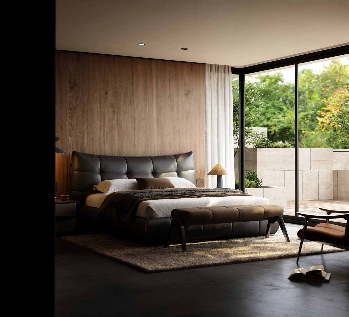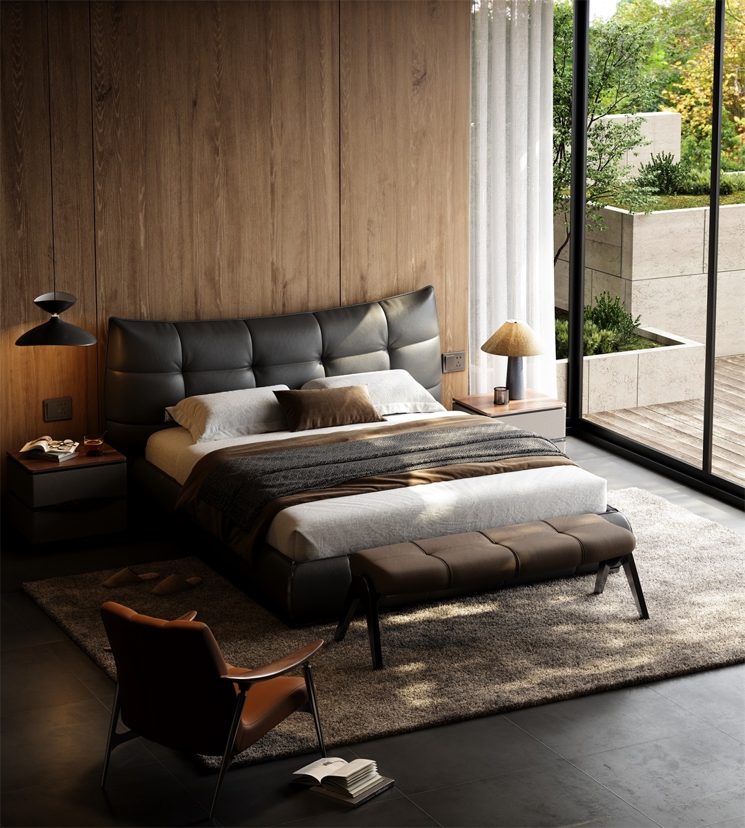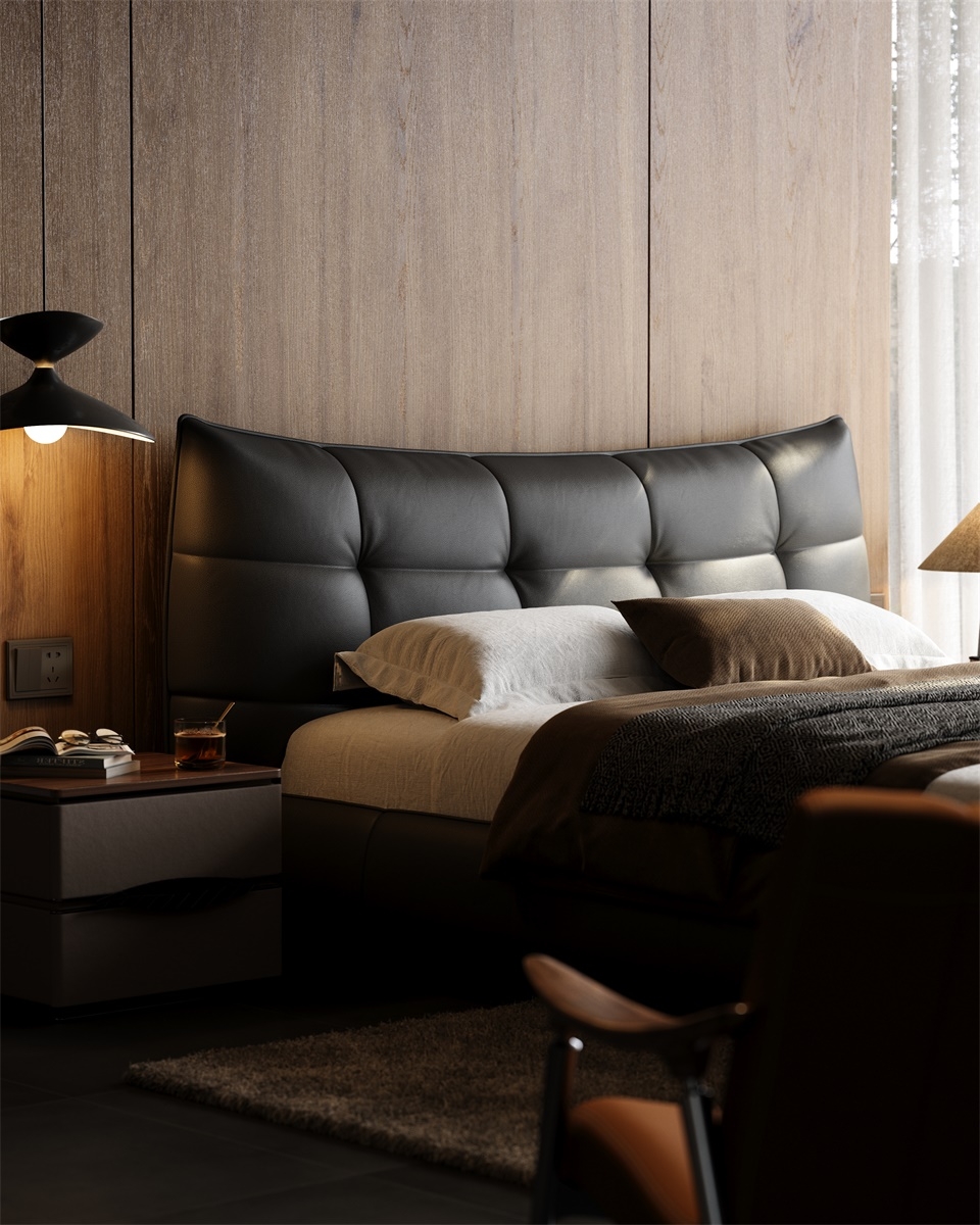 Selected from Italian imported top-grain cowhide, the natural and original texture is as unique as a work of art. The leather is soft and fine. Every inch is hand-tanned and polished to retain the natural breathing feeling. It won't cause sweating even after sitting for a long time and won't age even after long-term use. The black genuine leather surface is treated with matte finish, which weakens the visual sharpness. However, in the interplay of light and shadow, it quietly exudes a low-key luxurious aura, instantly upgrading the master bedroom to the texture of a "private living room".
