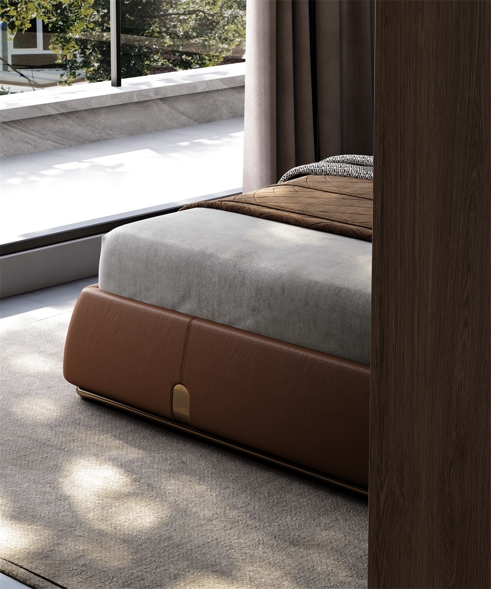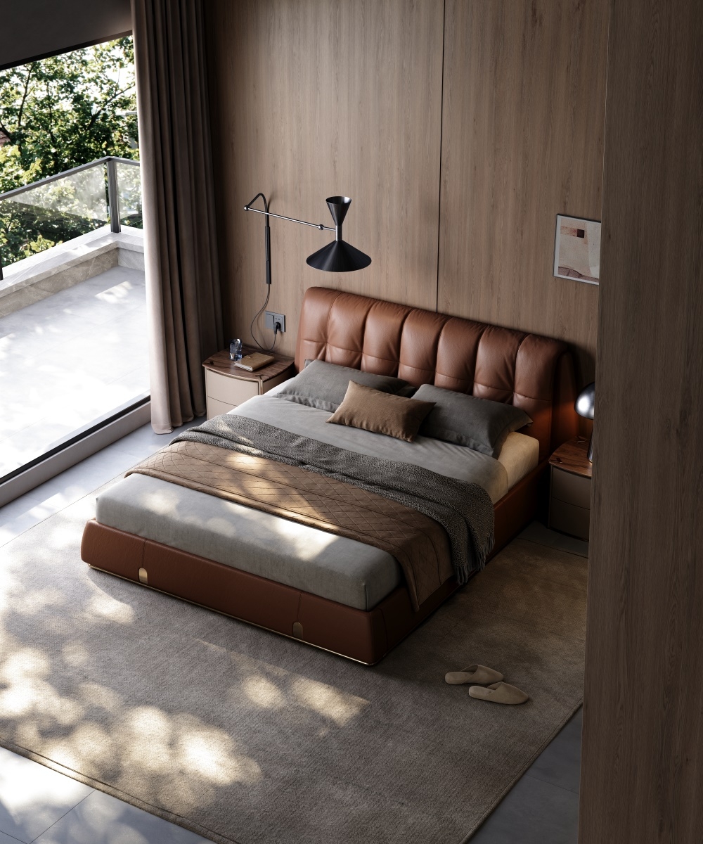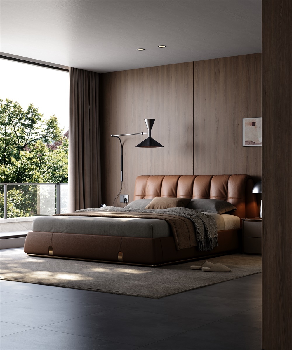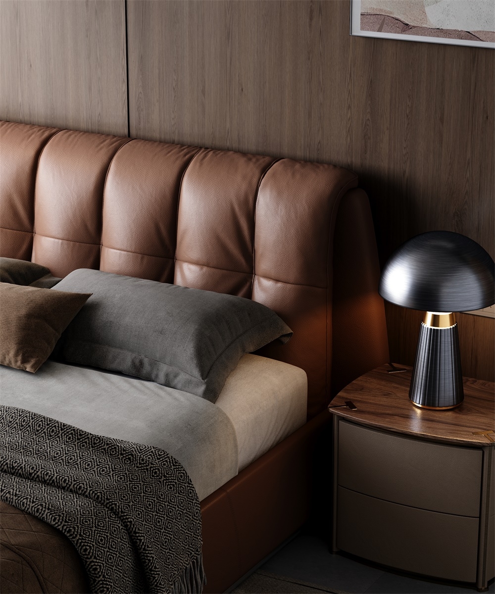 In the realm of high - end bedroom furnishings, this bed reigns supreme. It masterfully blends a tufted, structured design, sumptuous materials, and meticulous detailing to forge a sleep sanctuary for the most discerning connoisseurs.The headboard, adorned with neatly arranged tufts on rich brown leather, presents a geometrically precise and visually striking silhouette. The square - paneled pattern extends to the bed base, creating a cohesive and sophisticated look.