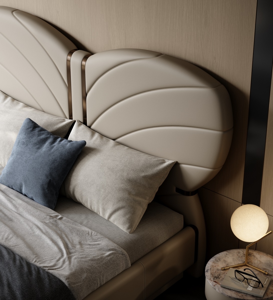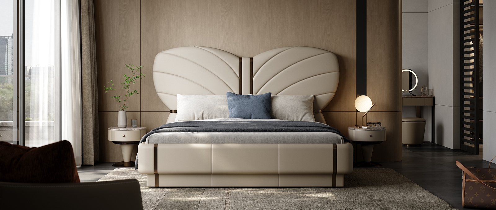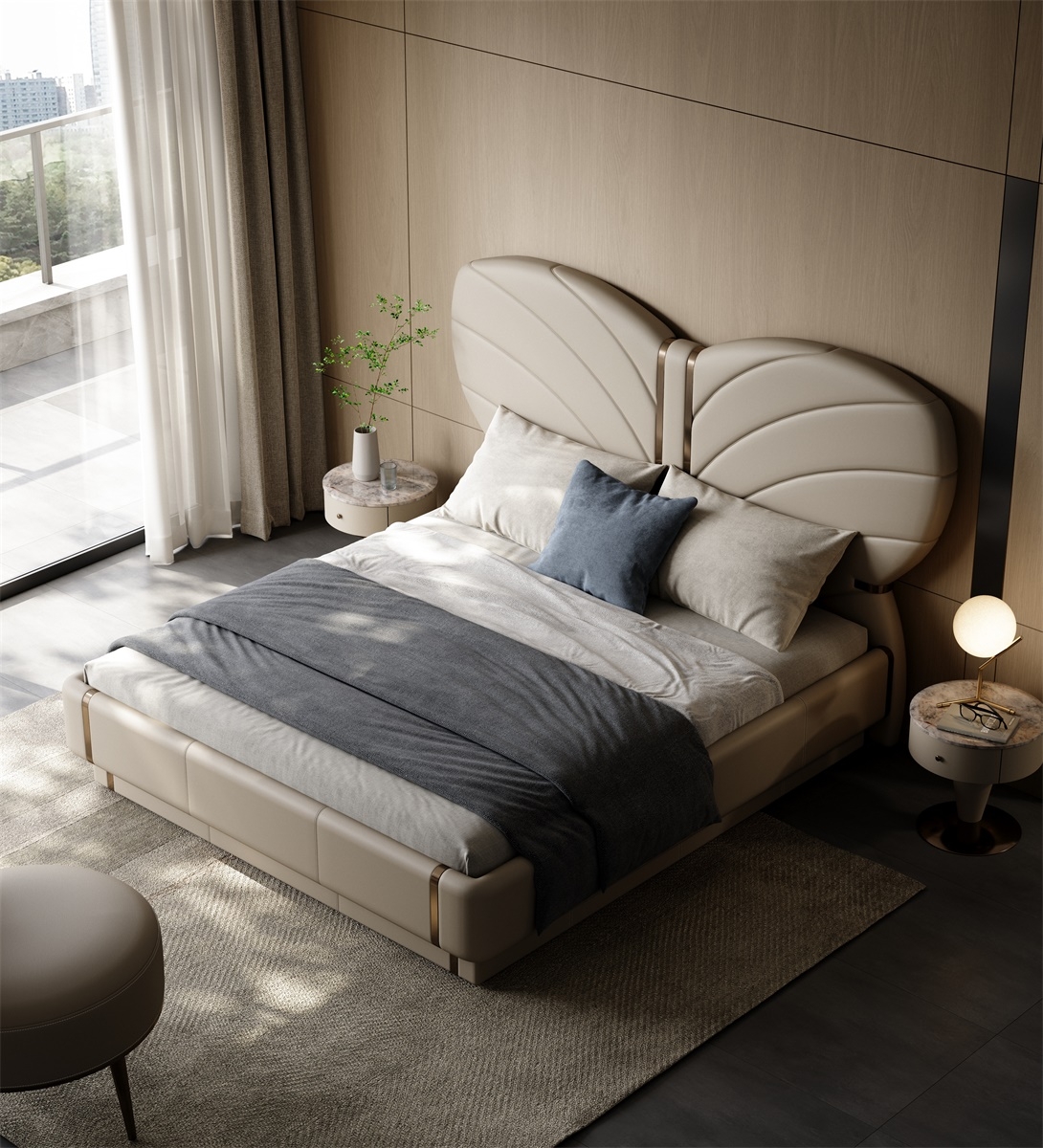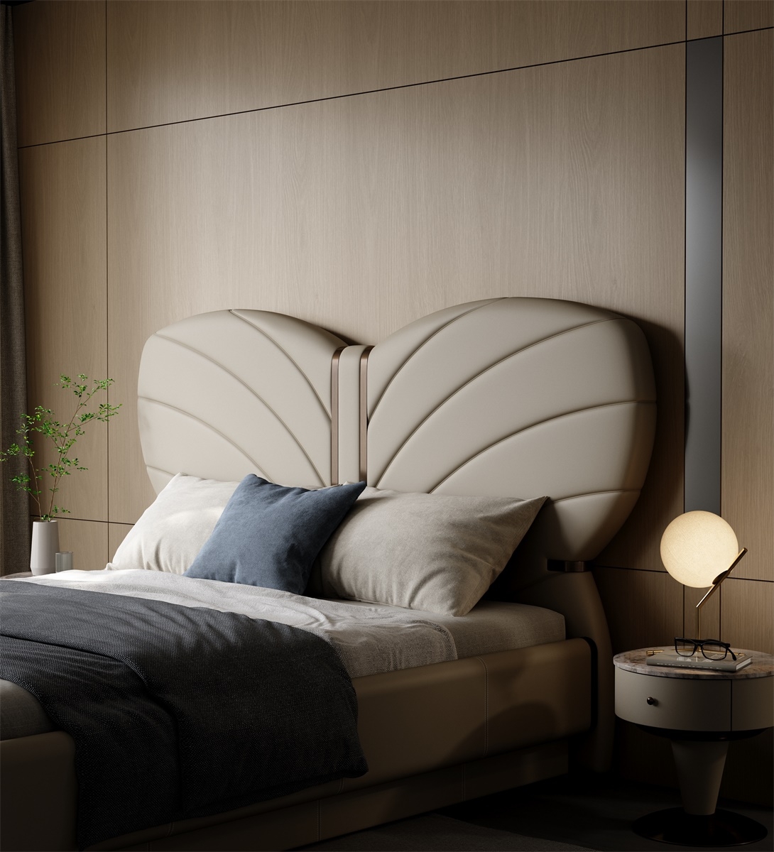 The butterfly headboard covered in leather is elegant and vivid, with a full cushion that is soft and elastic, allowing comfort and texture to coexist.