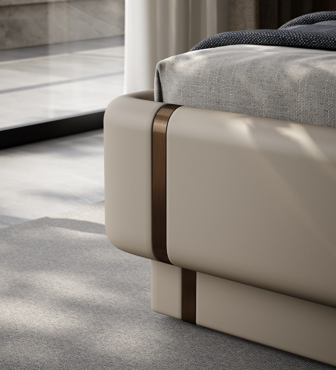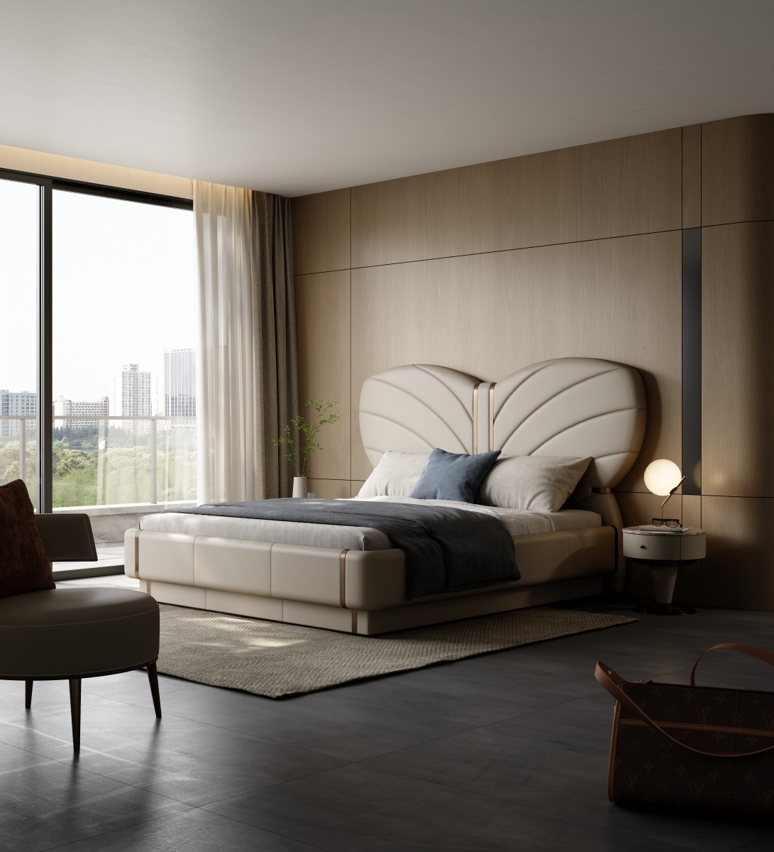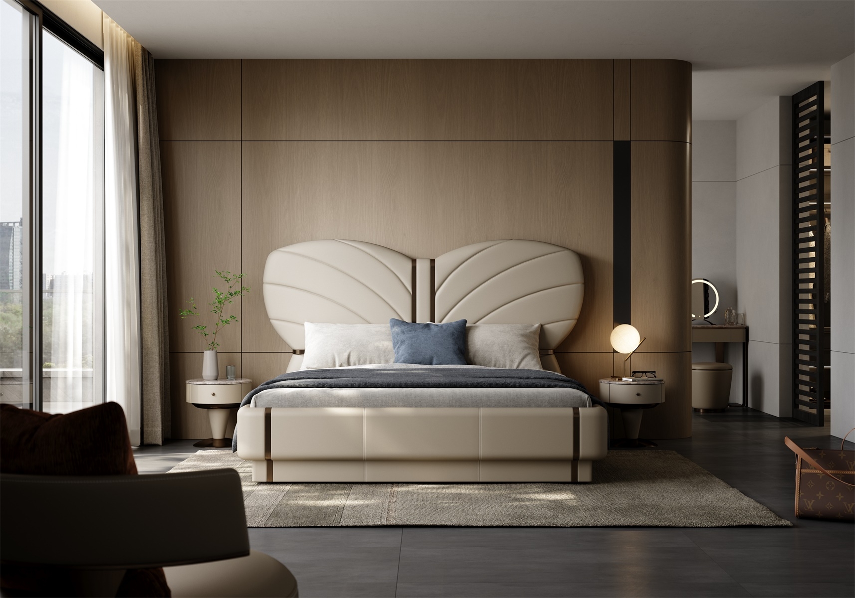 The butterfly headboard covered in leather is elegant and vivid, with a full cushion that is soft and elastic, allowing comfort and texture to coexist.