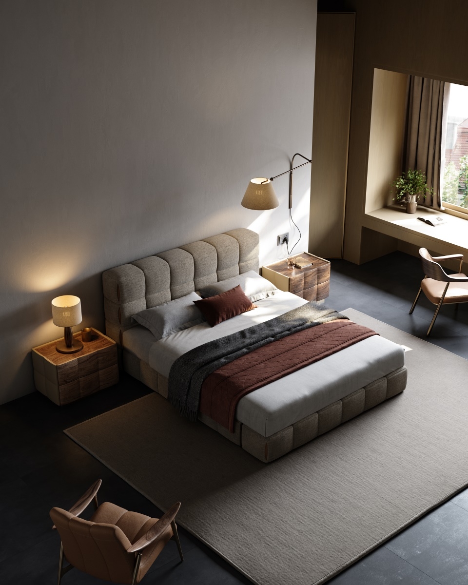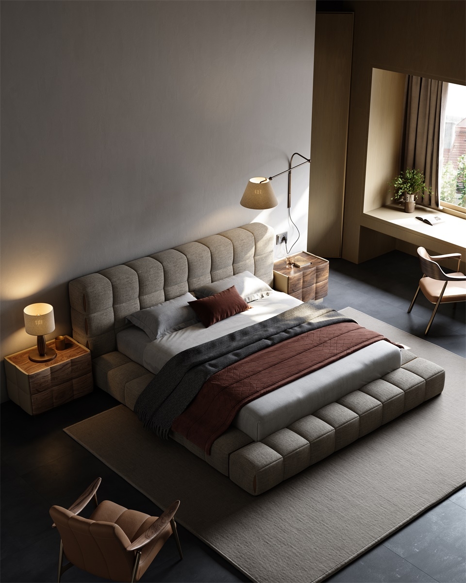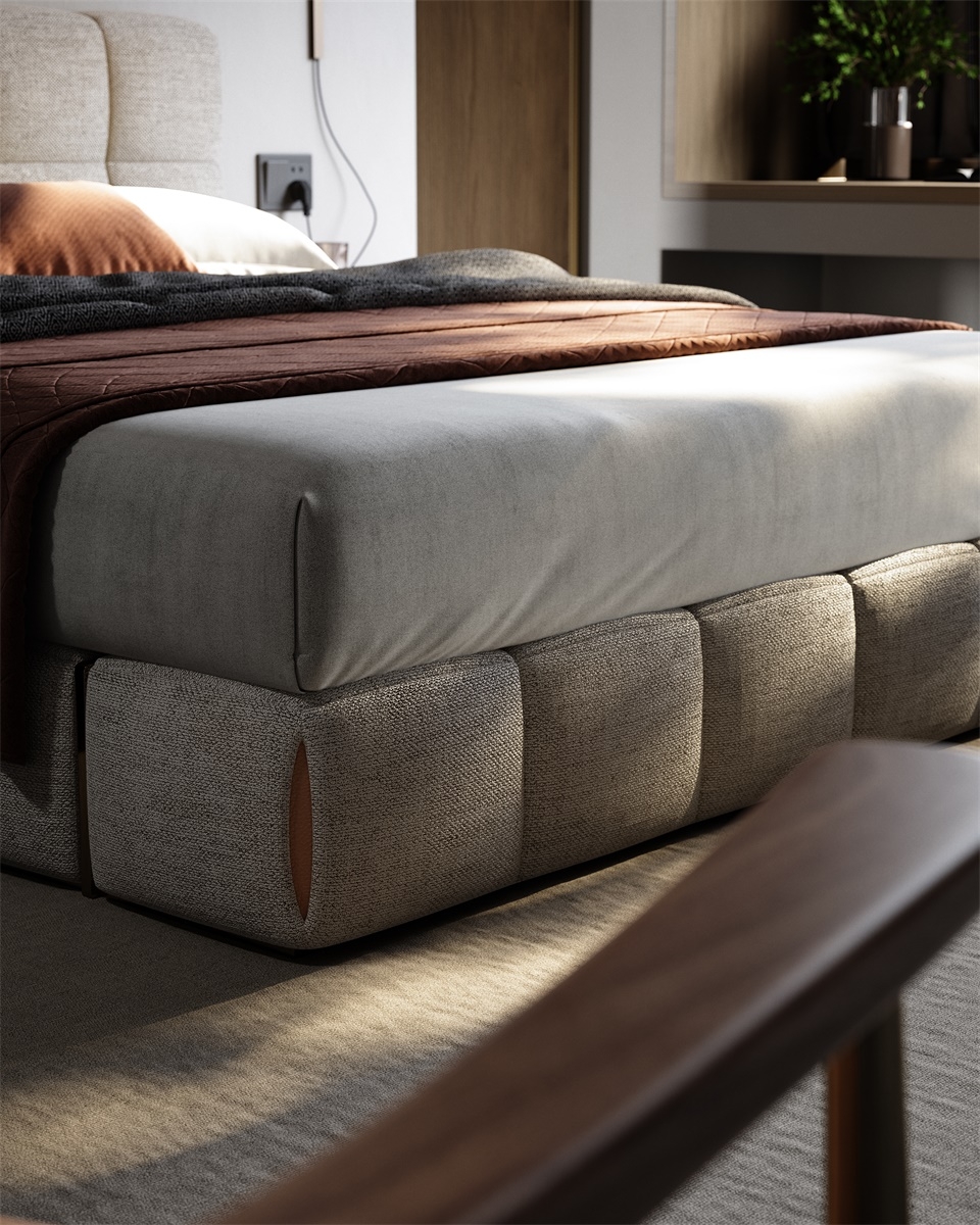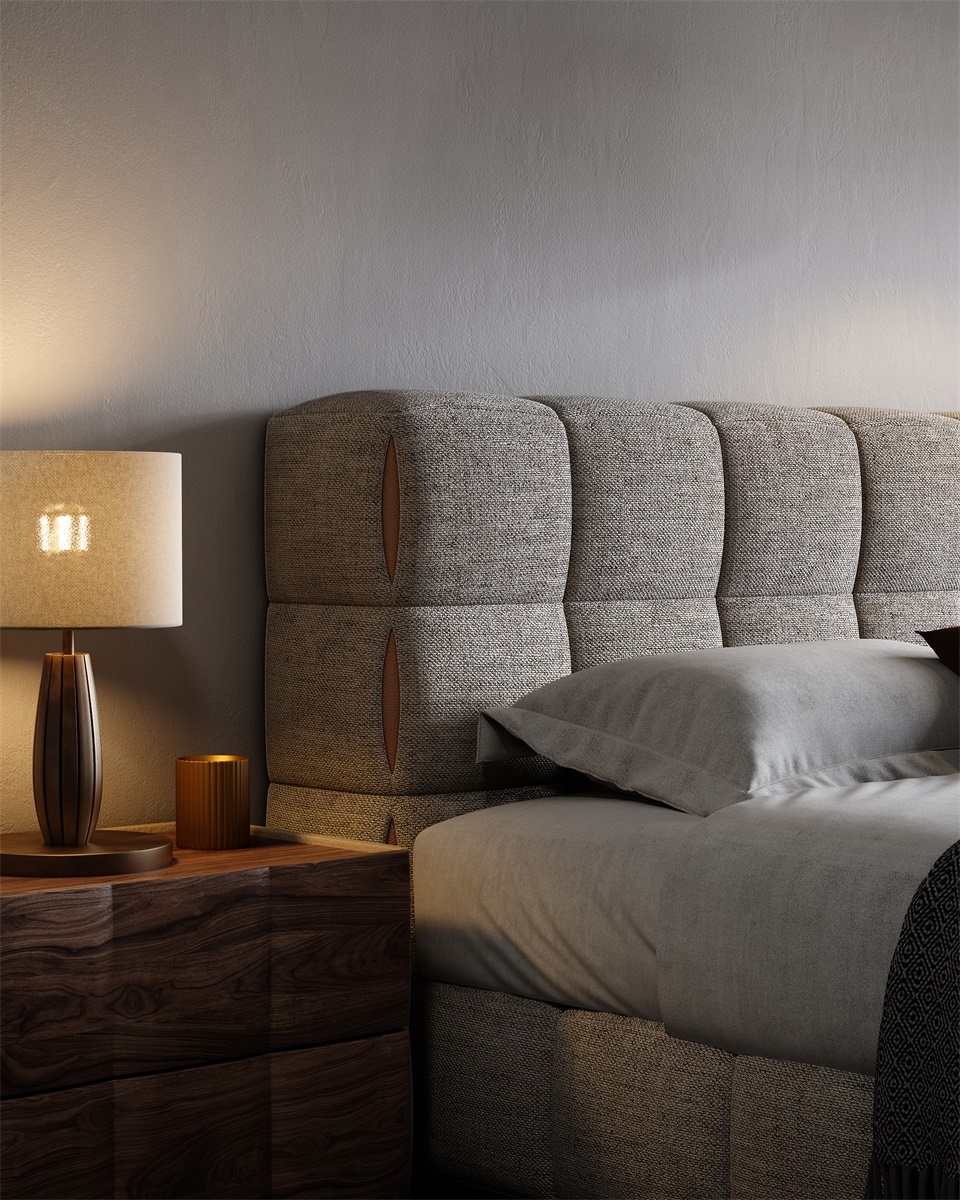 The headboard and body of the bed use geometric grid elements, with thick and full blocks that give a sense of wrapping. The folded seams in the details are designed to blend with warm brown and dark colors, creating an artistic beauty.