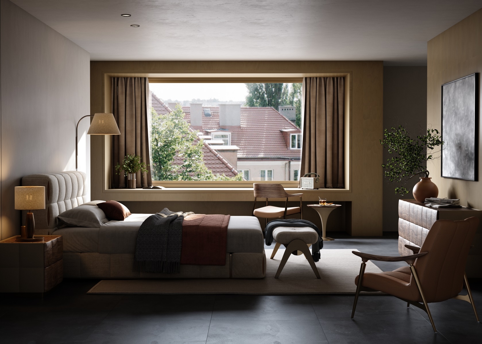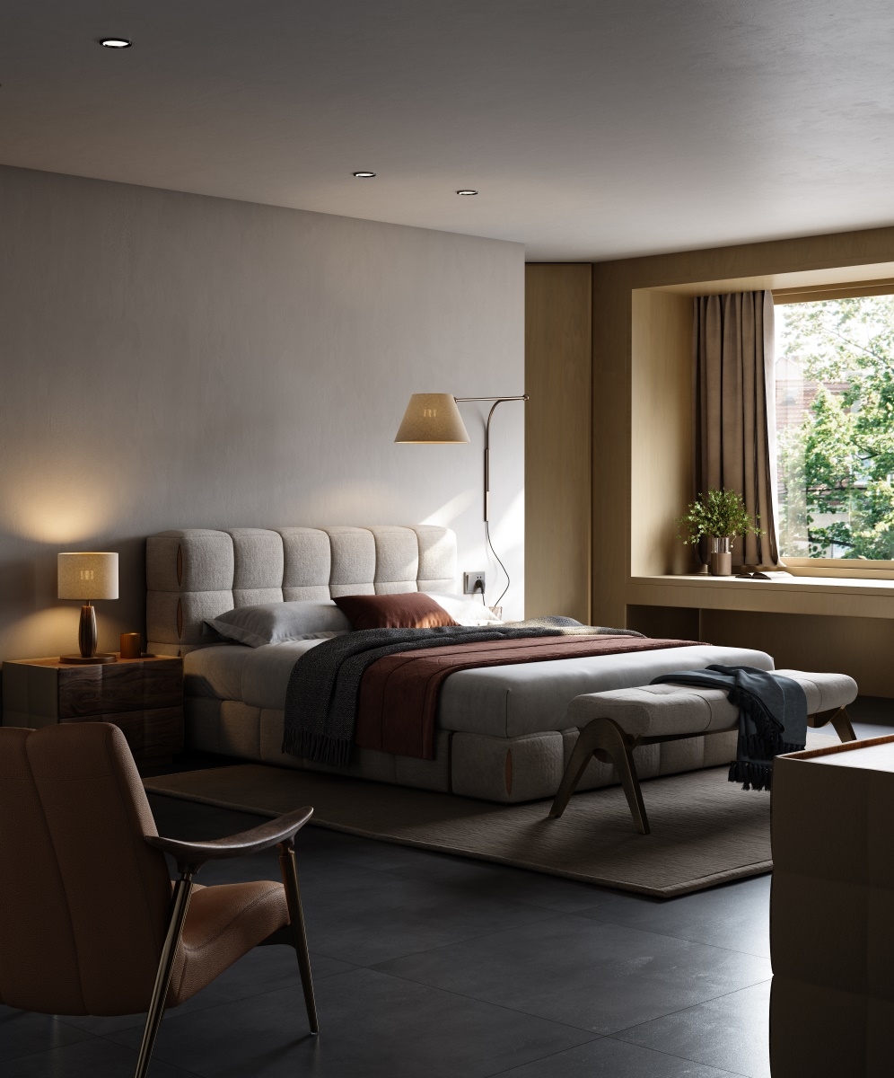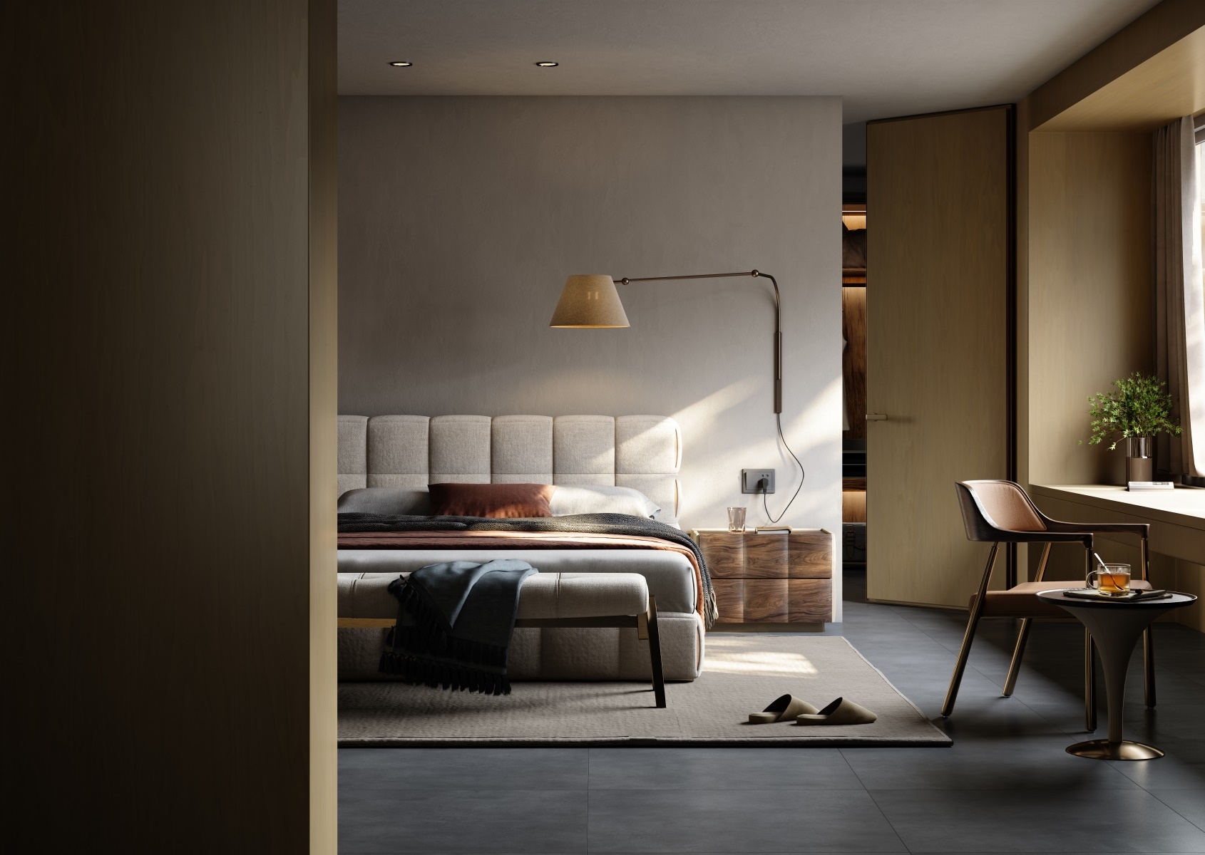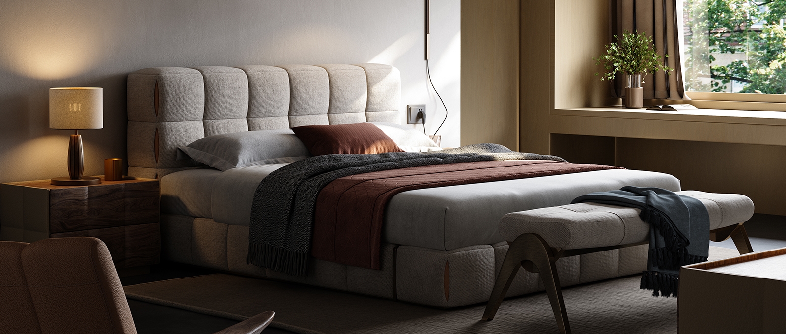 The headboard and body of the bed use geometric grid elements, with thick and full blocks that give a sense of wrapping. The folded seams in the details are designed to blend with warm brown and dark colors, creating an artistic beauty.