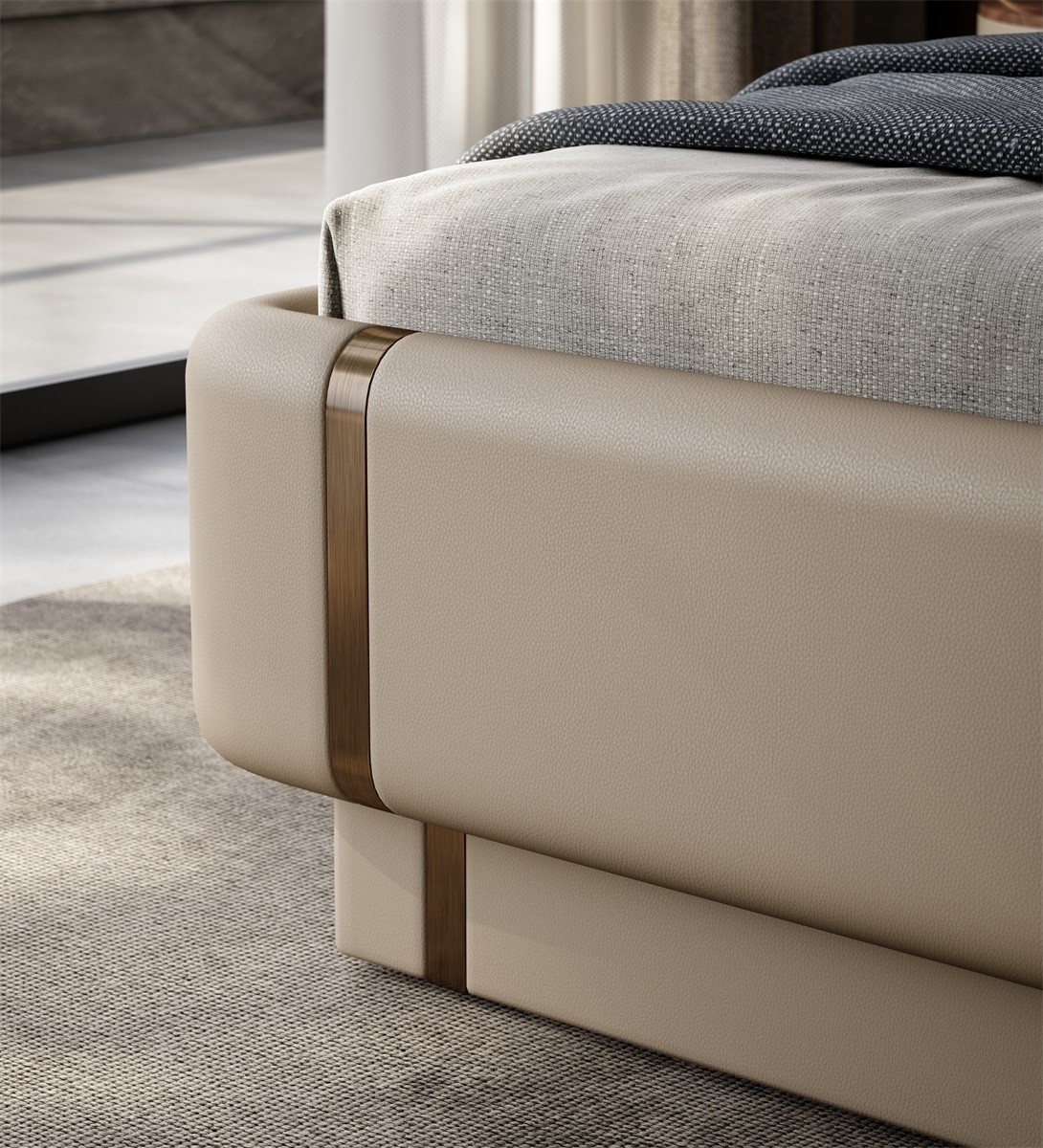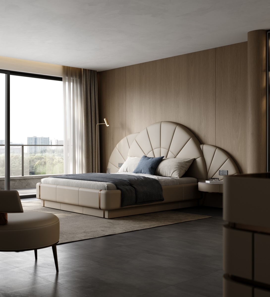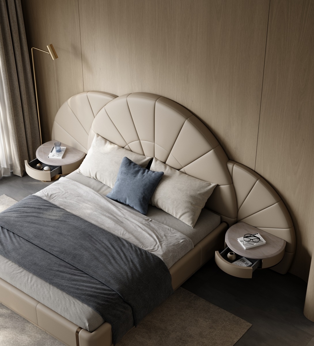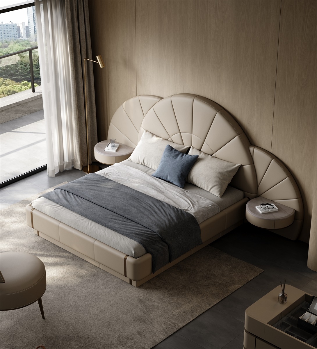 Inspired by the deep sea, it contains all kinds of things in the world, simulating the shape of shells or extracting the beauty of inner lines, interpreting luxury and elegance with modern design.Features a bold, butterfly - inspired headboard with soft curves and subtle stitching. The neutral beige tone and metallic accents create a glamorous, high - end look—perfect for transforming bedrooms into luxury retreats.