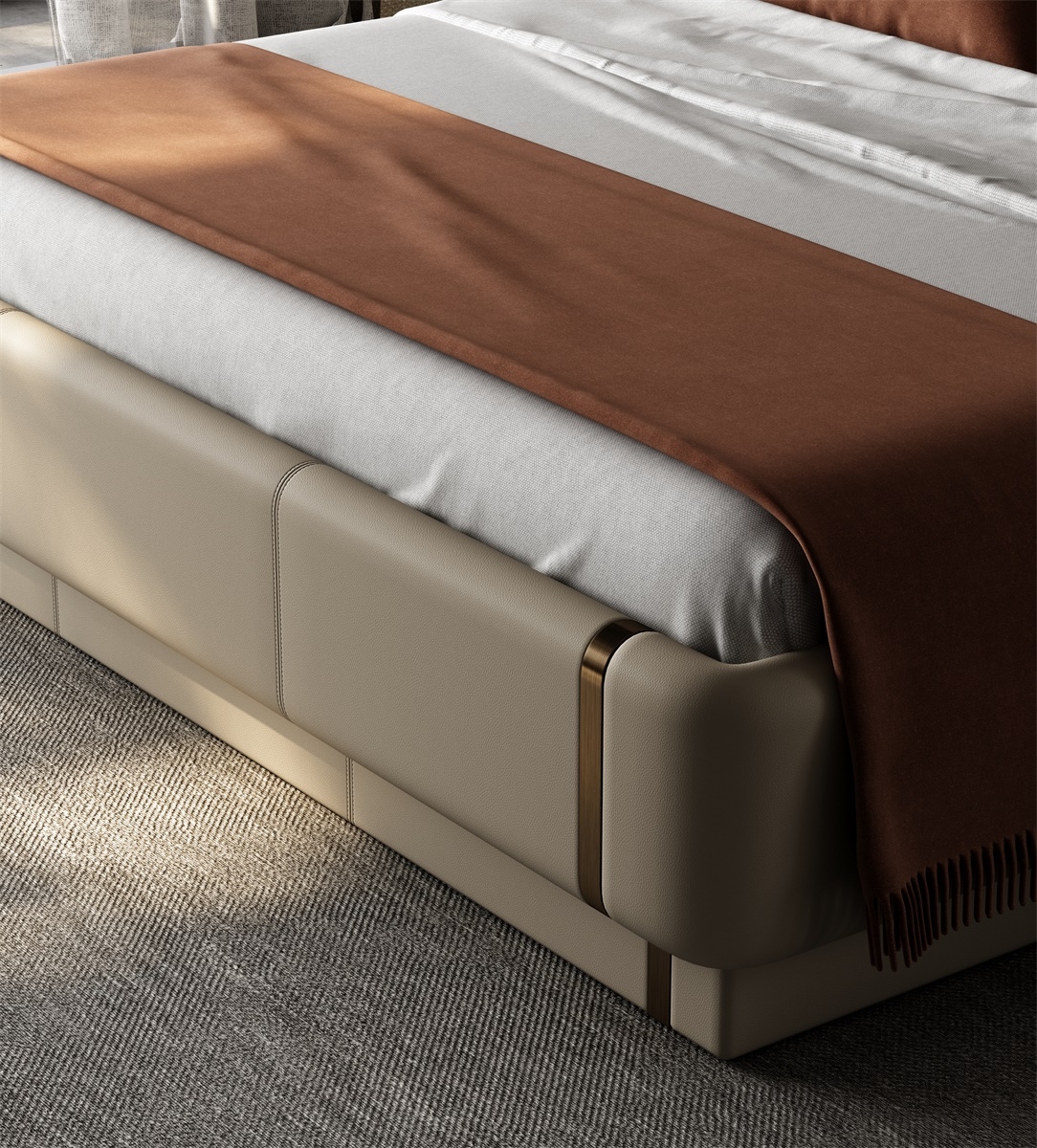 The design of relative symmetry adds stability and symmetrical beauty to the product; The soft bag headboard, which combines leather and metal, not only continues the modern luxury aesthetics, but also ensures a comfortable and practical experience.