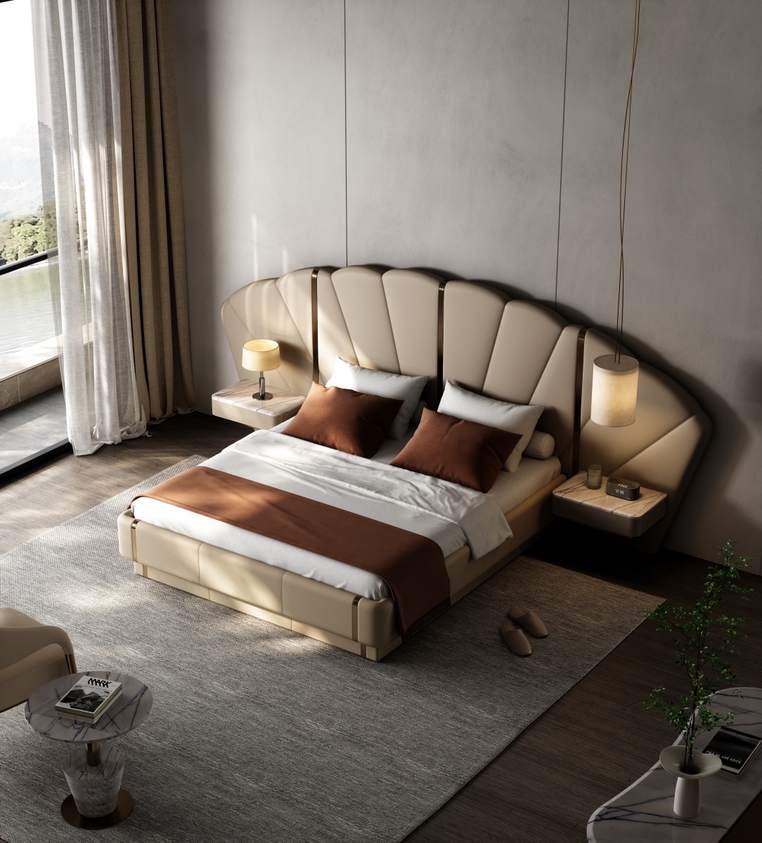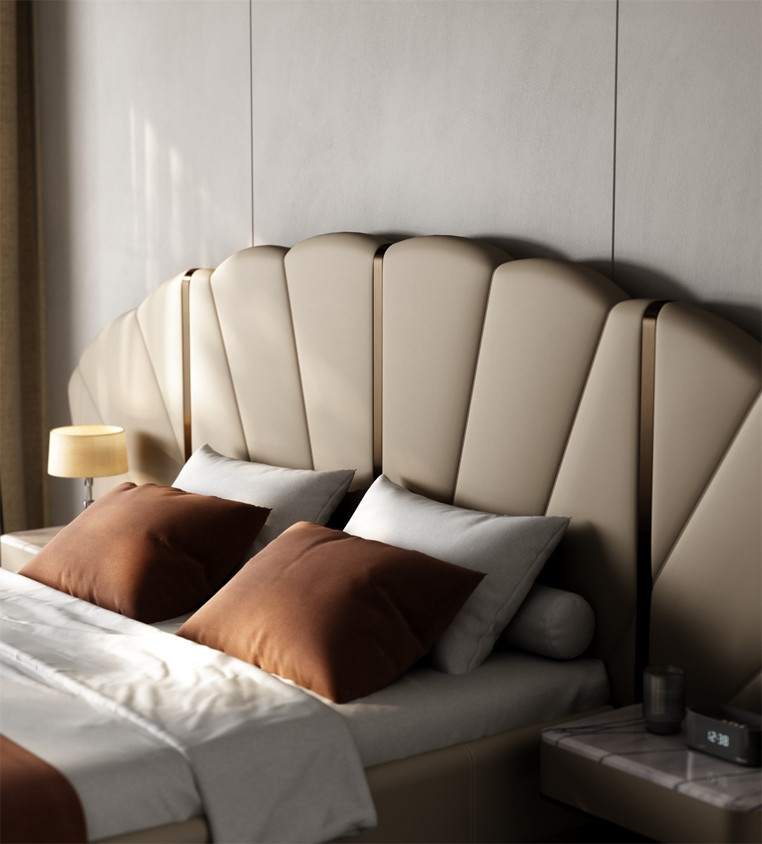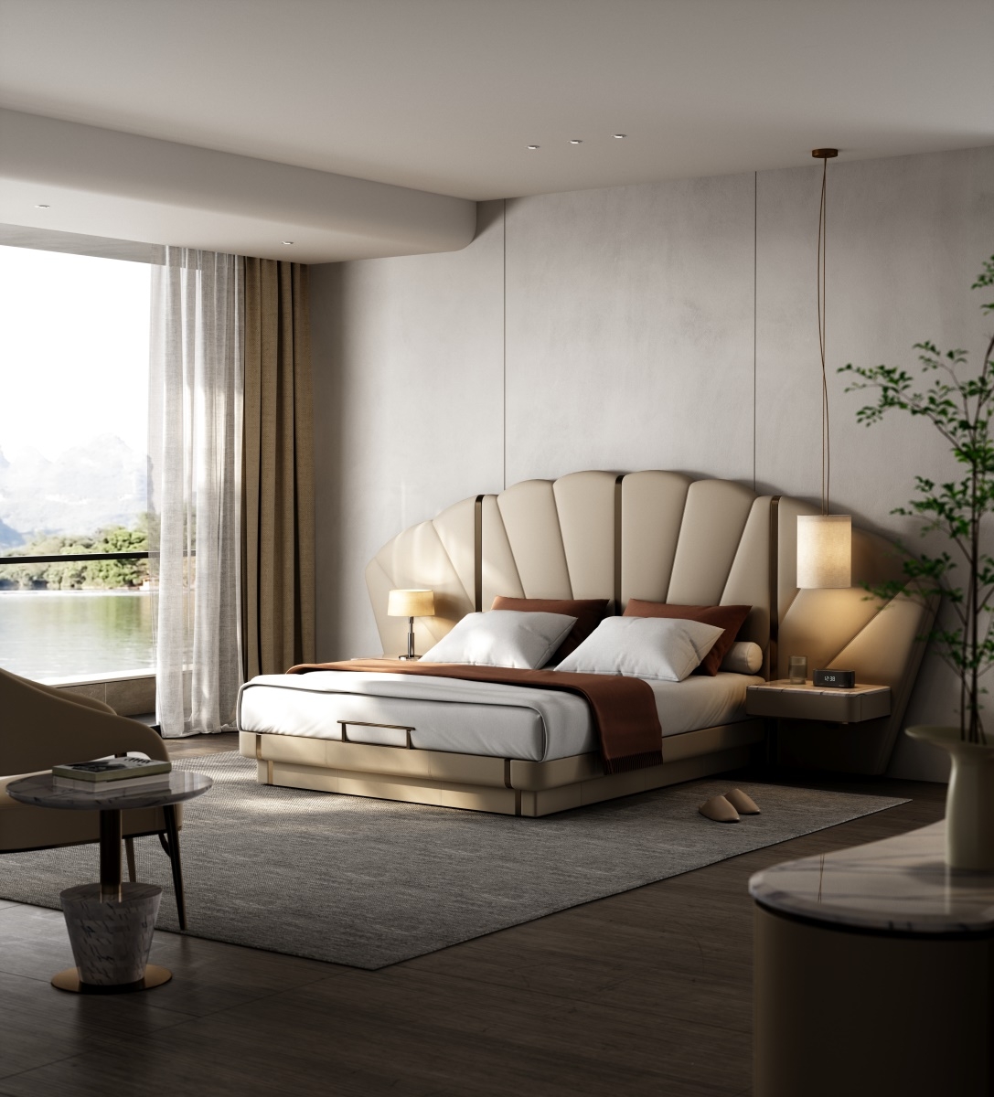 Inspired by the deep sea, it contains all kinds of things in the world, simulating the shape of shells or extracting the beauty of inner lines, interpreting luxury and elegance with modern design.Iconic Shell - Inspired Headboard: Features a sculptural, fan - shaped headboard with soft curves and vertical tufting. The neutral beige tone and metallic accents create a glamorous, hotel - worthy look—perfect for elevating any bedroom into a luxury retreat.