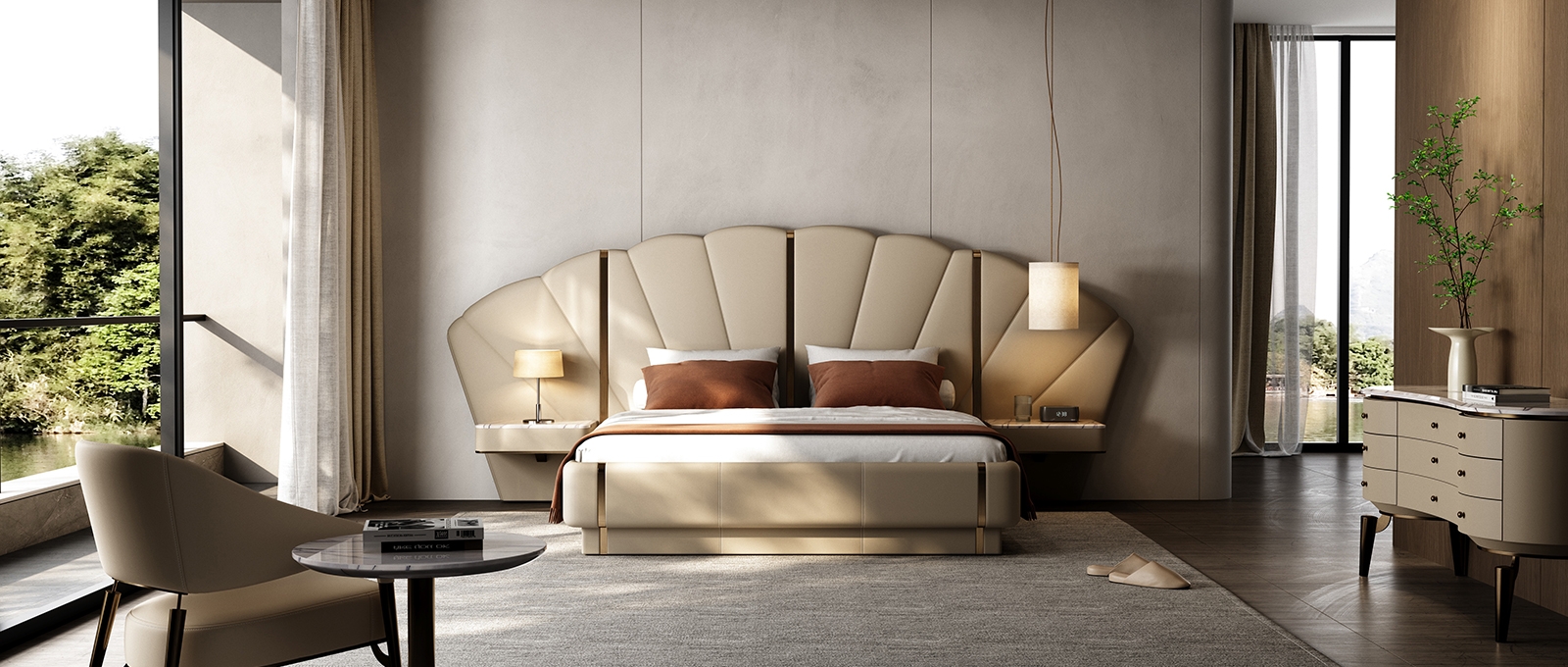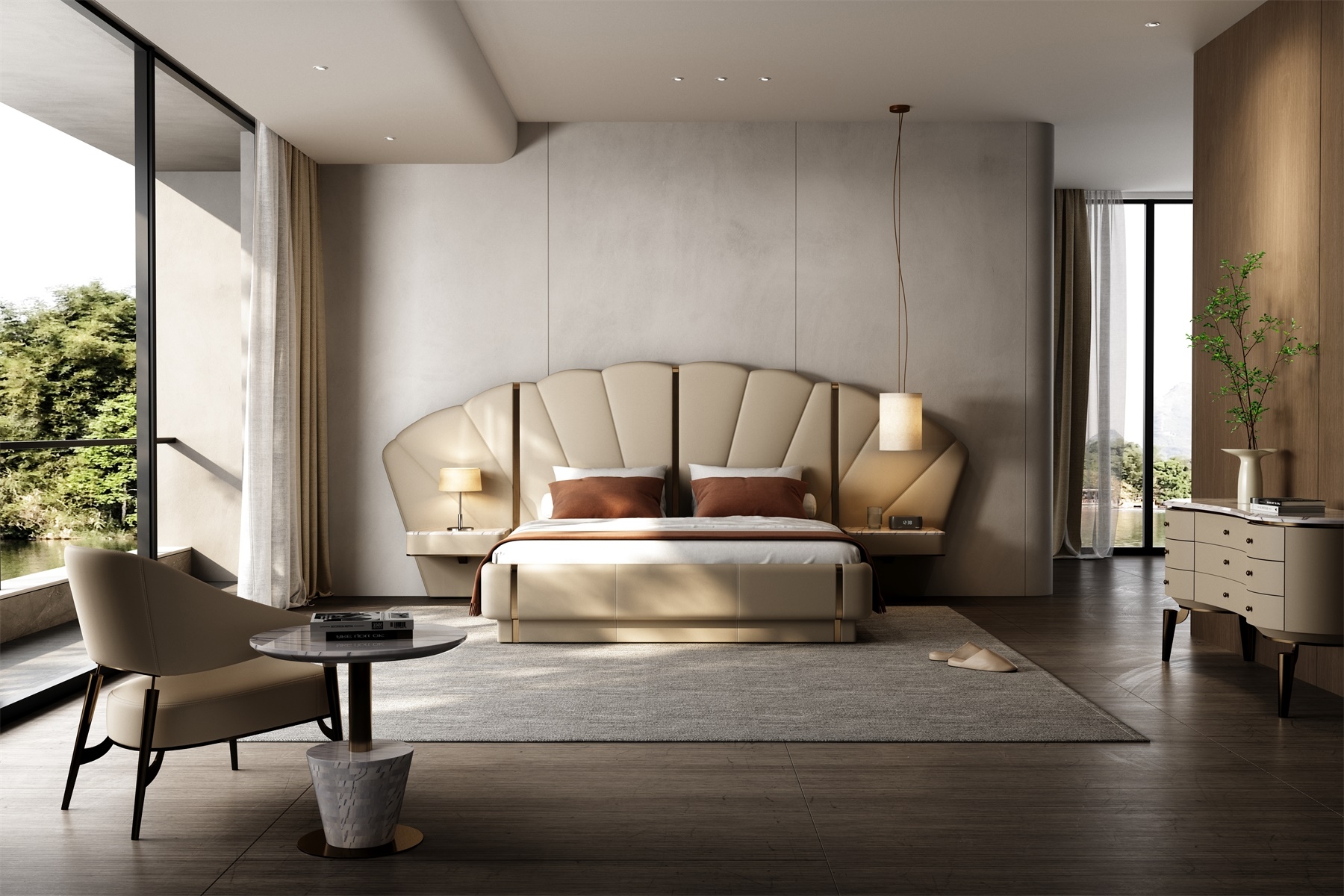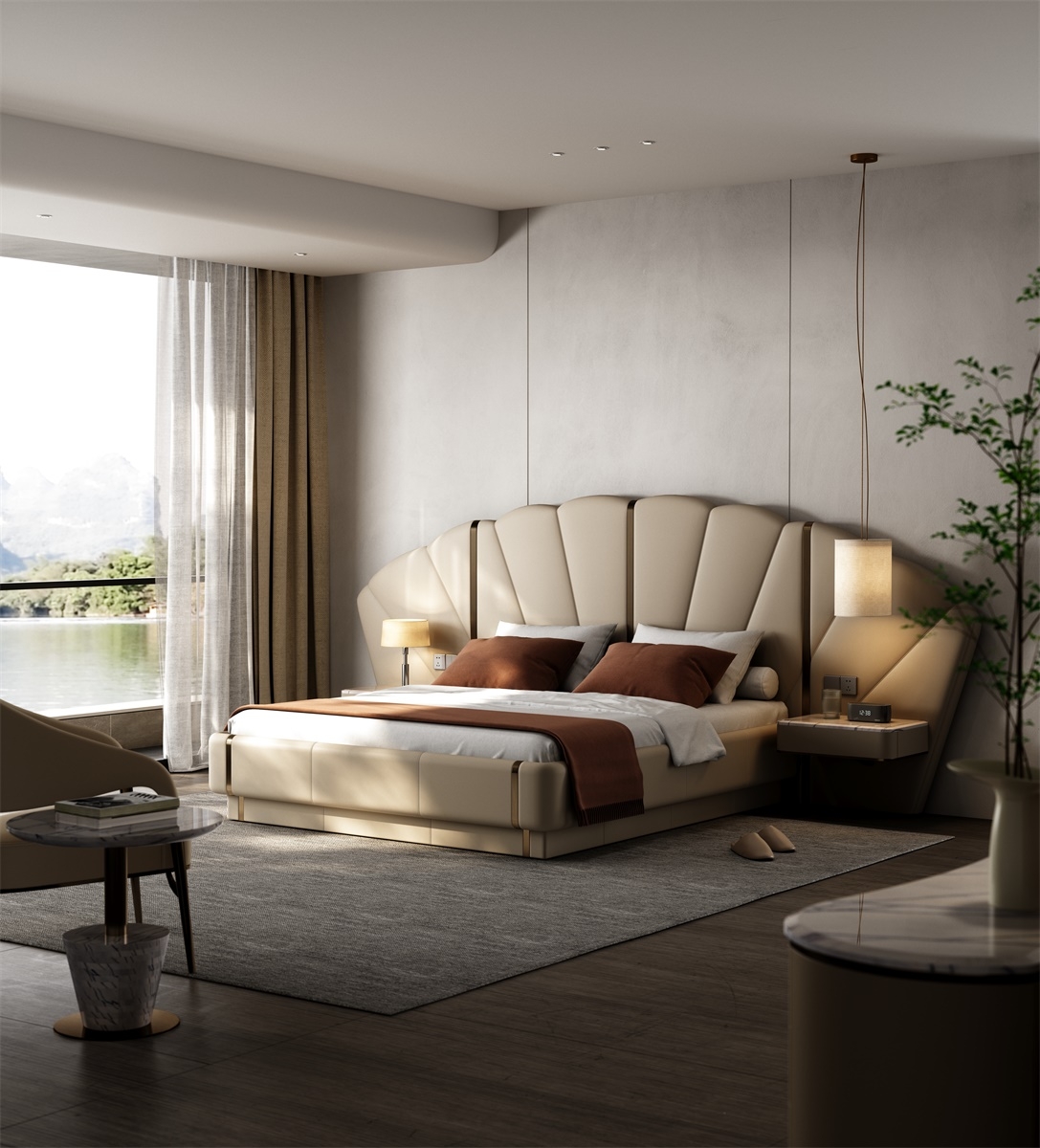 Inspired by the deep sea, it contains all kinds of things in the world, simulating the shape of shells or extracting the beauty of inner lines, interpreting luxury and elegance with modern design.Iconic Shell - Inspired Headboard: Features a sculptural, fan - shaped headboard with soft curves and vertical tufting. The neutral beige tone and metallic accents create a glamorous, hotel - worthy look—perfect for elevating any bedroom into a luxury retreat.