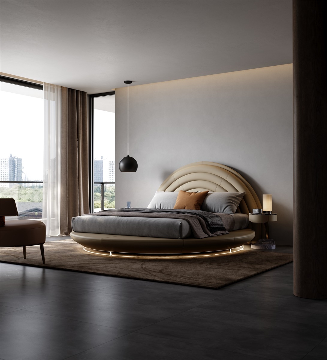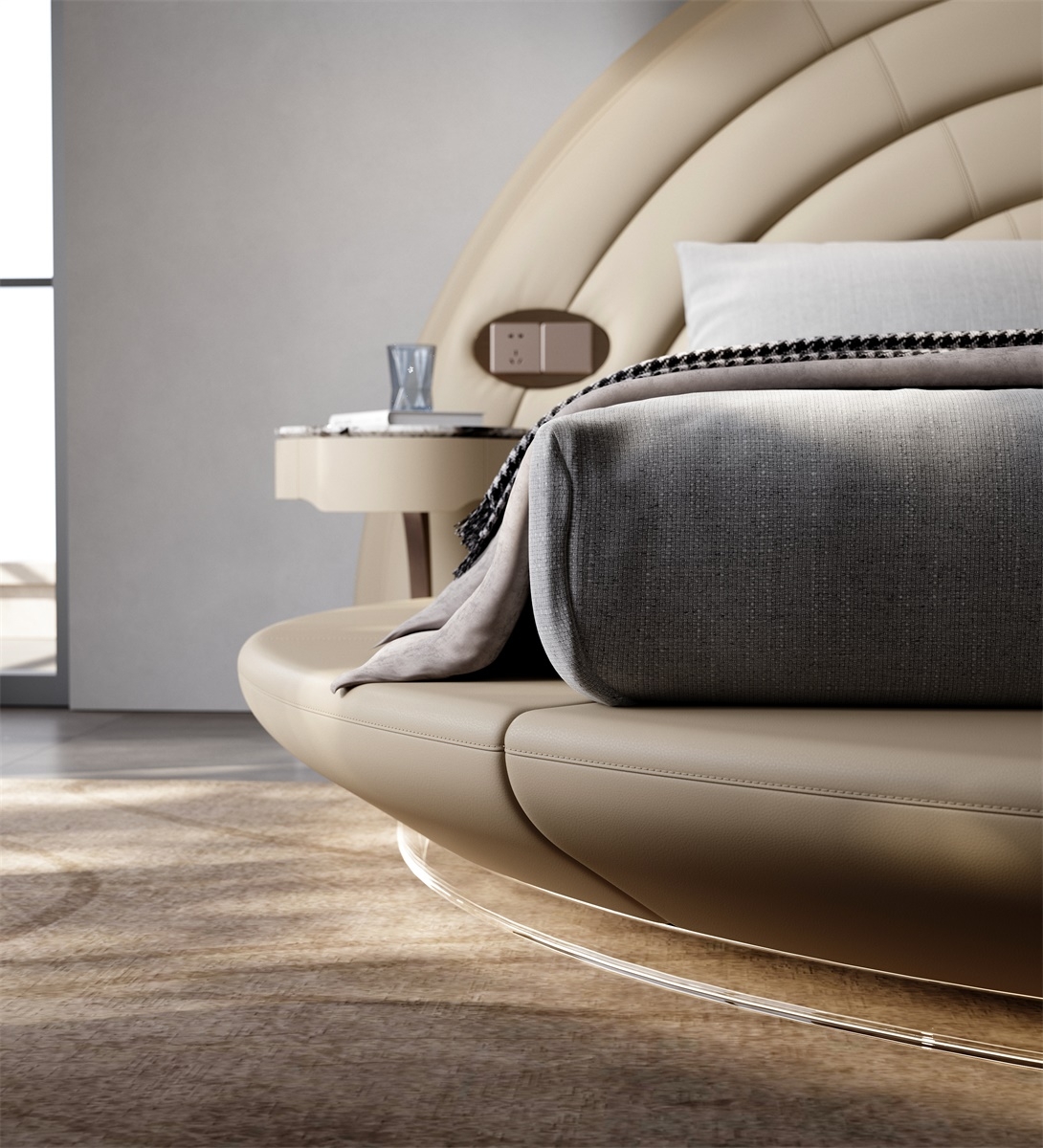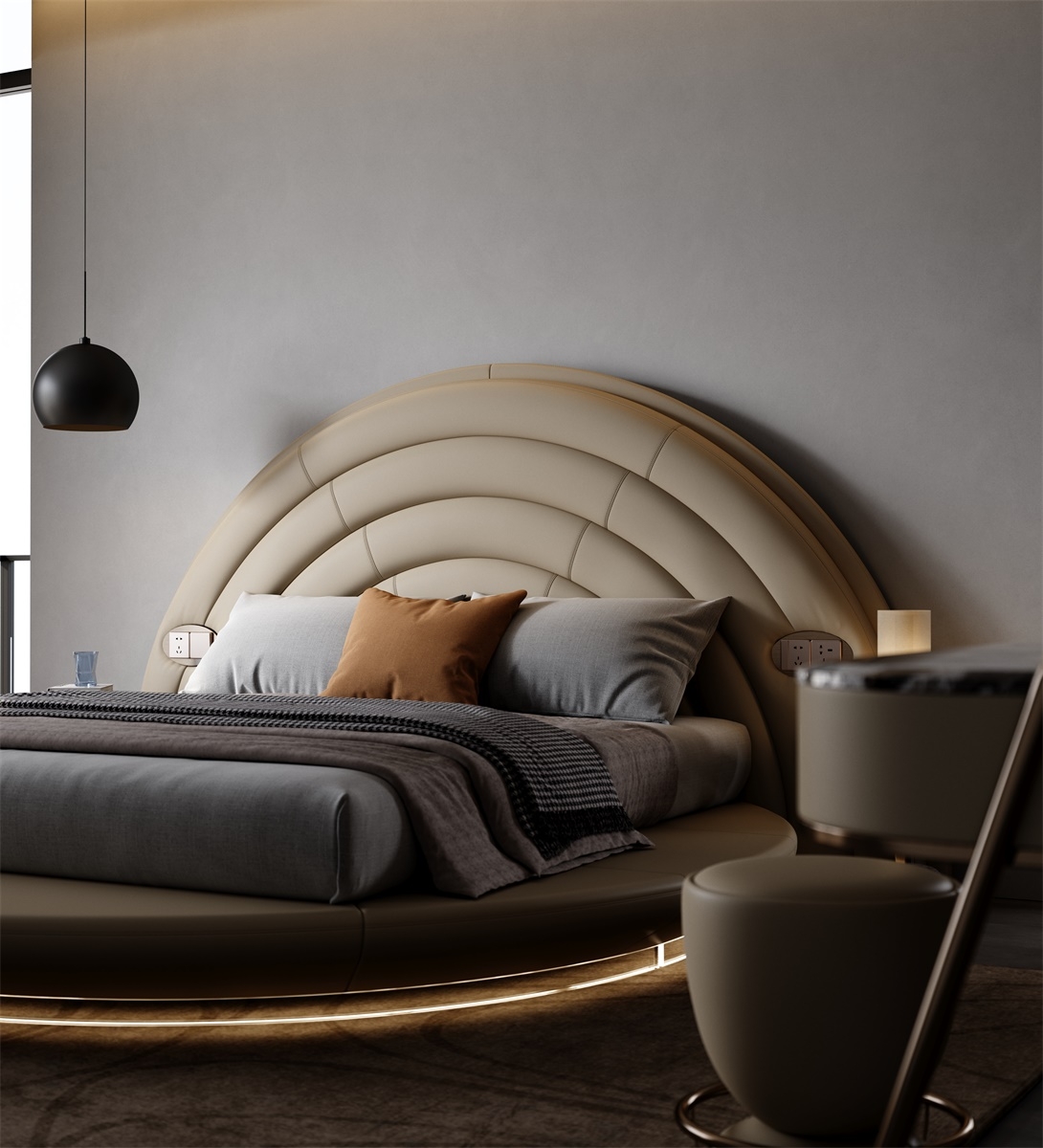 The comfort of life doesn't have to worry about any shortcomings. Only by adhering to the perfection of the soul can one become free and unrestrained. The road of life is long, and we will eventually seek the path of a fulfilling life.Features a sculptural, half - moon headboard and circular base. The neutral beige upholstery, combined with metallic accents and a glowing base, creates a futuristic, hotel - worthy ambiance—perfect for transforming bedrooms into luxury retreats.