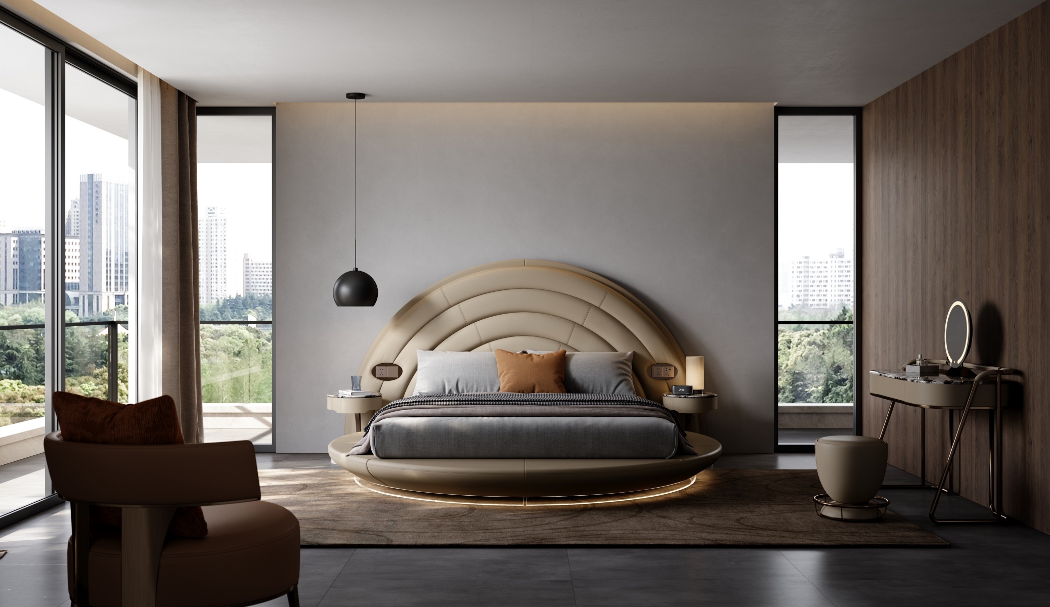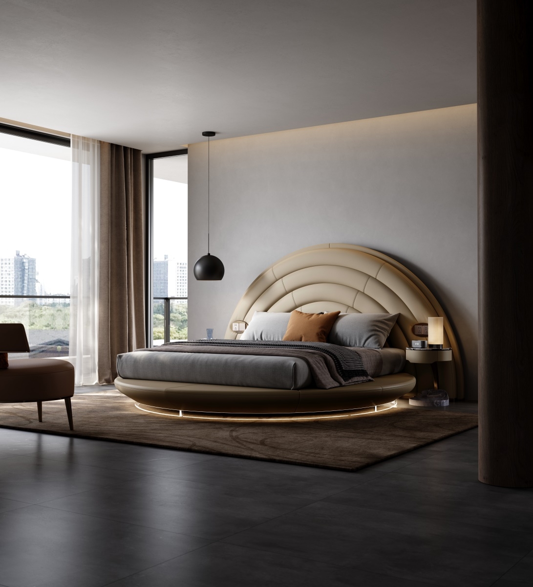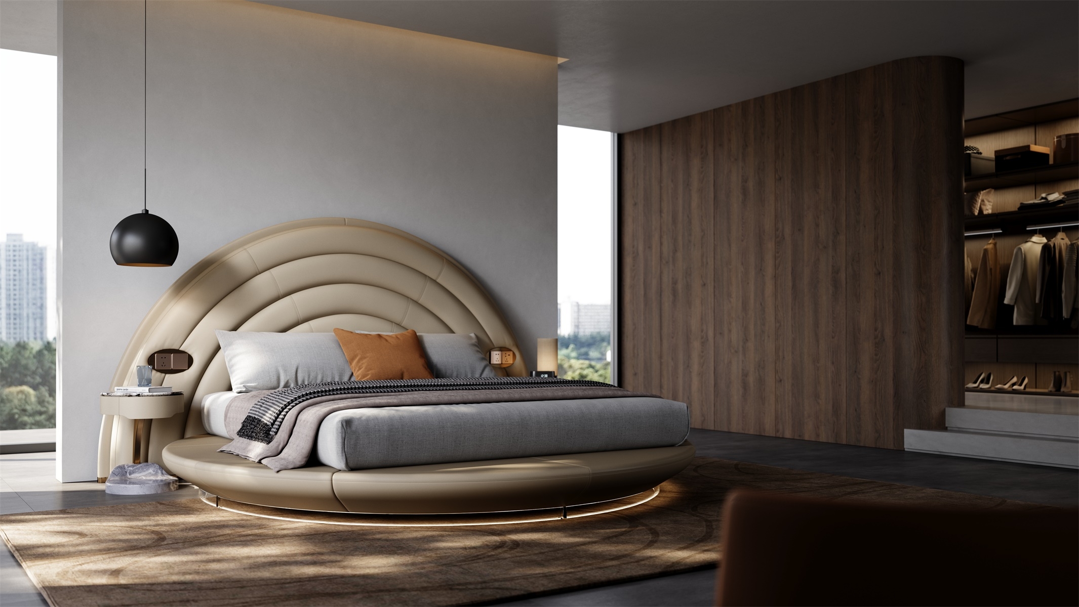The comfort of life doesn't have to worry about any shortcomings. Only by adhering to the perfection of the soul can one become free and unrestrained. The road of life is long, and we will eventually seek the path of a fulfilling life.Features a sculptural, half - moon headboard and circular base. The neutral beige upholstery, combined with metallic accents and a glowing base, creates a futuristic, hotel - worthy ambiance—perfect for transforming bedrooms into luxury retreats.