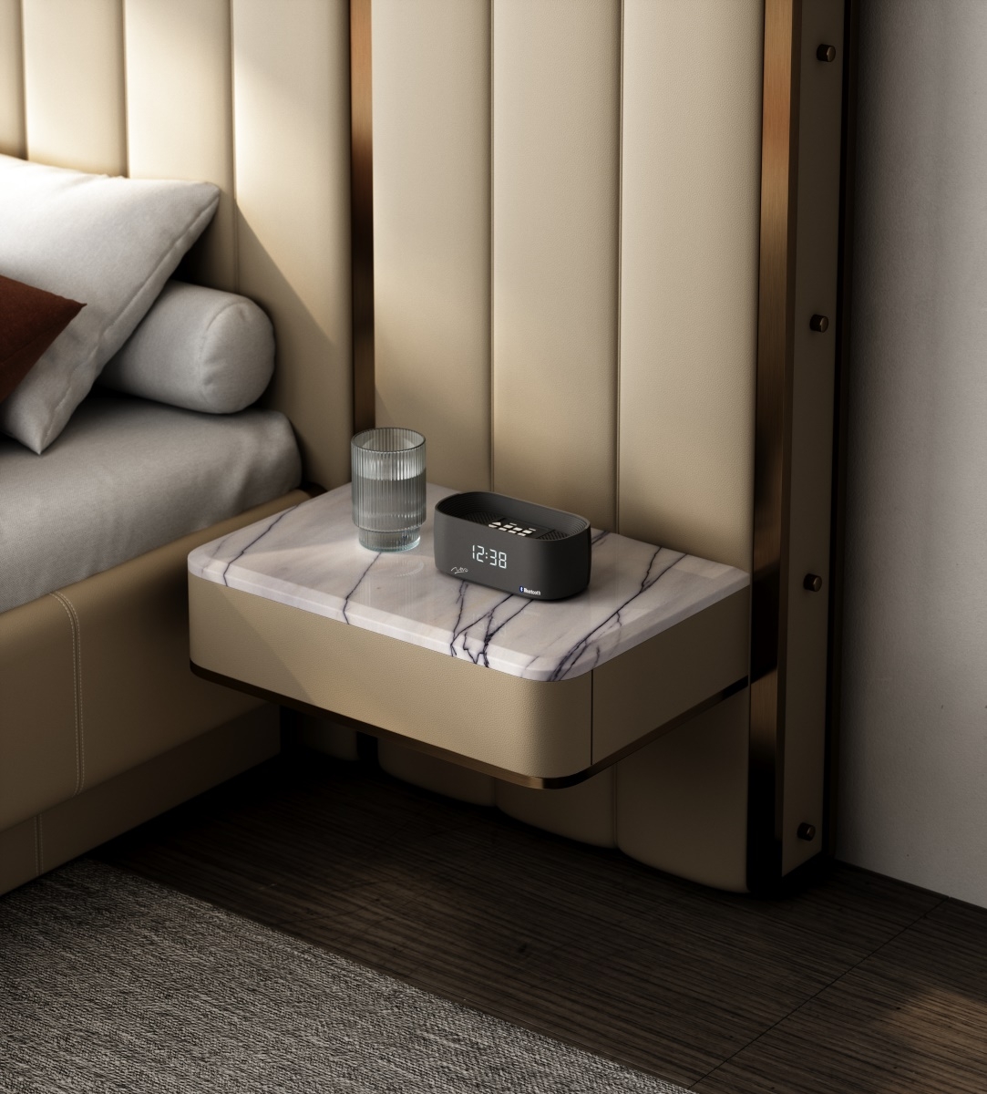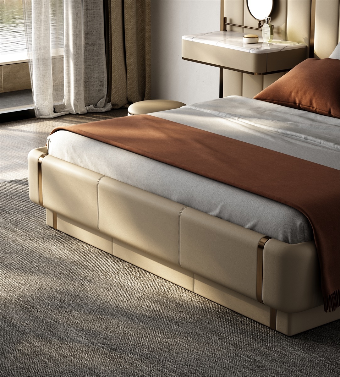 The design of relative symmetry adds stability and symmetrical beauty to the product; The soft bag headboard, which combines leather and metal, not only continues the modern luxury aesthetics, but also ensures a comfortable and practical experience.