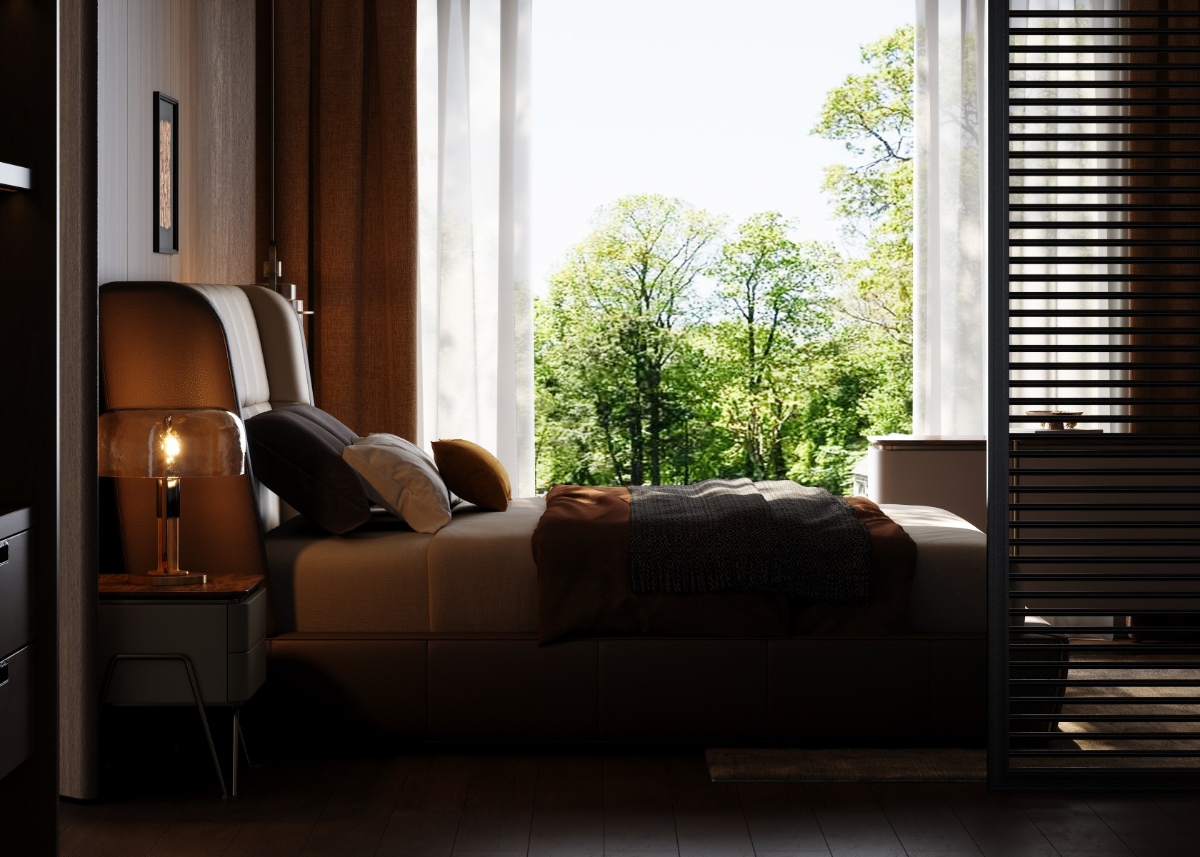 Built-in drawers create storage space, combining storage function with oriental design aesthetics.