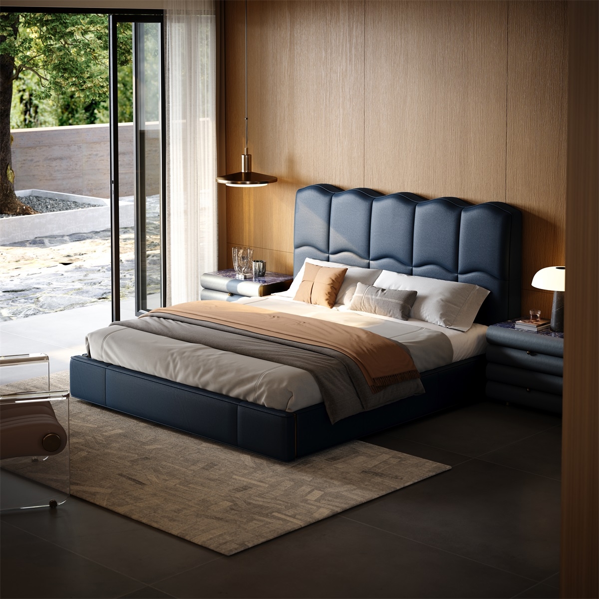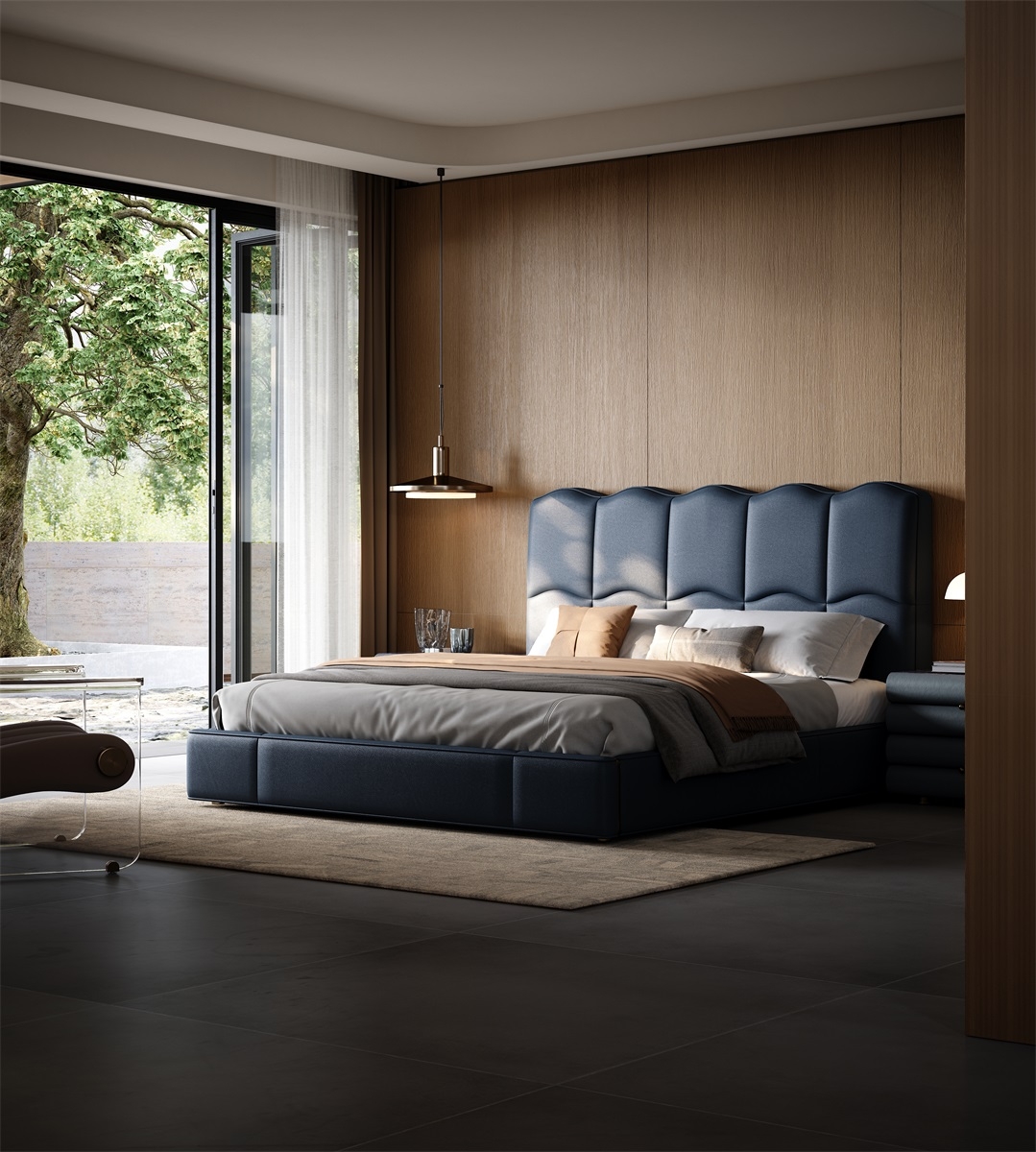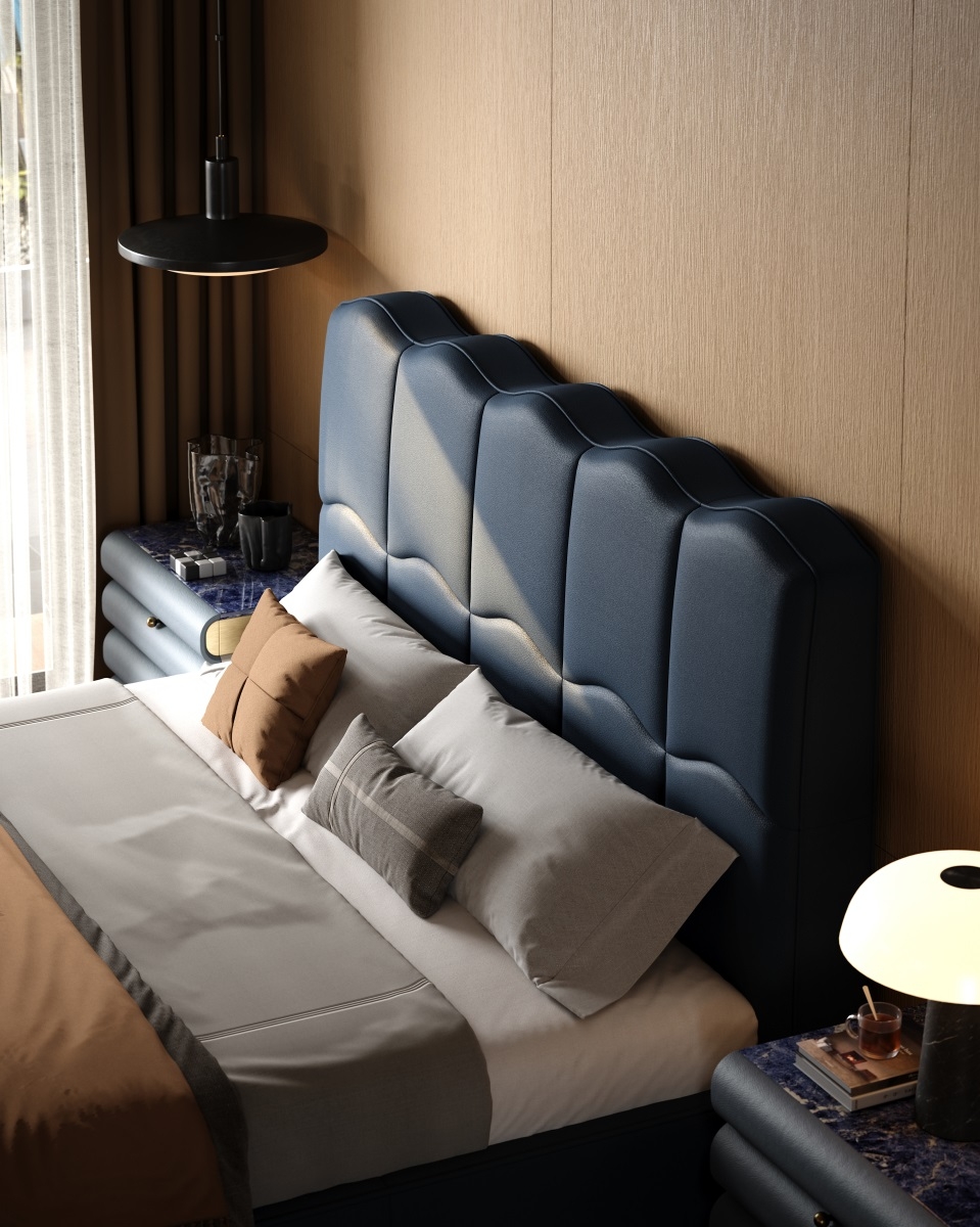 Taking the stretching form of ocean waves, the wavy high backrest of the bed has lines as dynamic as the tides.