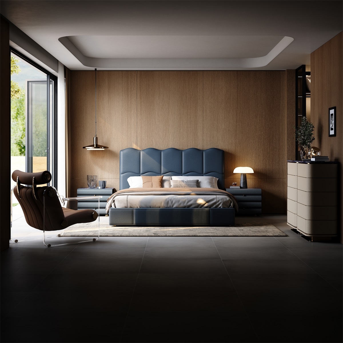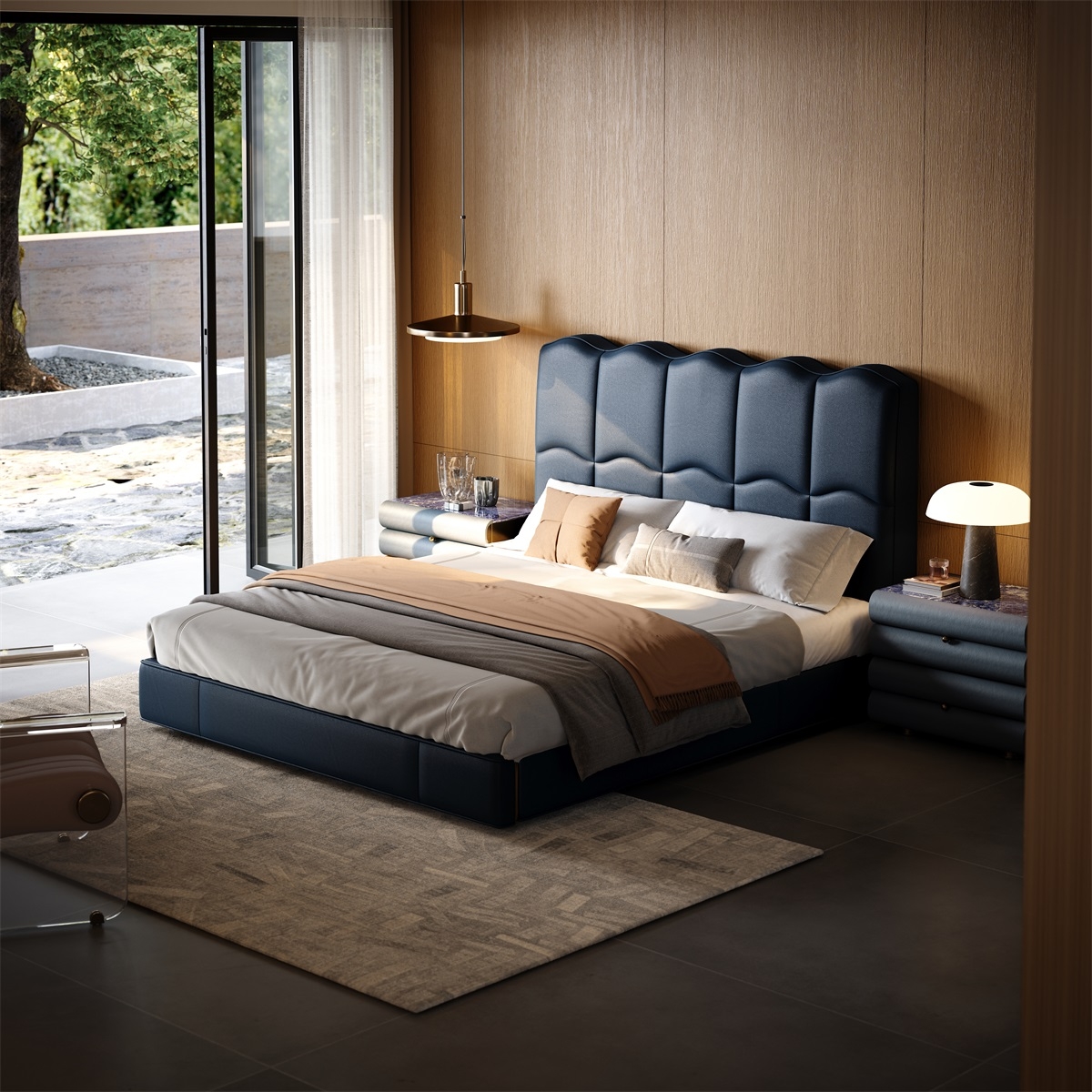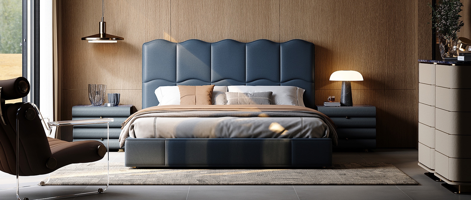 Taking the stretching form of ocean waves, the wavy high backrest of the bed has lines as dynamic as the tides.
