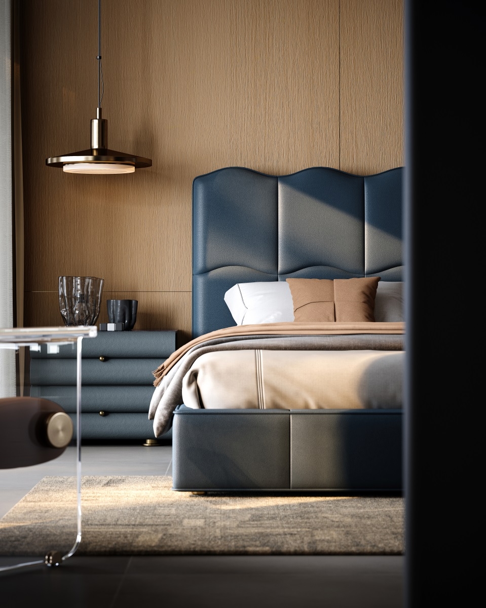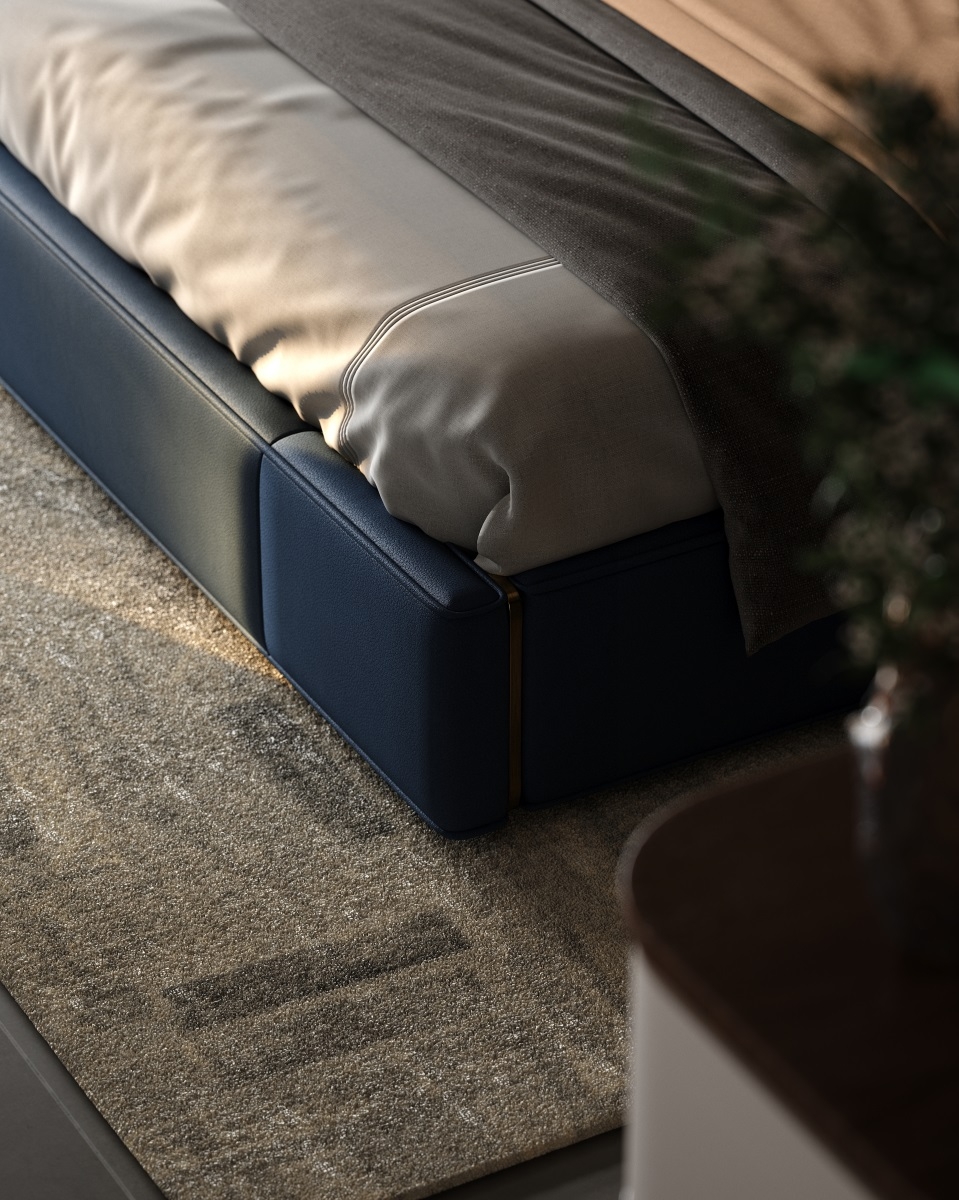 Upholstered in selected genuine leather, the deep sea blue tone is composed and elegant. The plush soft
