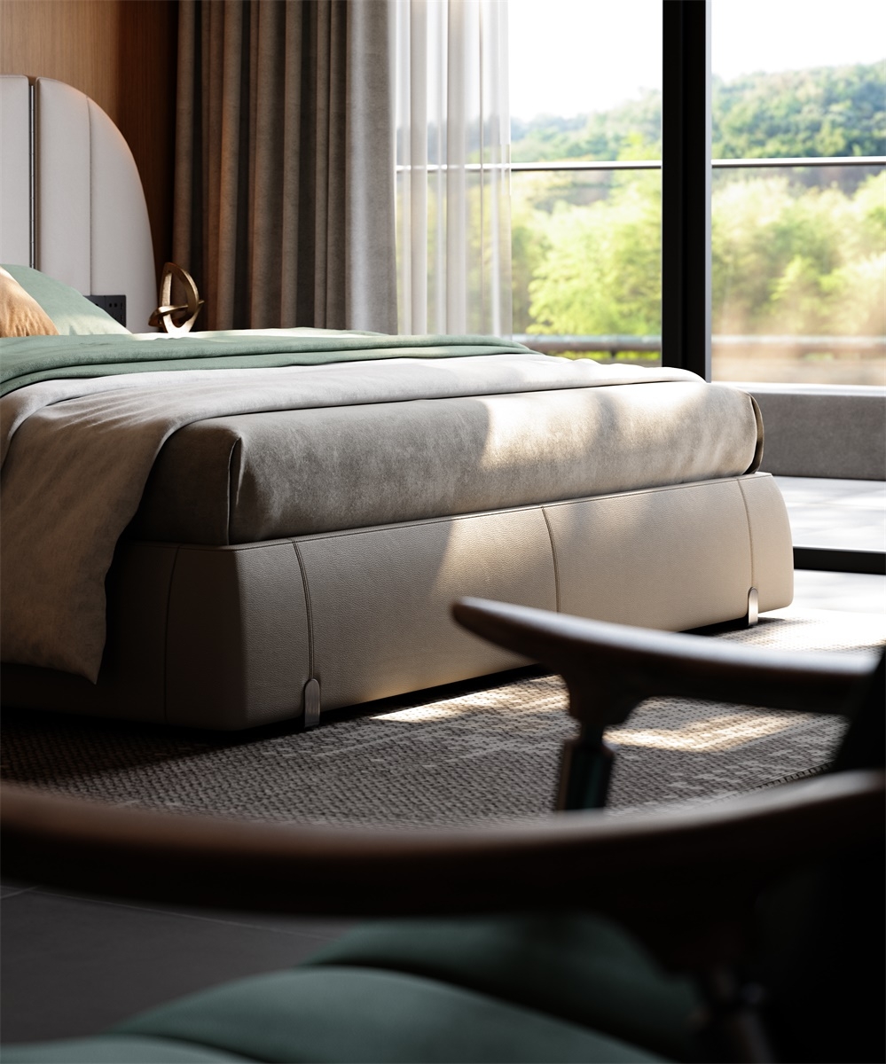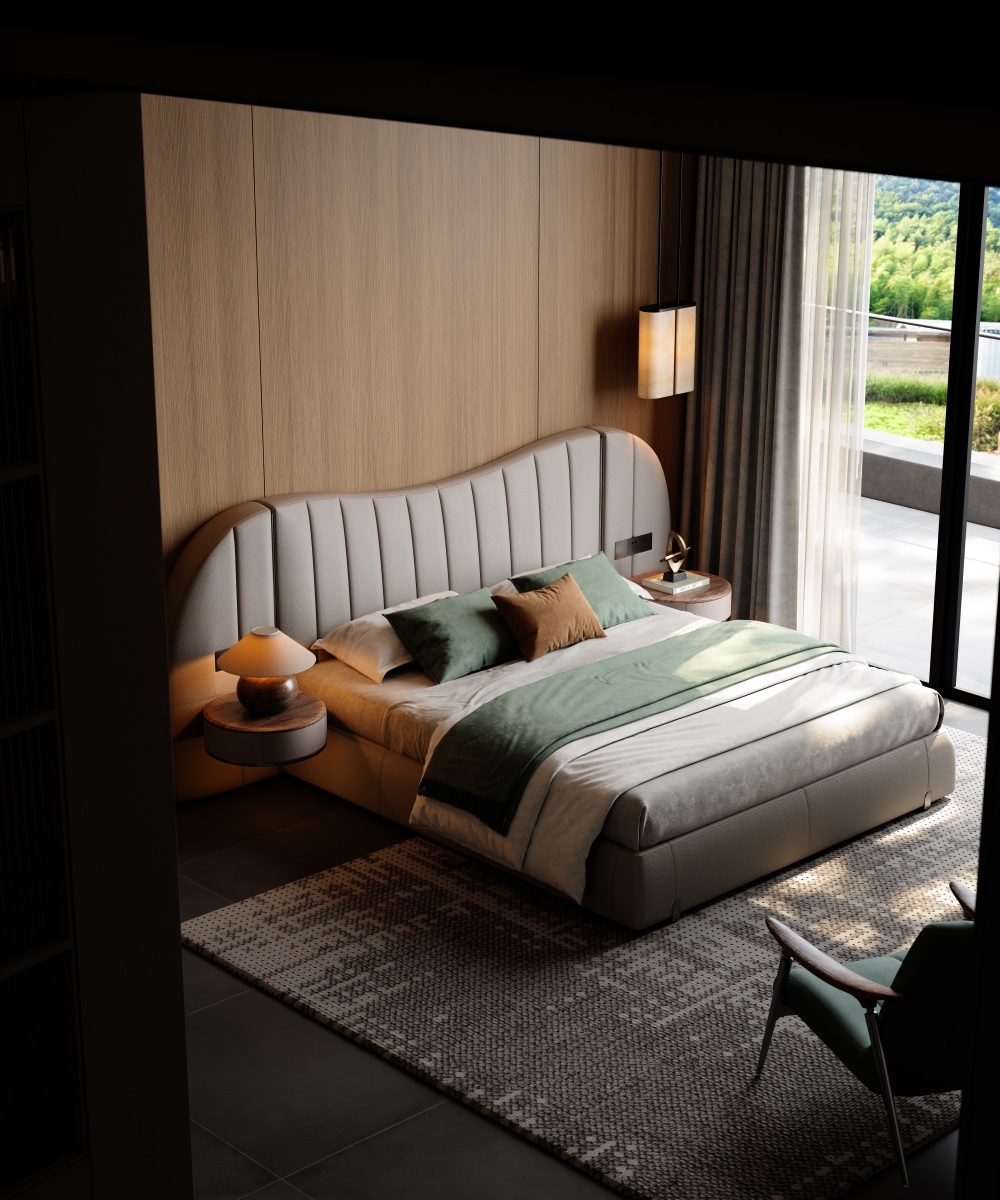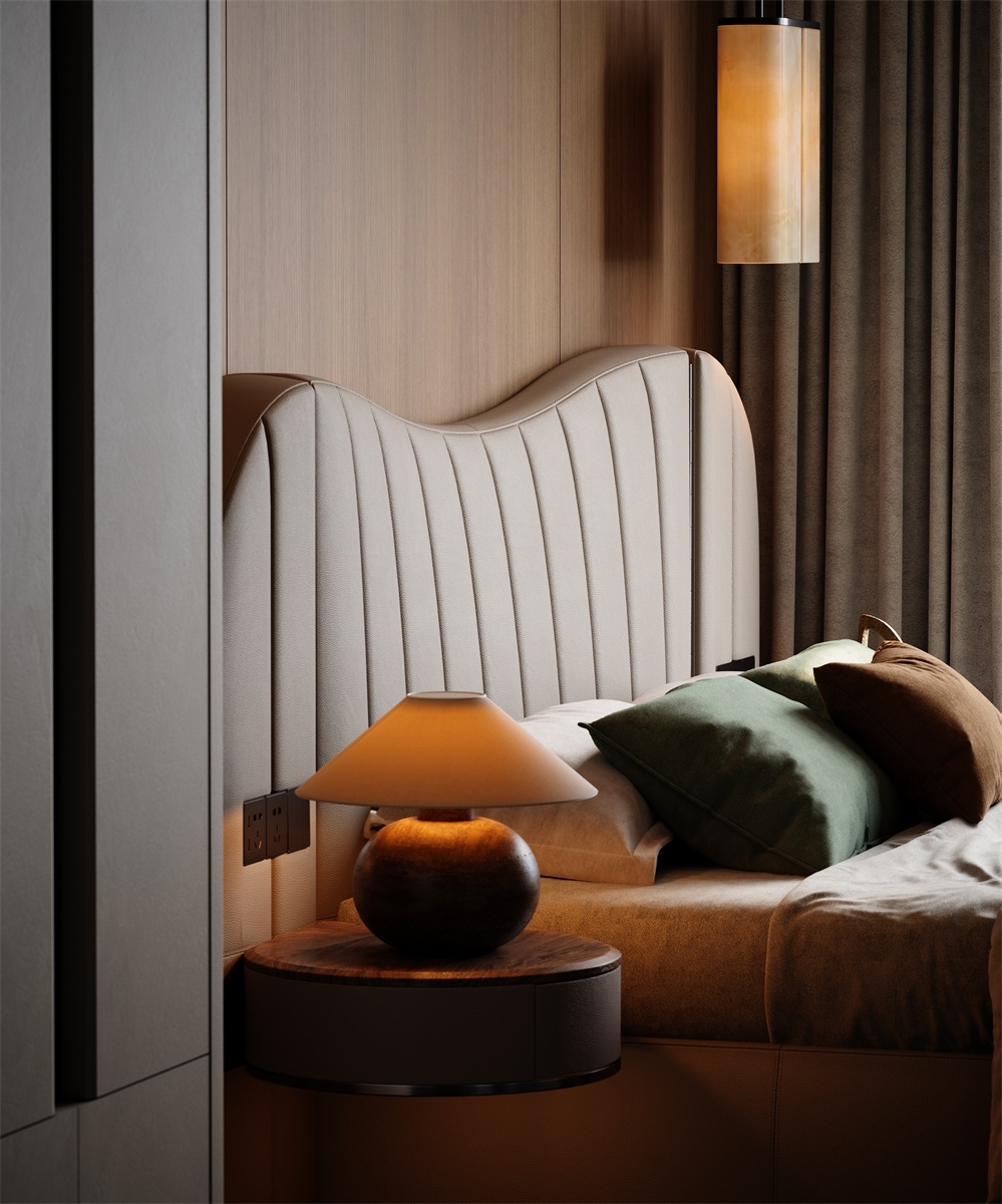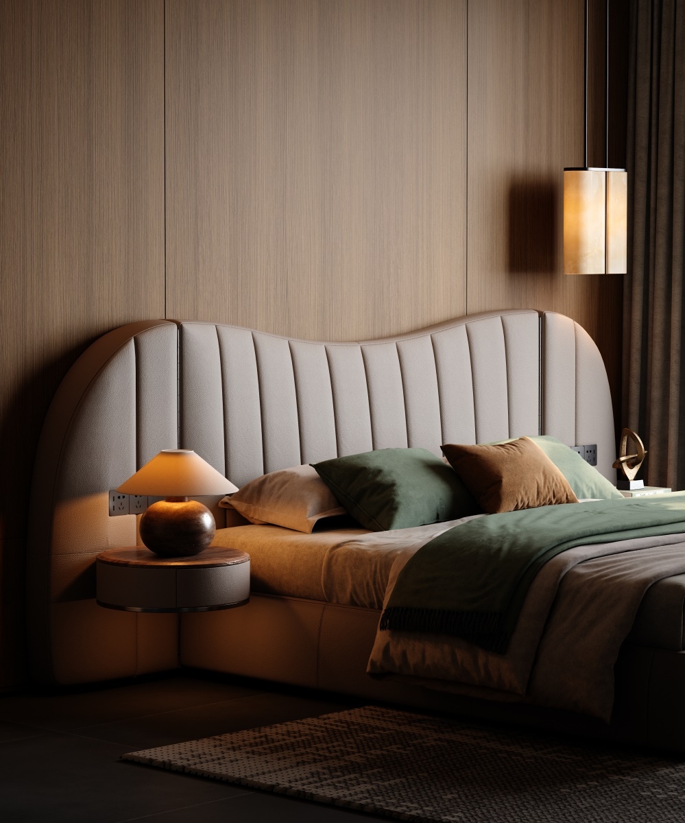 The bed screen, standing tall like a mountain, brings a full visual focus and a strong aura to the bed. The integrated design of the bedside table solves the problem of matching single items and maintains the luxurious tone of modern style.