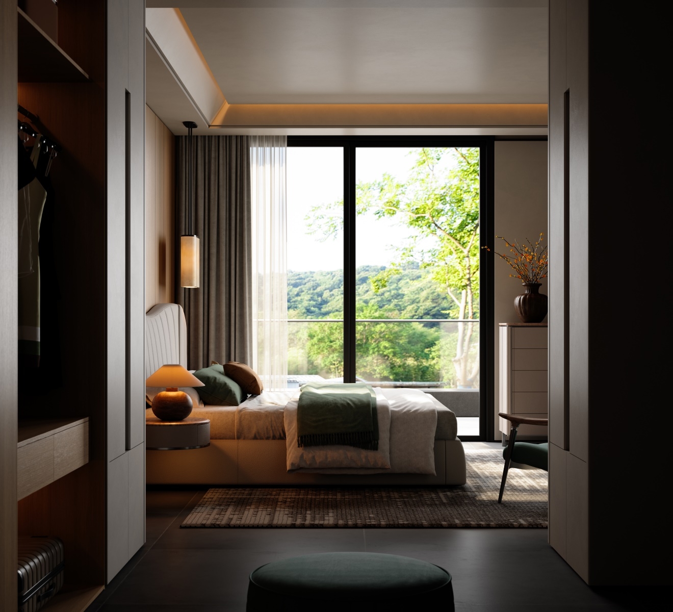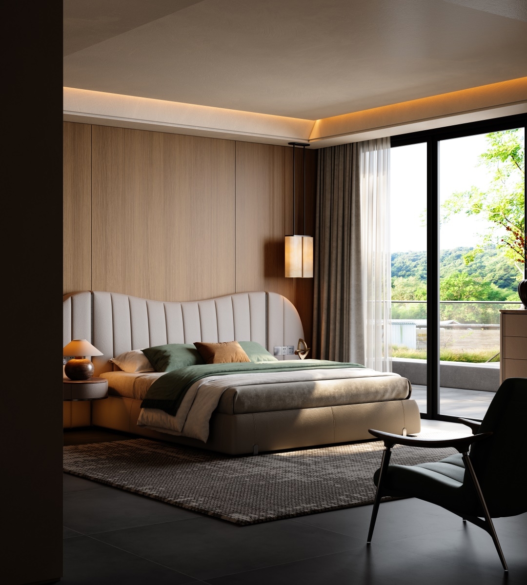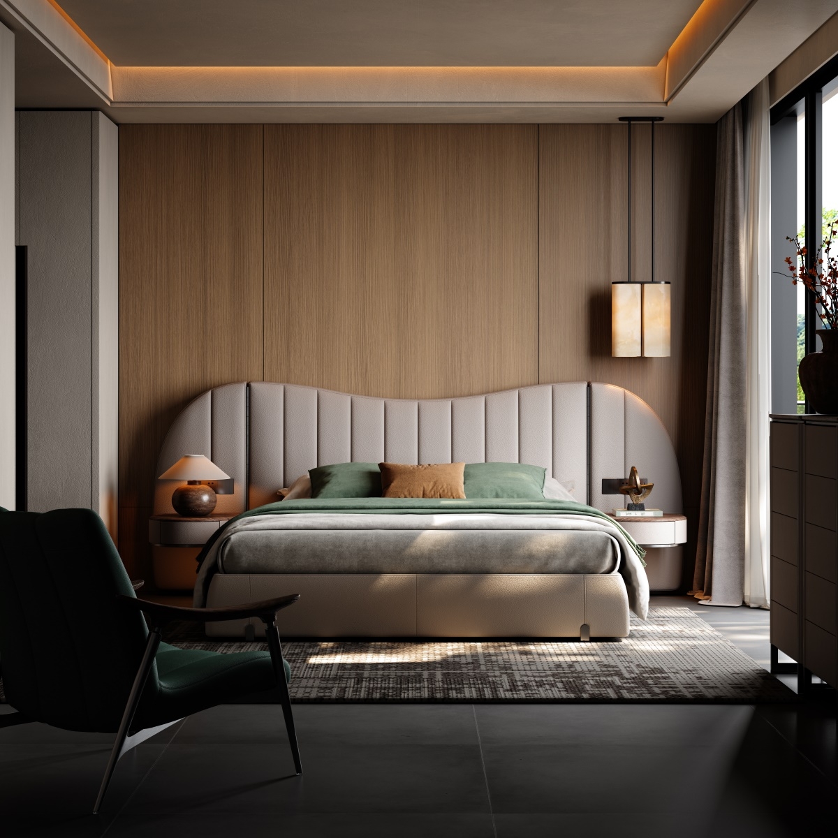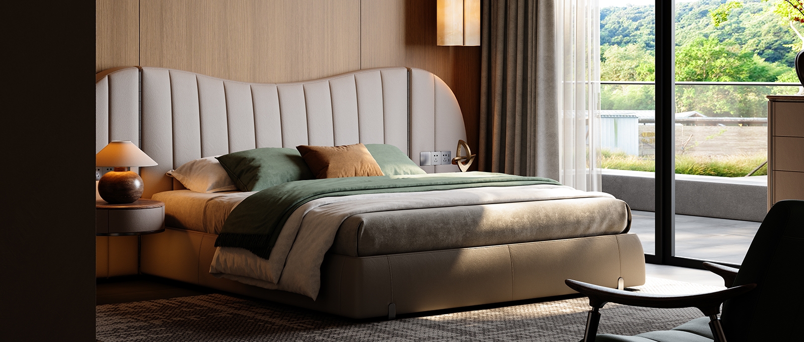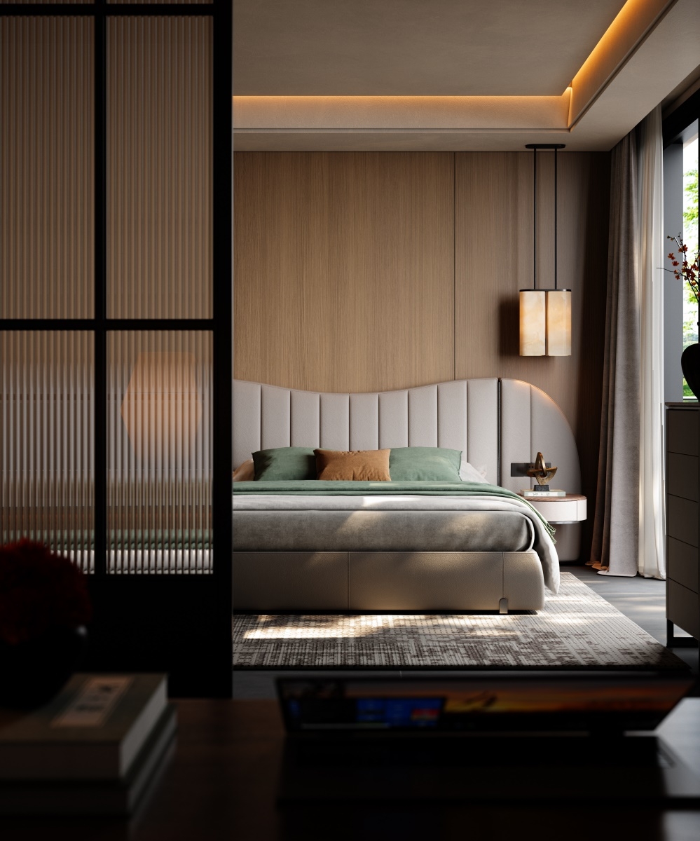 The bed screen, standing tall like a mountain, brings a full visual focus and a strong aura to the bed. The integrated design of the bedside table solves the problem of matching single items and maintains the luxurious tone of modern style.