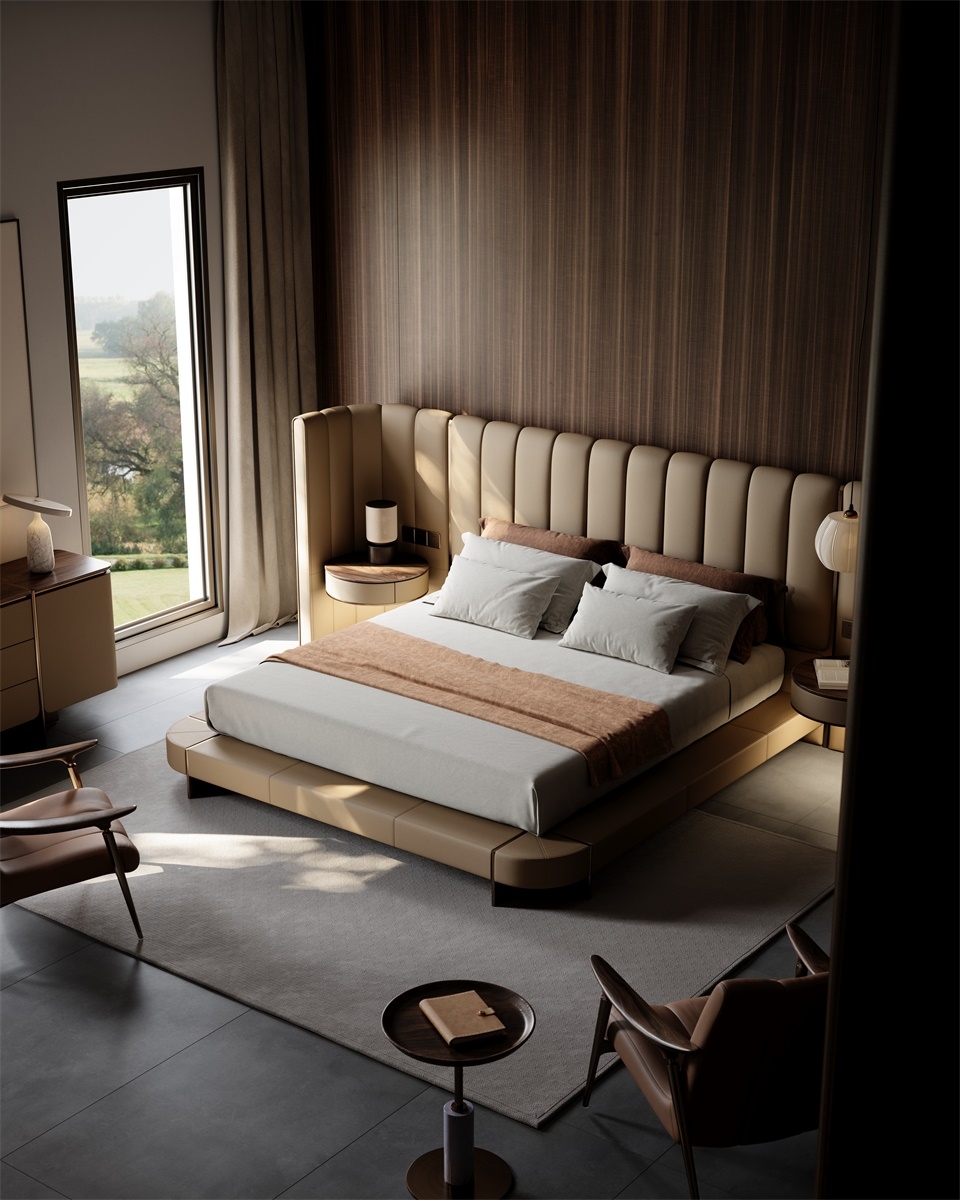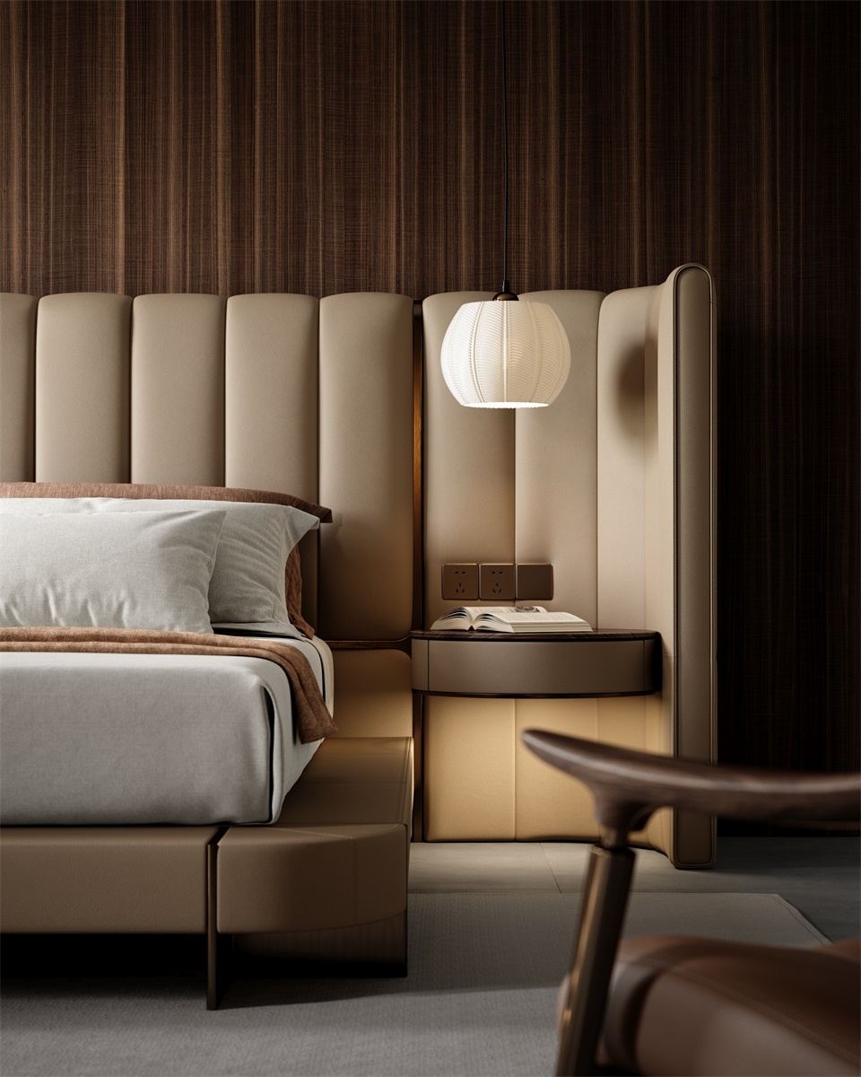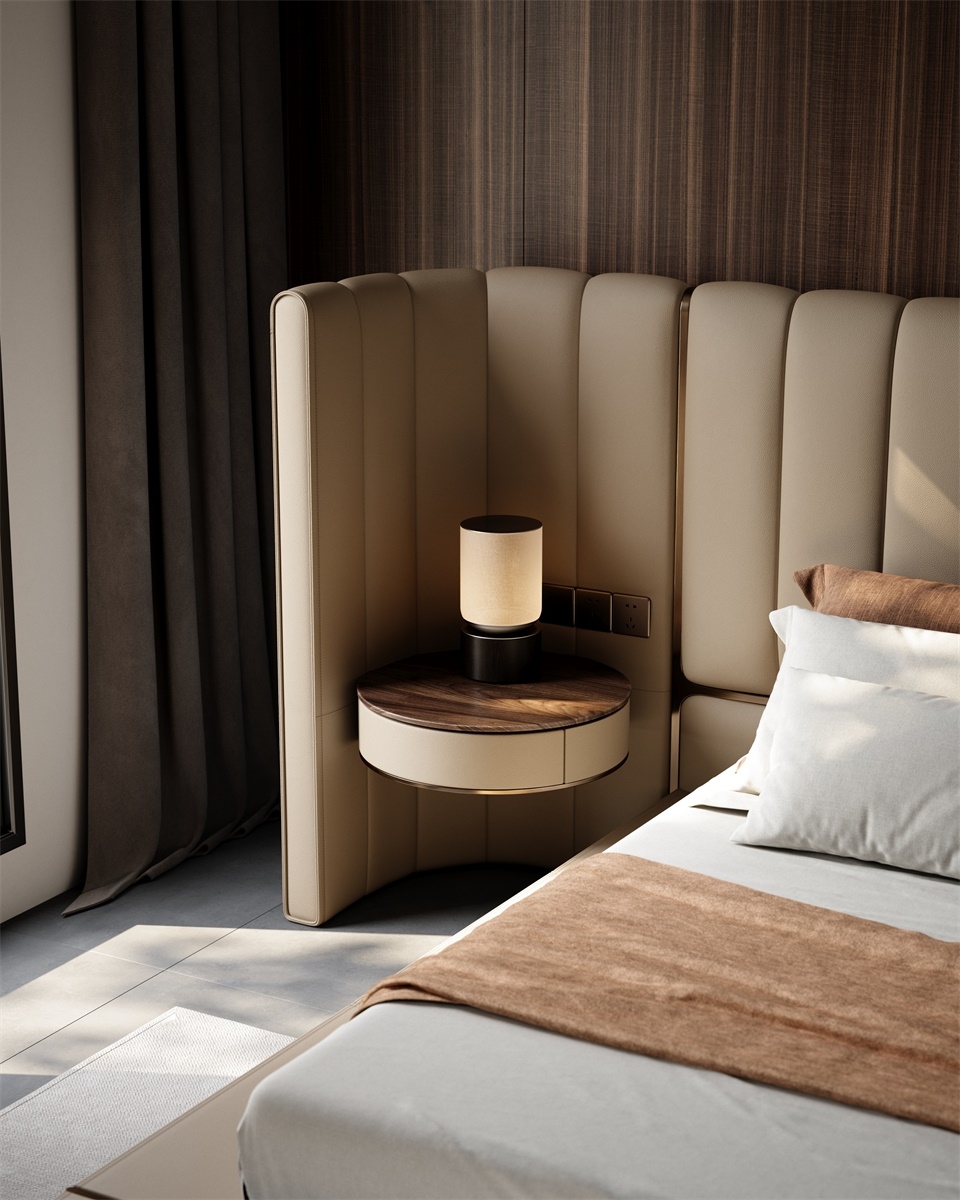 The curved bed screen adds layers to the bed background and collides with the walnut colored bedside table finish, creating a safe and comfortable sense of privacy. The two sides can be opened or closed freely, allowing for flexible adjustment of the spatial layout.