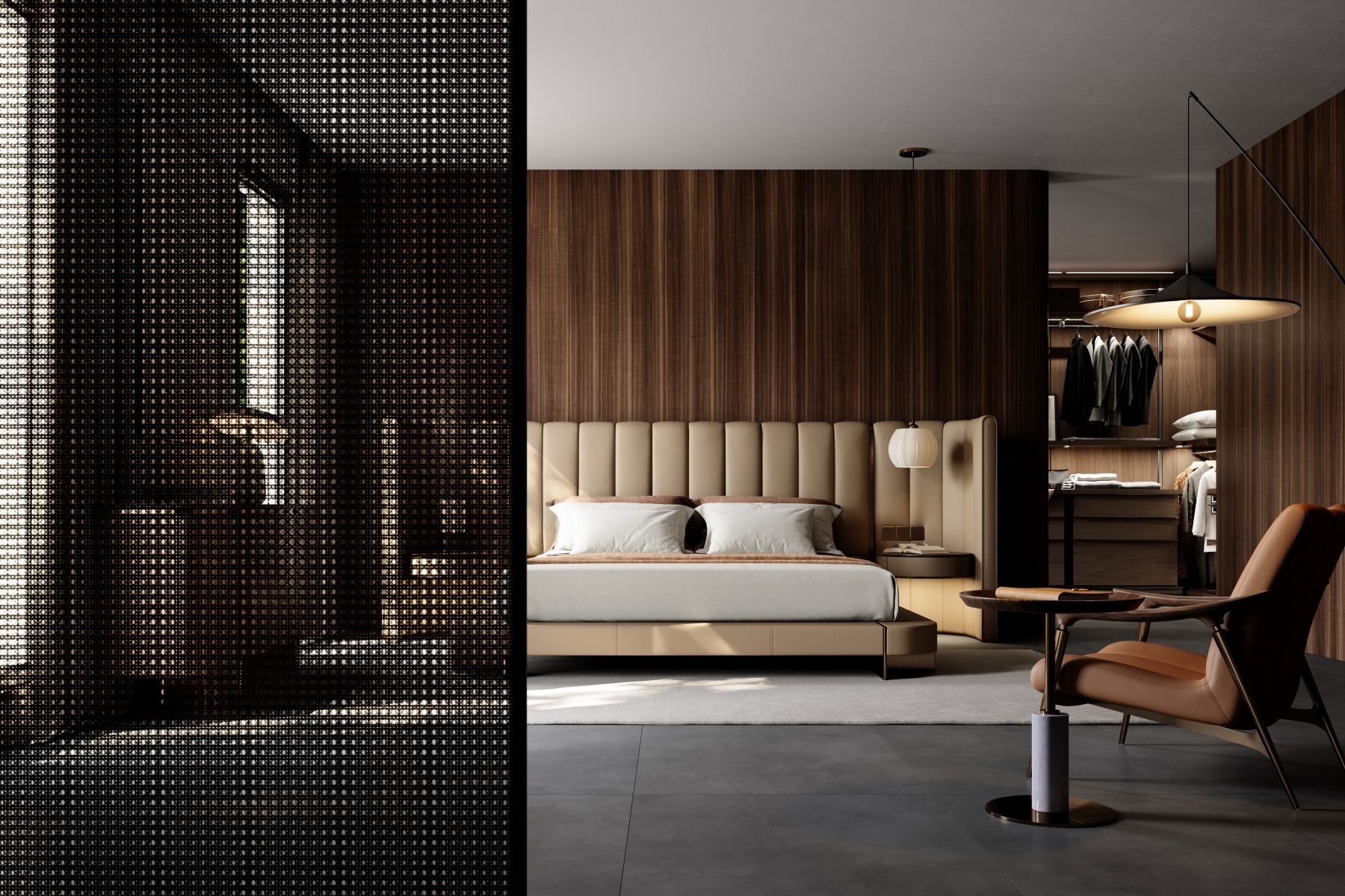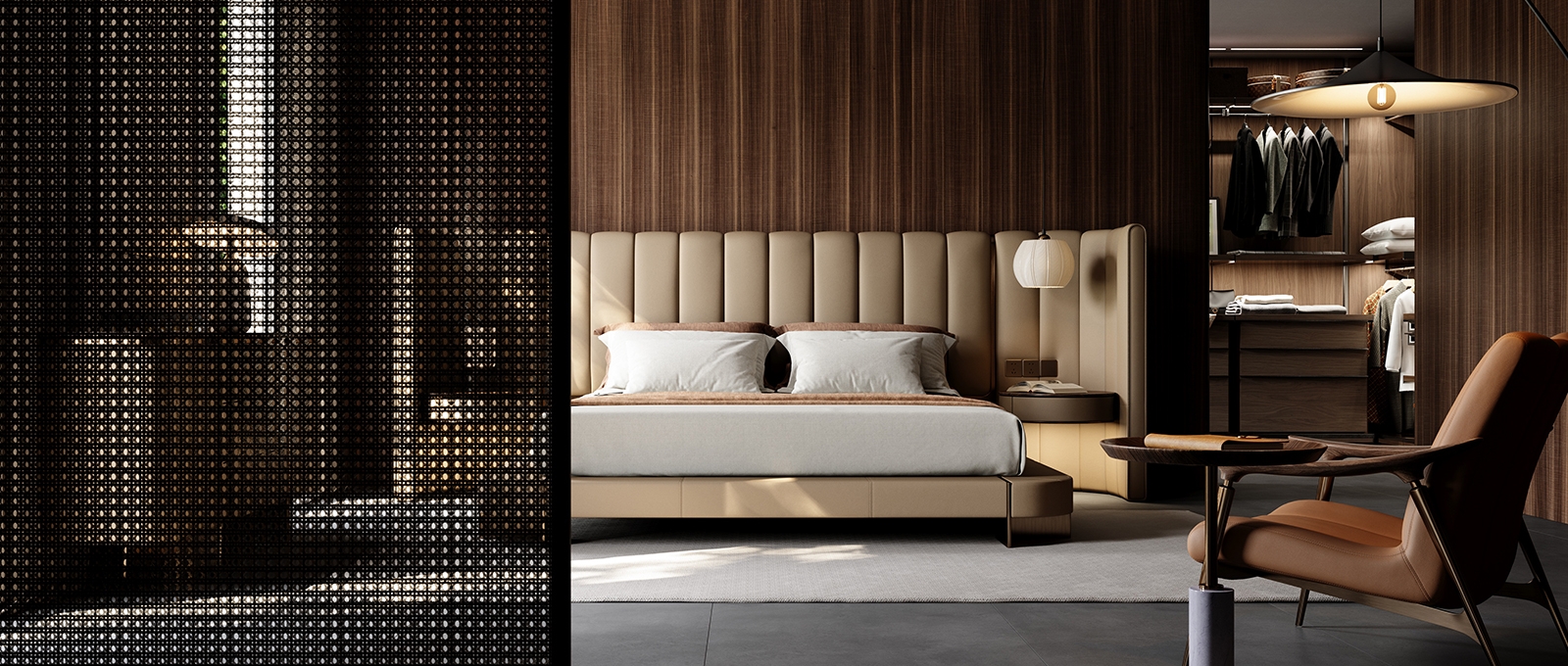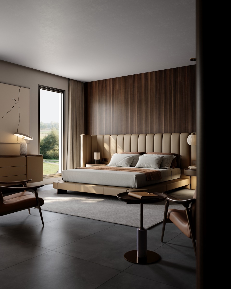 The curved bed screen adds layers to the bed background and collides with the walnut colored bedside table finish, creating a safe and comfortable sense of privacy. The two sides can be opened or closed freely, allowing for flexible adjustment of the spatial layout.