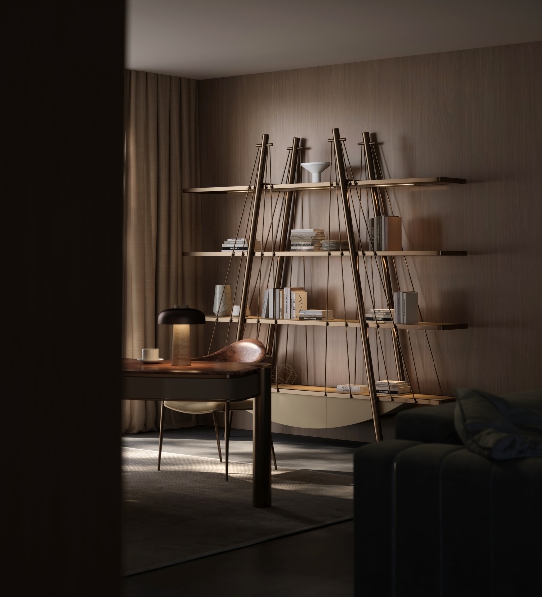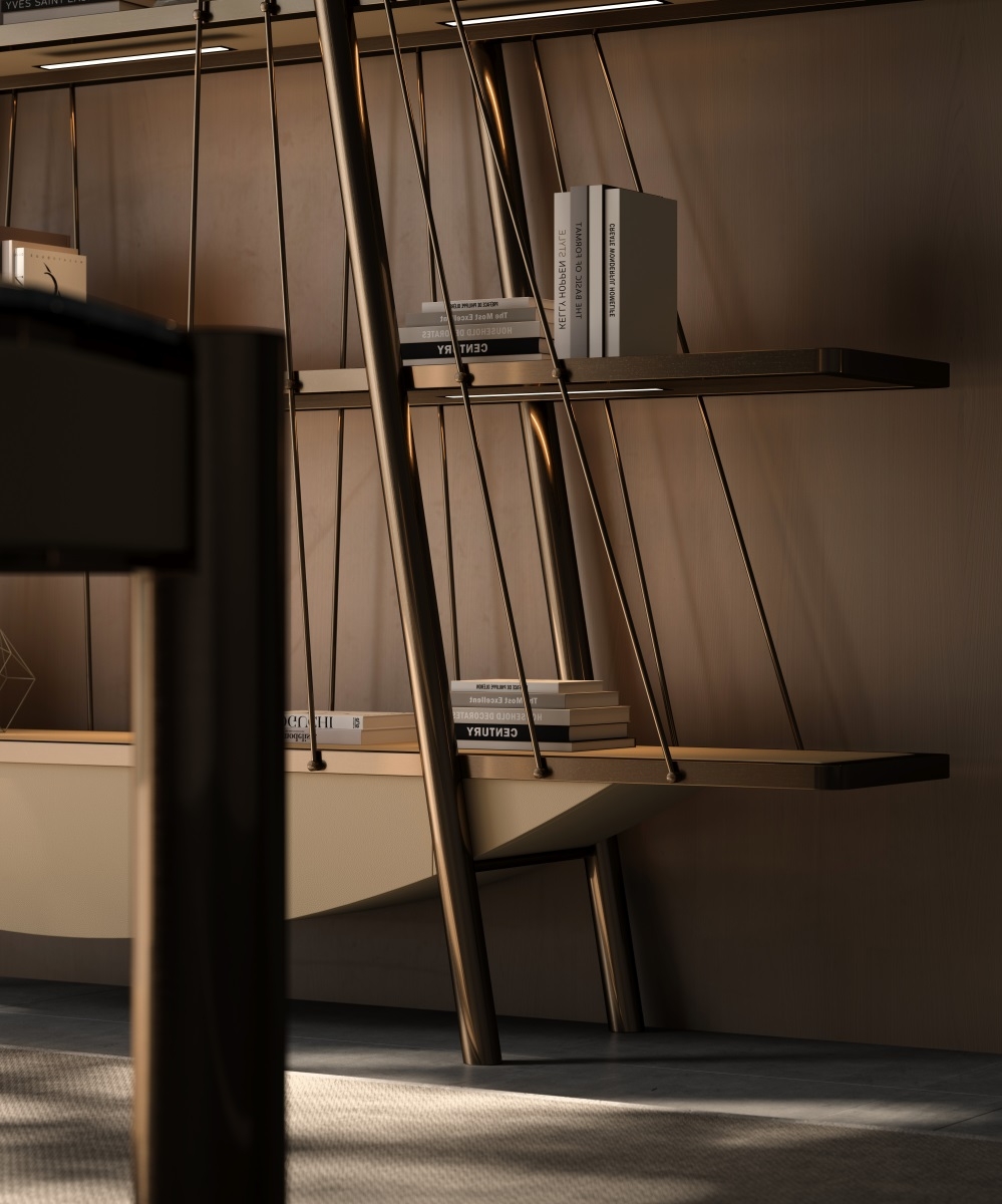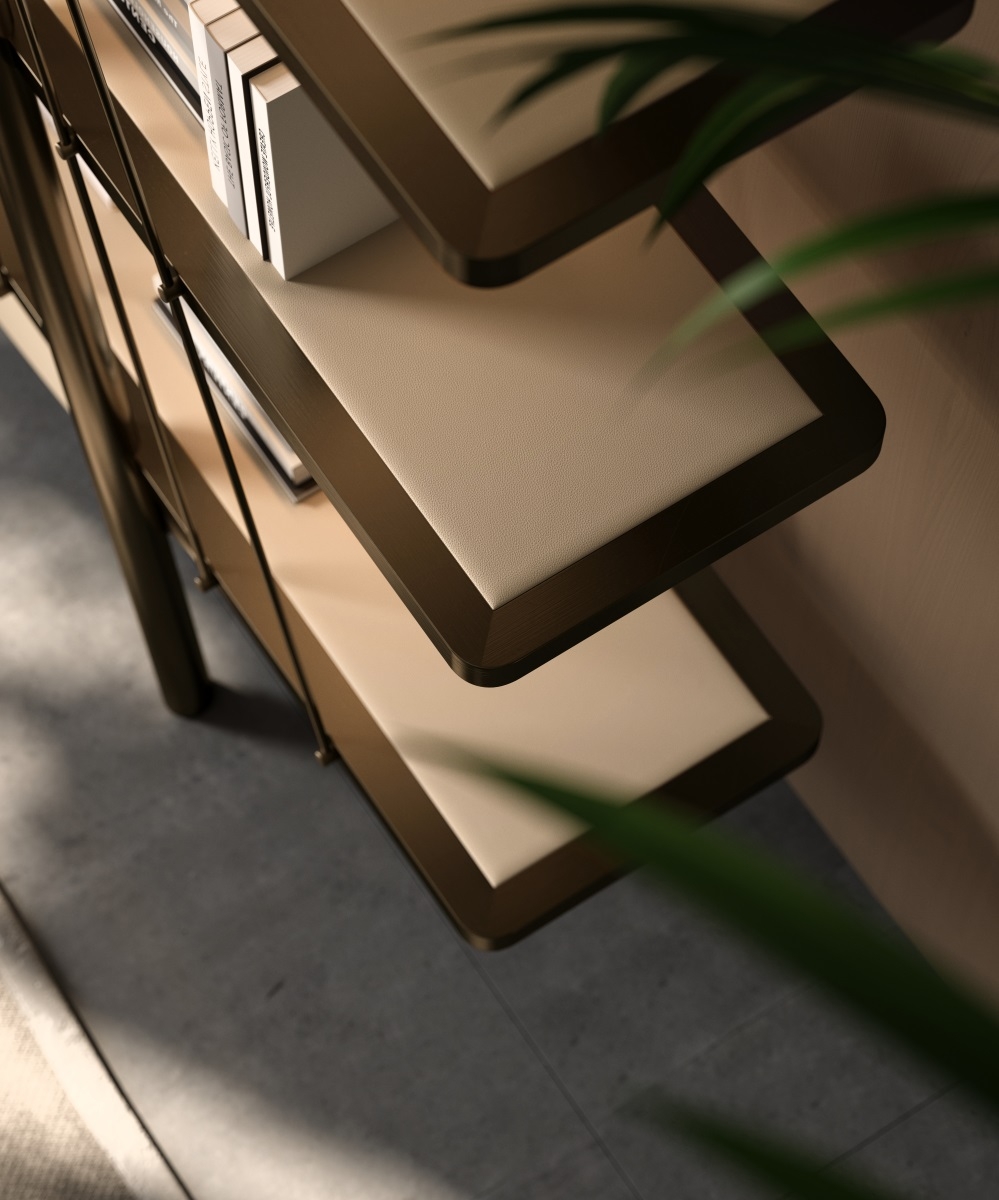 The frame is made of bronze metal, which is forged and hand-polished to present a warm luster; the shelves are made of solid wood, which are hand-polished and painted with wood wax oil to exude a natural wood fragrance; the bottom leather cabinet is ecologically tanned and feels soft and skin-friendly. The combination of the three weaves a spatial artistic texture base, injecting a cultural atmosphere into the book collection area.