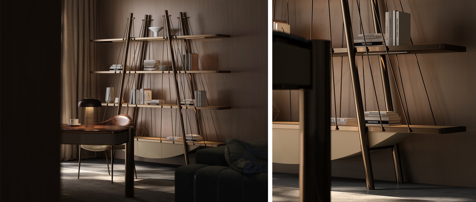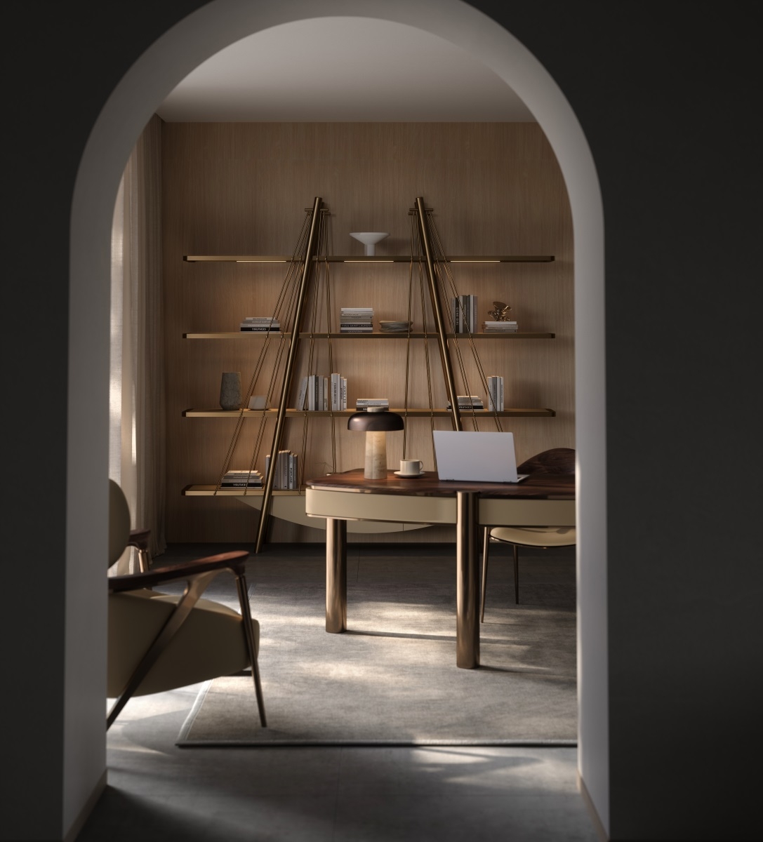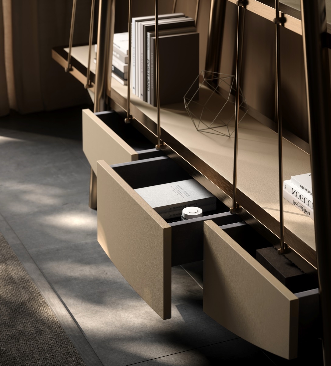 The frame is made of bronze metal, which is forged and hand-polished to present a warm luster; the shelves are made of solid wood, which are hand-polished and painted with wood wax oil to exude a natural wood fragrance; the bottom leather cabinet is ecologically tanned and feels soft and skin-friendly. The combination of the three weaves a spatial artistic texture base, injecting a cultural atmosphere into the book collection area.
