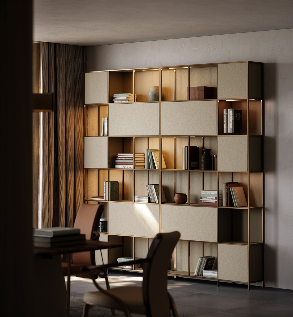 scattered storage compartments present a neat and varied visual