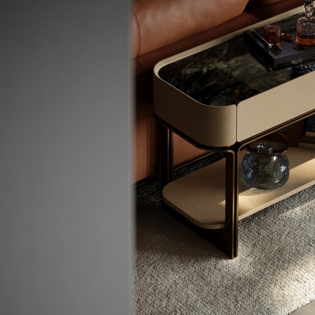 Subtracting from life and simplifying complexity is a wise attitude towards life. I hope you have the least, but everything is the best.Combines beige fabric - wrapped cabinets, metallic bronze - toned frame, and glass top insert for a luxurious, modern look.Upper cabinets and lower shelf offer flexible space for display (drinks, decor) and storage (books, essentials).
