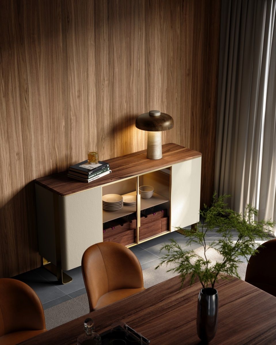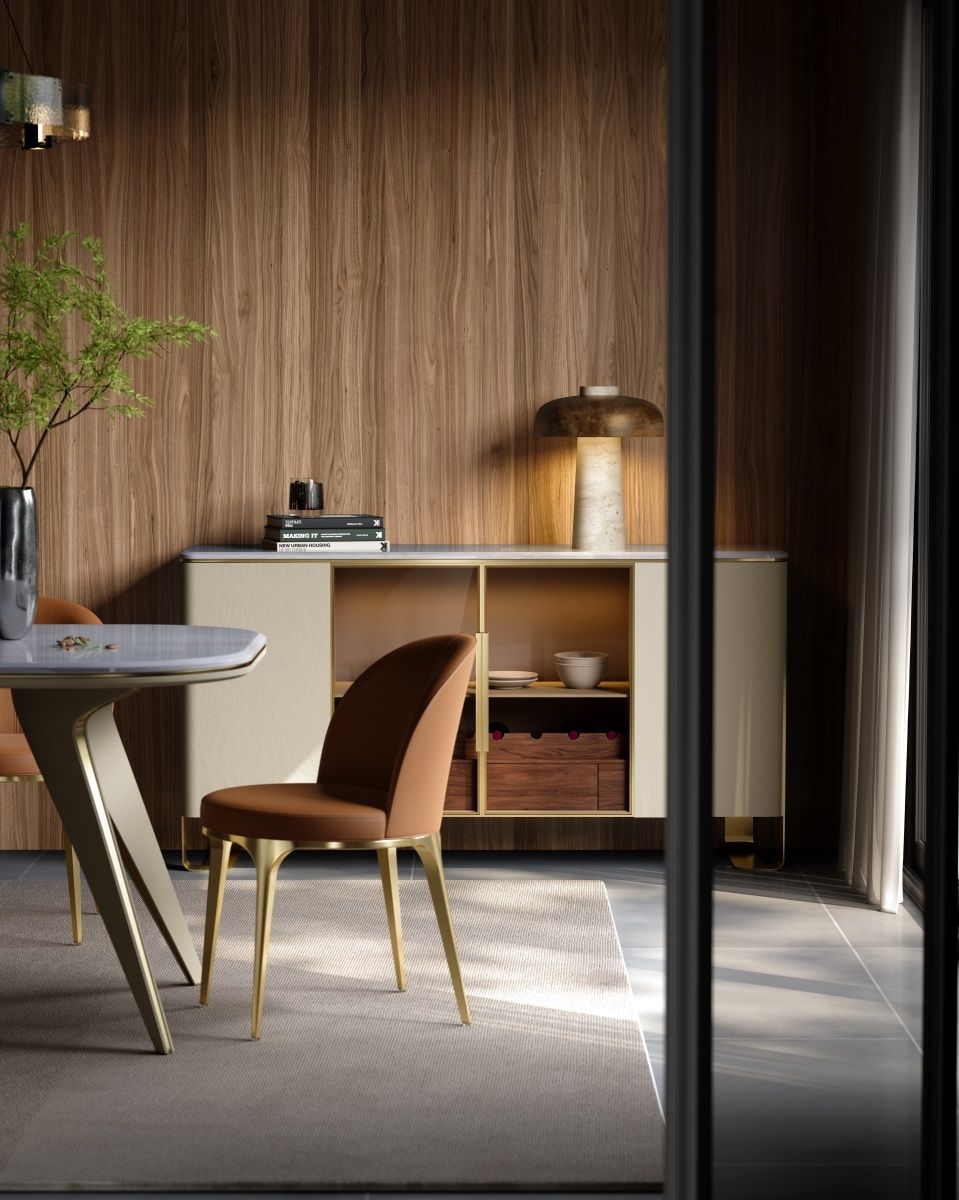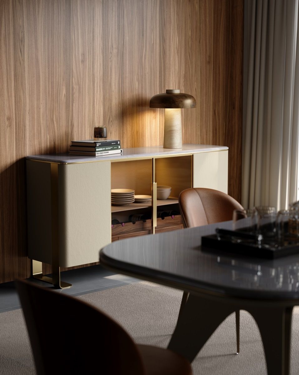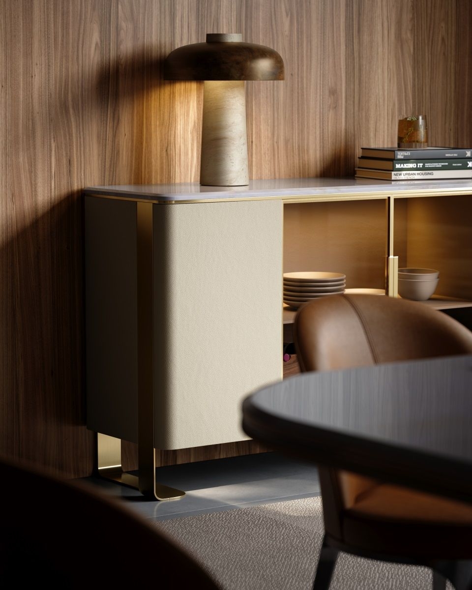 It has both soft curves and a stable design, with a combination of leather grain mist gray and brown glass, calm yet elegant.