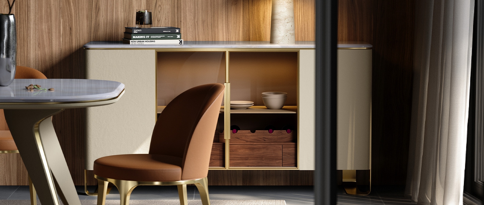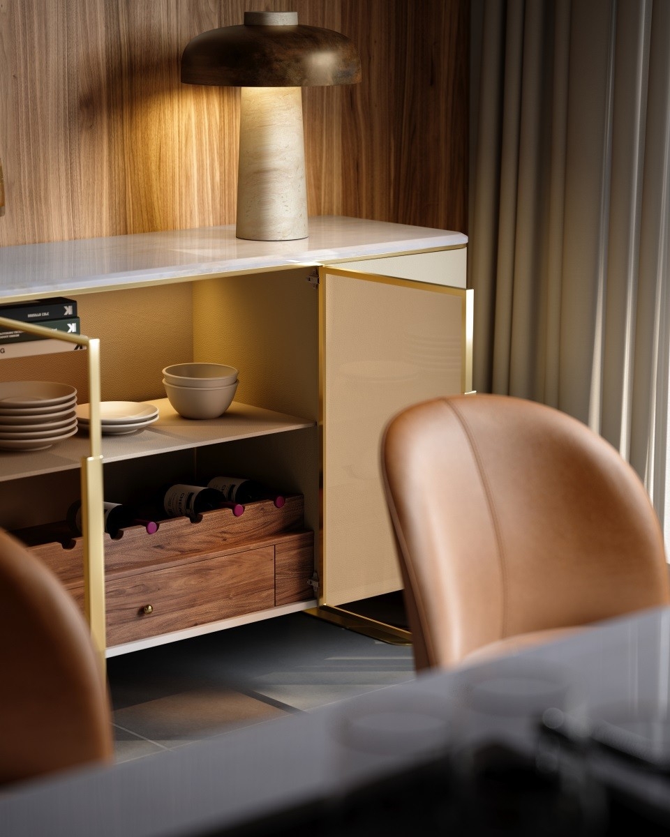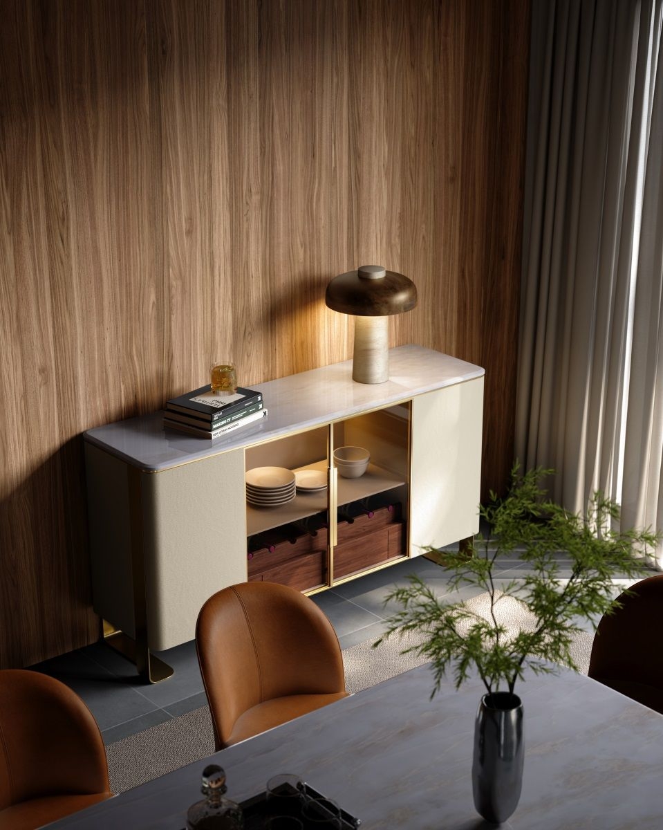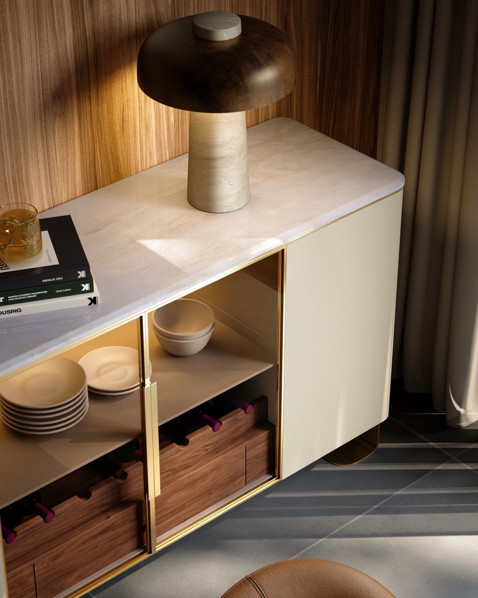 Subtracting from life and simplifying complexity is a wise attitude towards life. I hope you have the least, but everything is the bestMarble top, beige fabric - wrapped cabinets, wooden inner shelves, and gold - toned metal accents create an opulent, modern look.