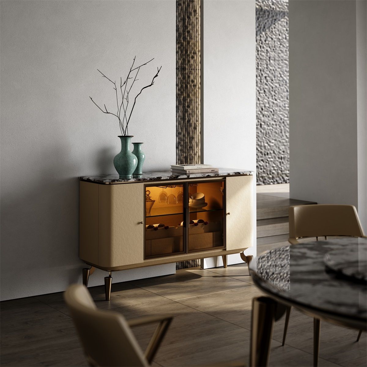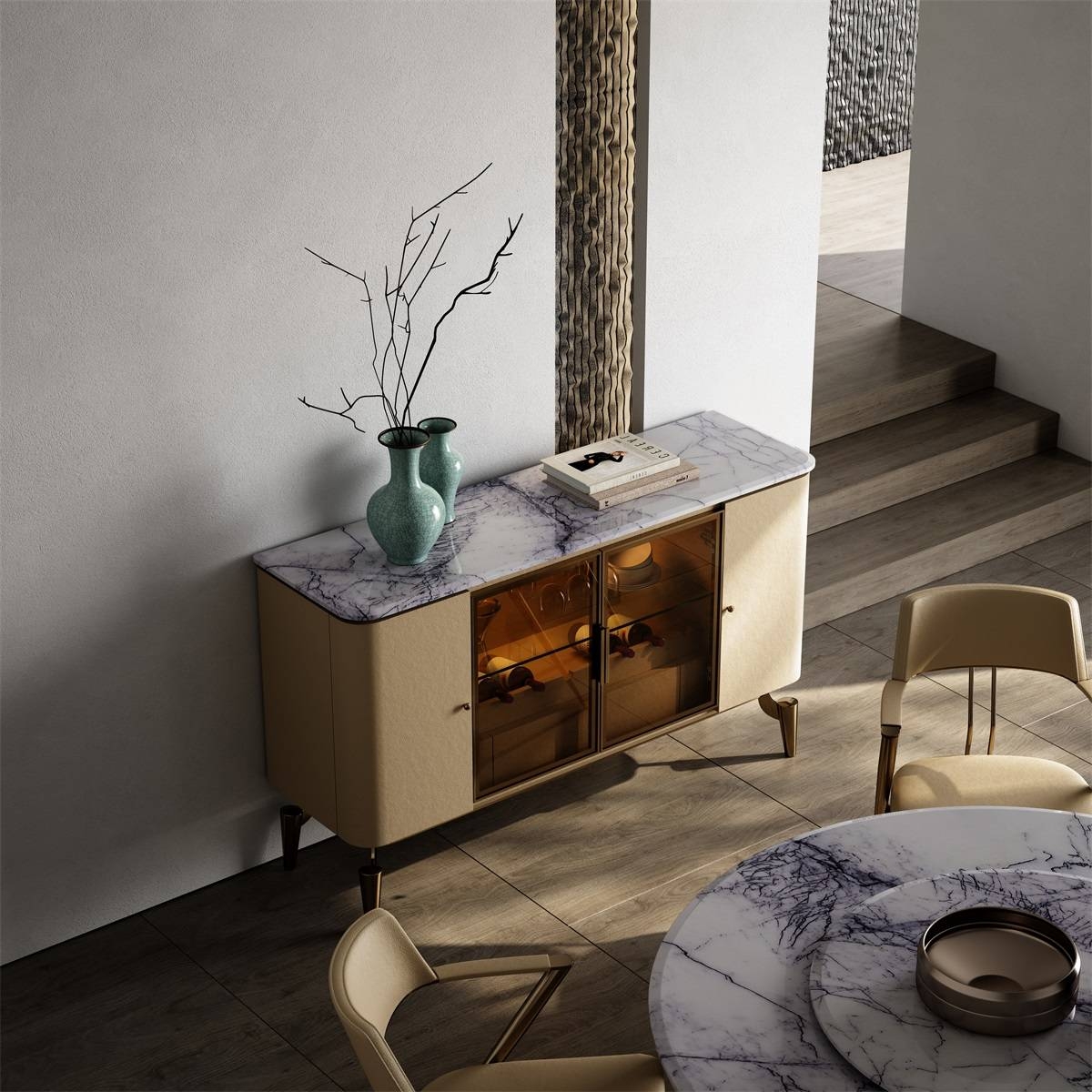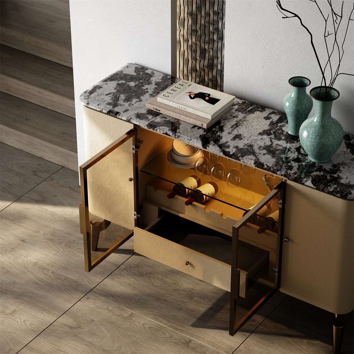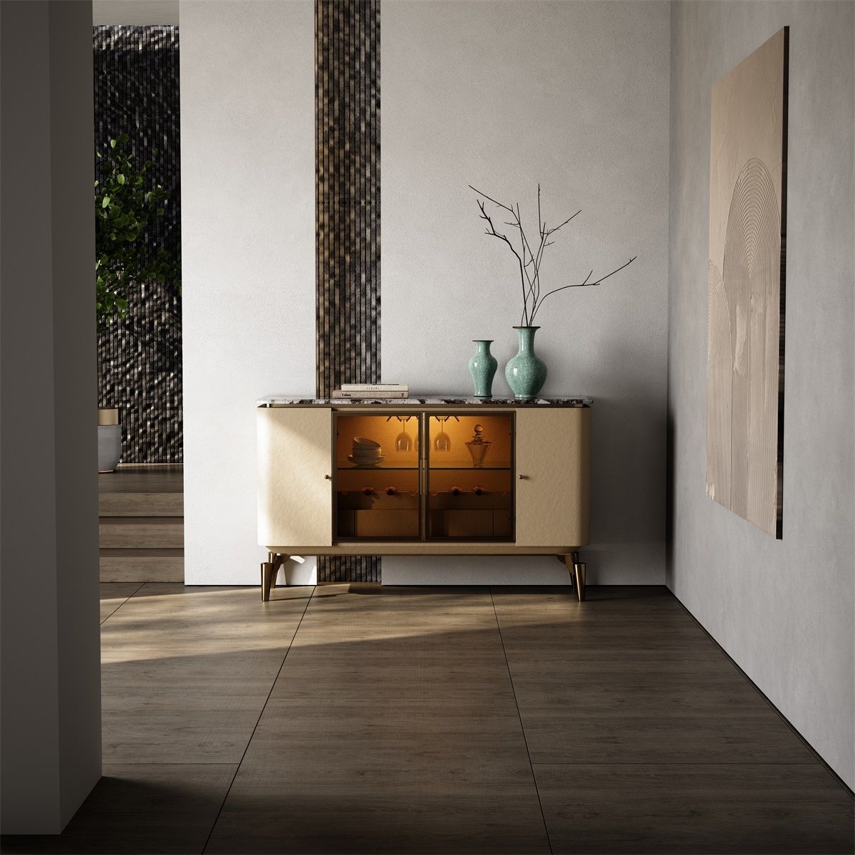 Life has no end, one should set lofty aspirations. Take responsibility, and guard our homes in spite of the storm.Elegant Material Fusion:Marble top, beige fabric - wrapped cabinets, glass doors, and metallic legs create a luxurious, modern look.
