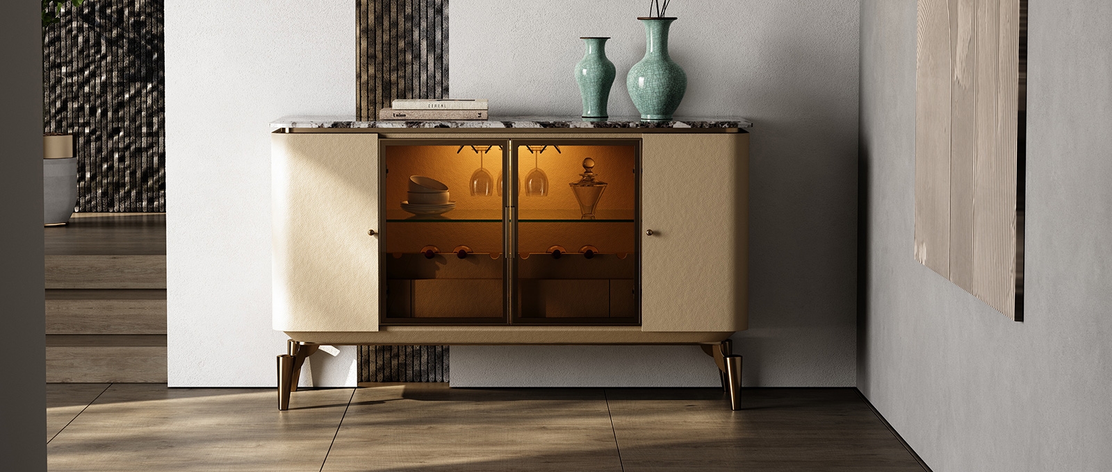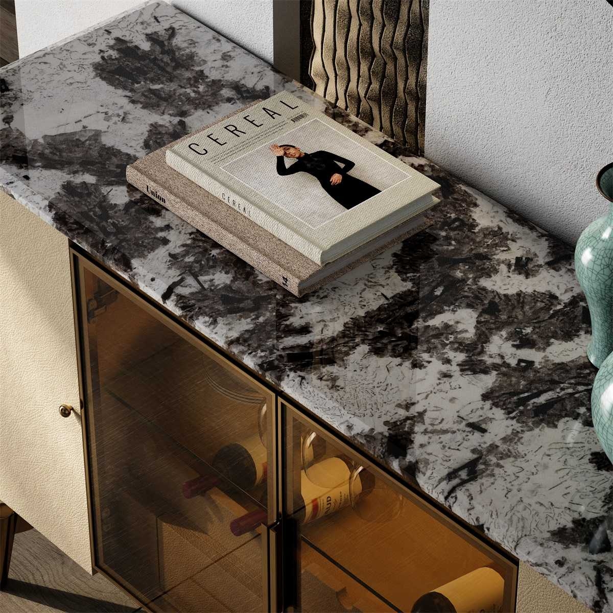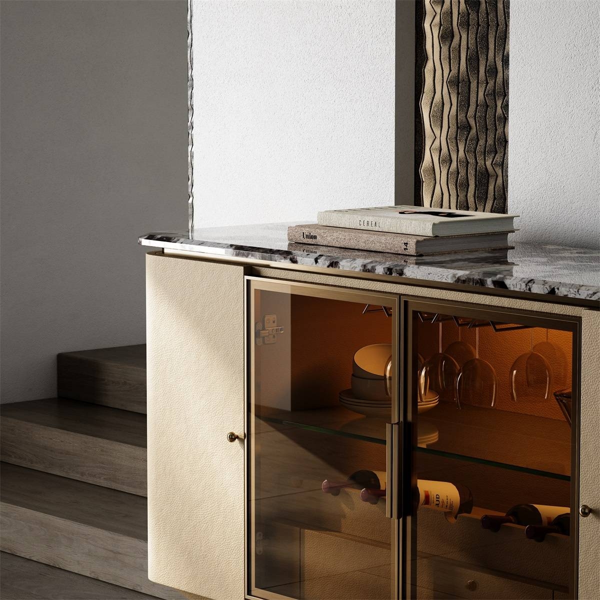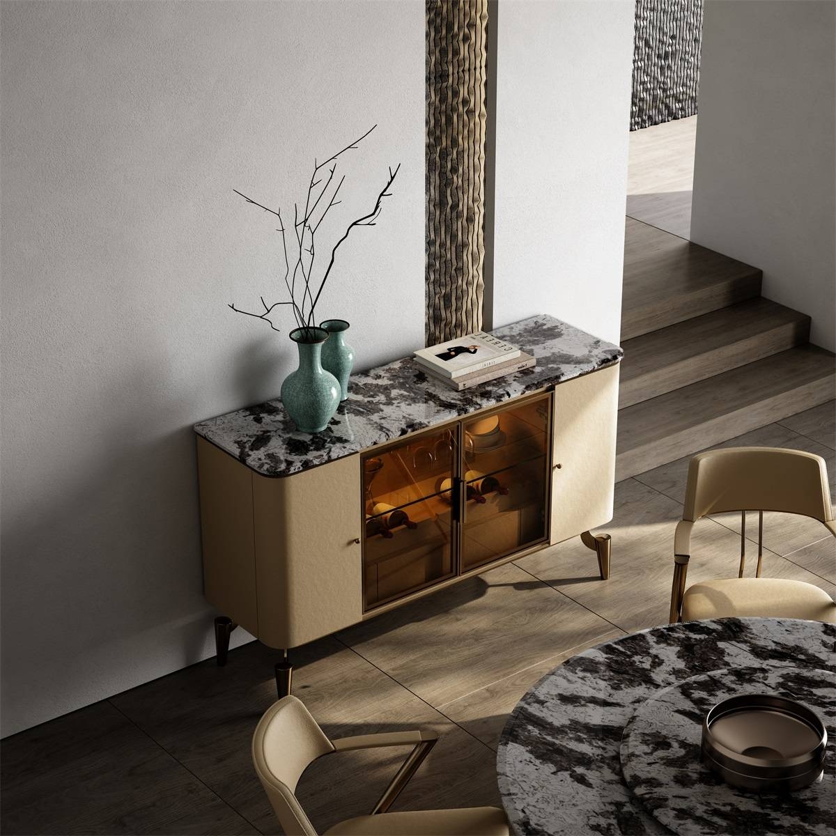 Life has no end, one should set lofty aspirations. Take responsibility, and guard our homes in spite of the storm.Elegant Material Fusion:Marble top, beige fabric - wrapped cabinets, glass doors, and metallic legs create a luxurious, modern look.