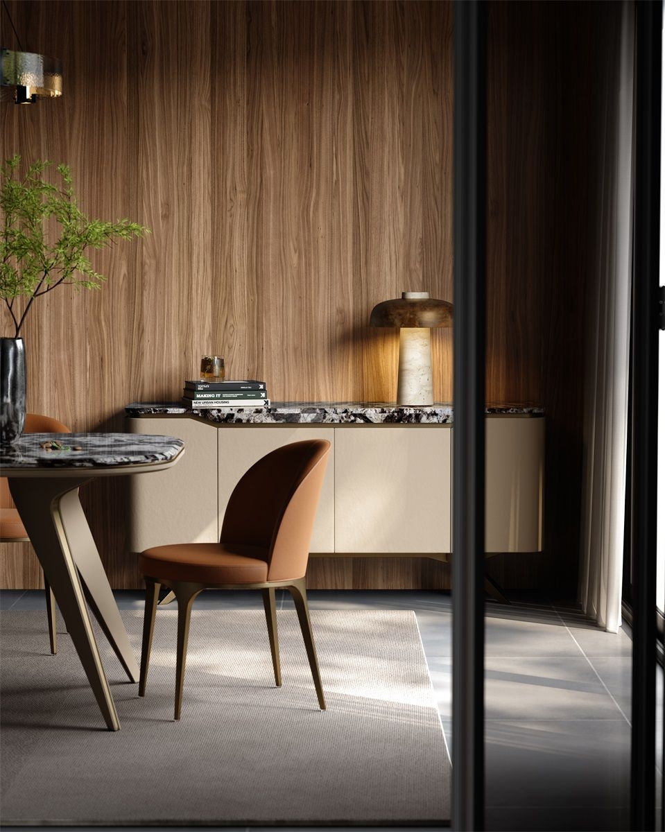 The idea comes from the Chinese character "寅", which means respect, showing the Chinese cultural heritage and has extraordinary significance.Luxury Material HarmonyCombines a polished marble top with soft, beige leather - like cabinetry and sleek metal legs. Creates a high - end, elegant look.