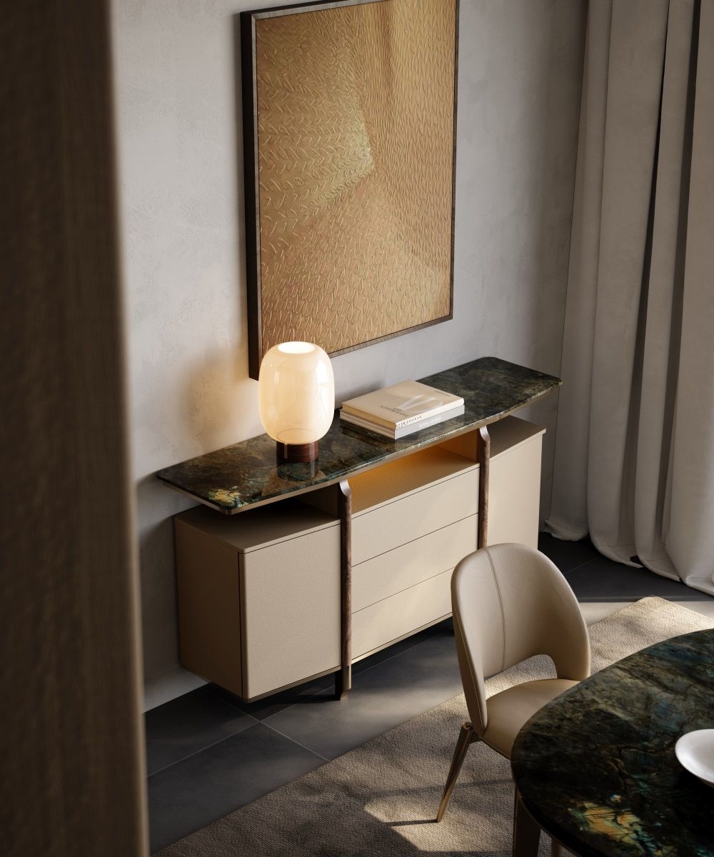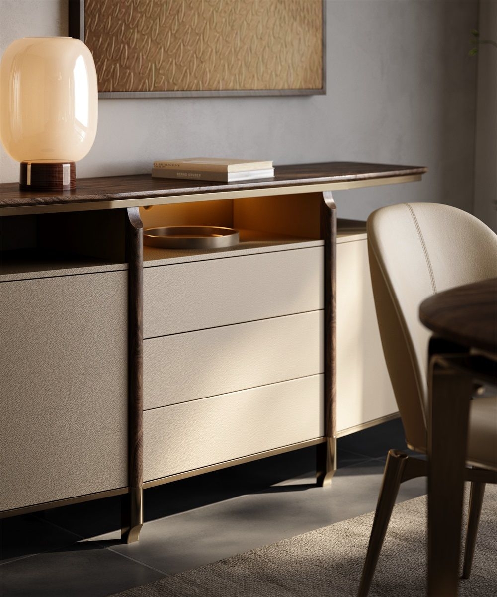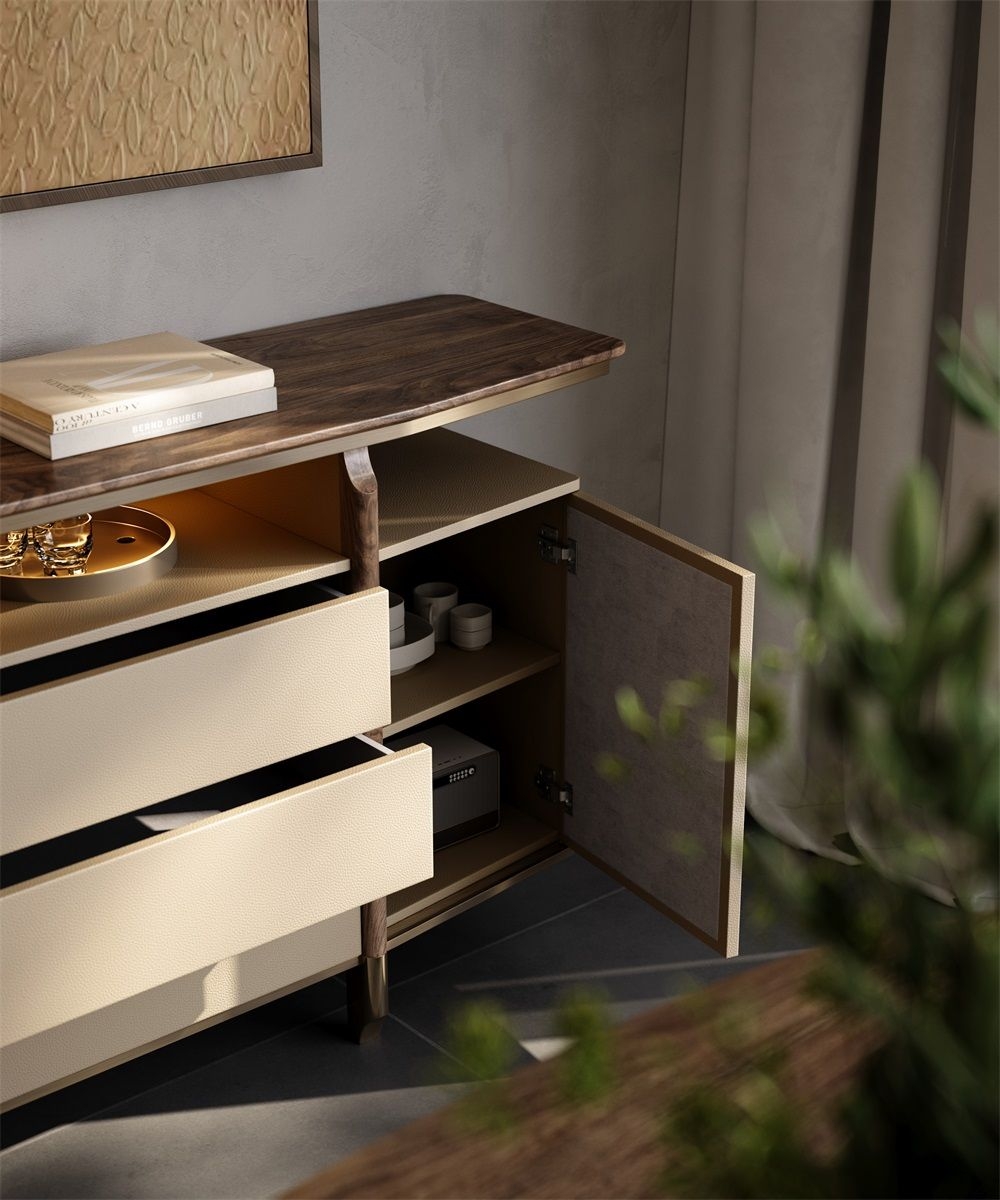 Based on the consideration of Tianhe and human rationality, use symmetrical techniques to design and achieve a perfect stateCombines open display space (with lighting), drawers, and cabinets for versatile storage and decor.Wooden top, beige fabric - wrapped cabinets/drawers, and metal accents create a luxurious, modern look.