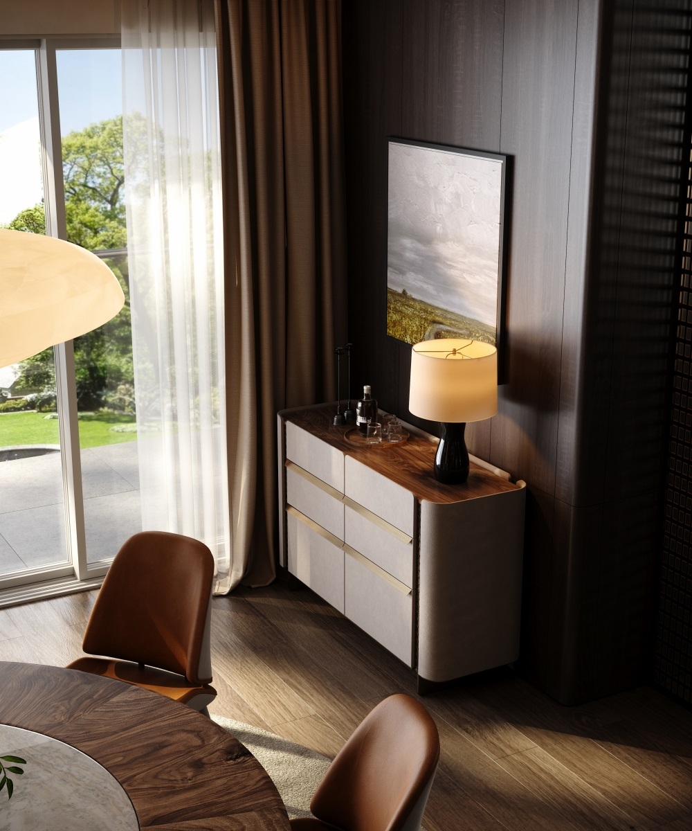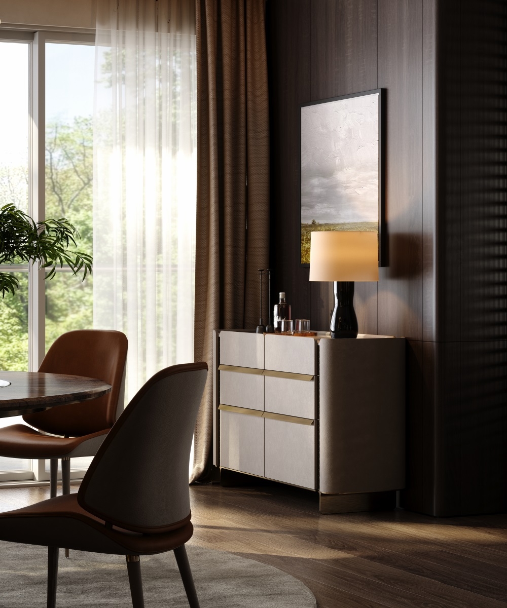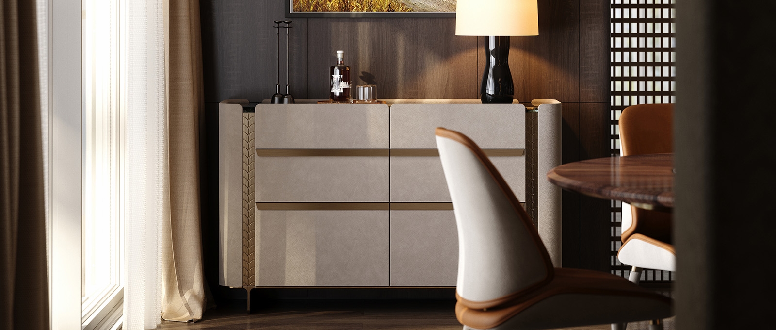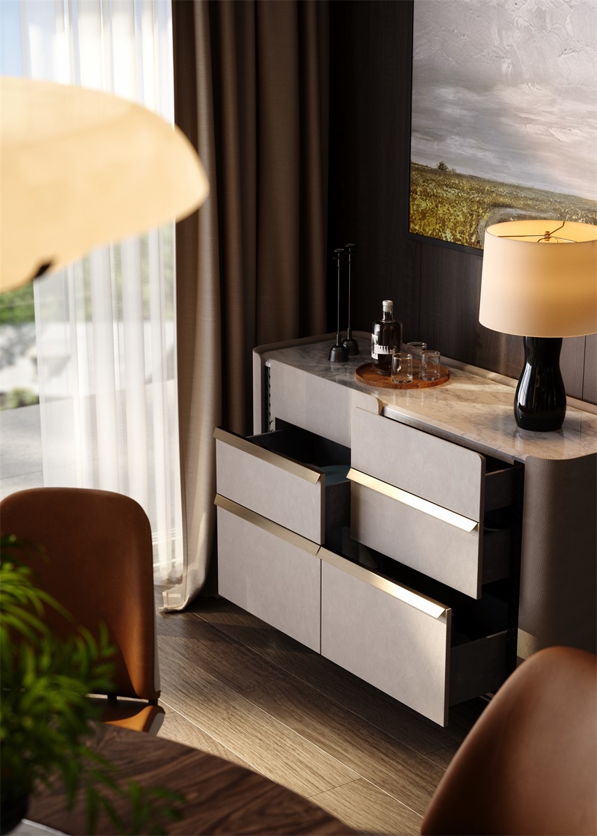 and the metal legs provide sturdy support. Multiple drawers offer large-capacity storage, fully displaying a light luxury style.