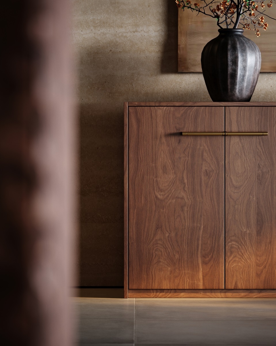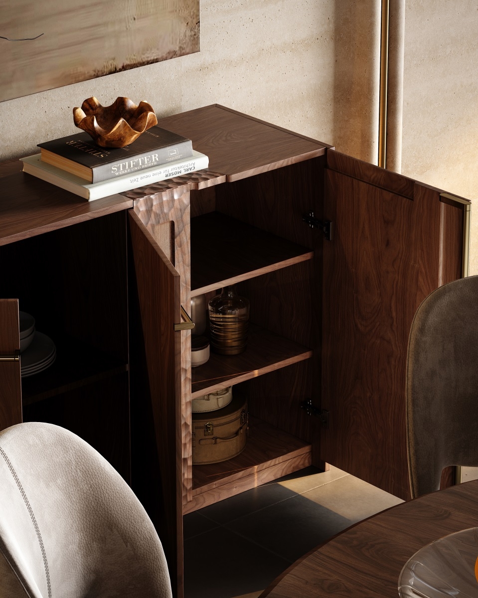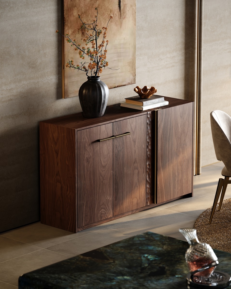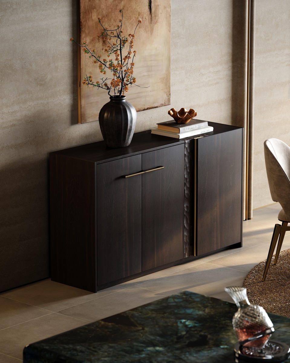 The product creates a strong sense of space with clean, generous lines. Its linear metal structure stands out as a highlight,