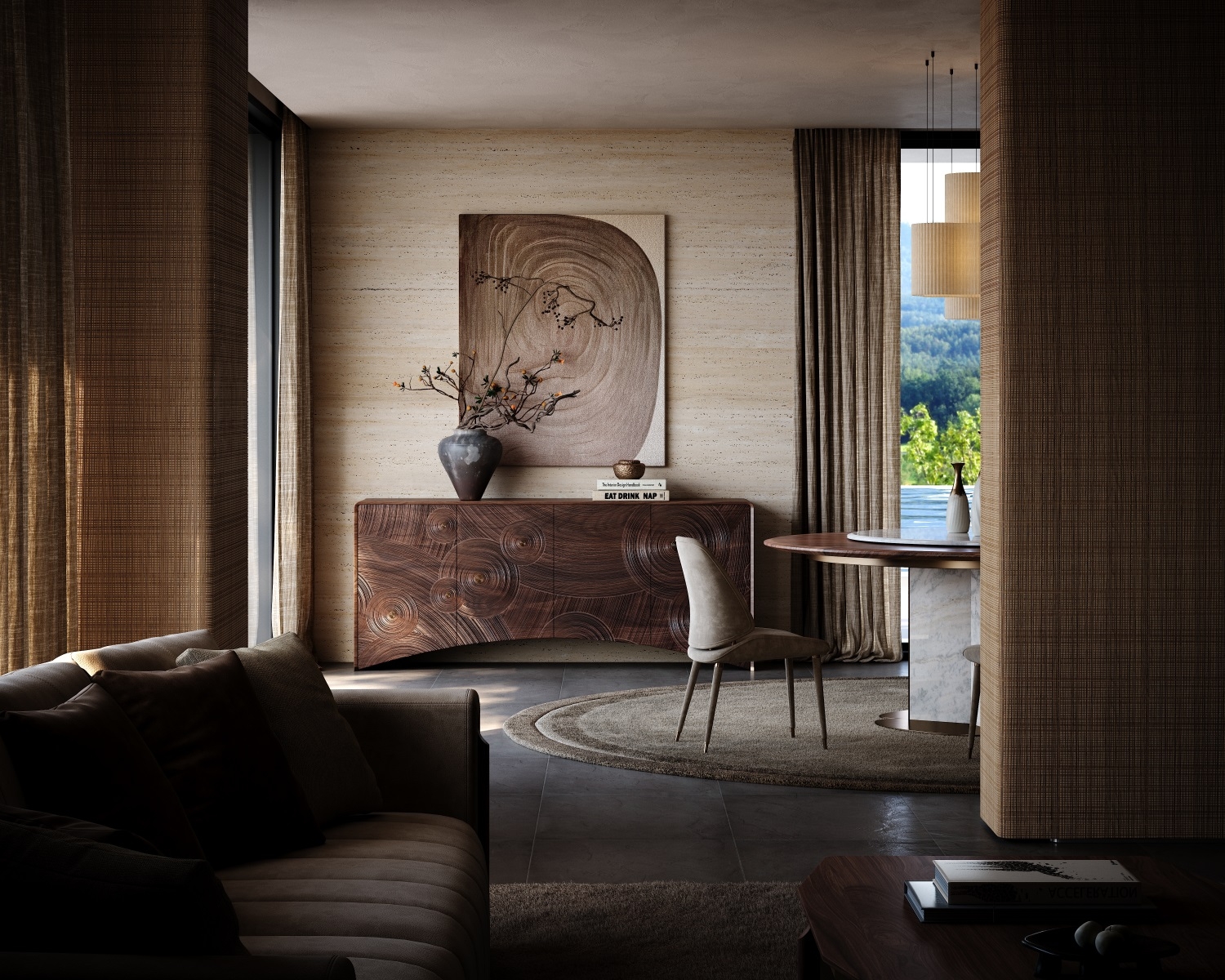 Clean, flowing lines define the collection area. The tabletop combines solid wood and natural stone,