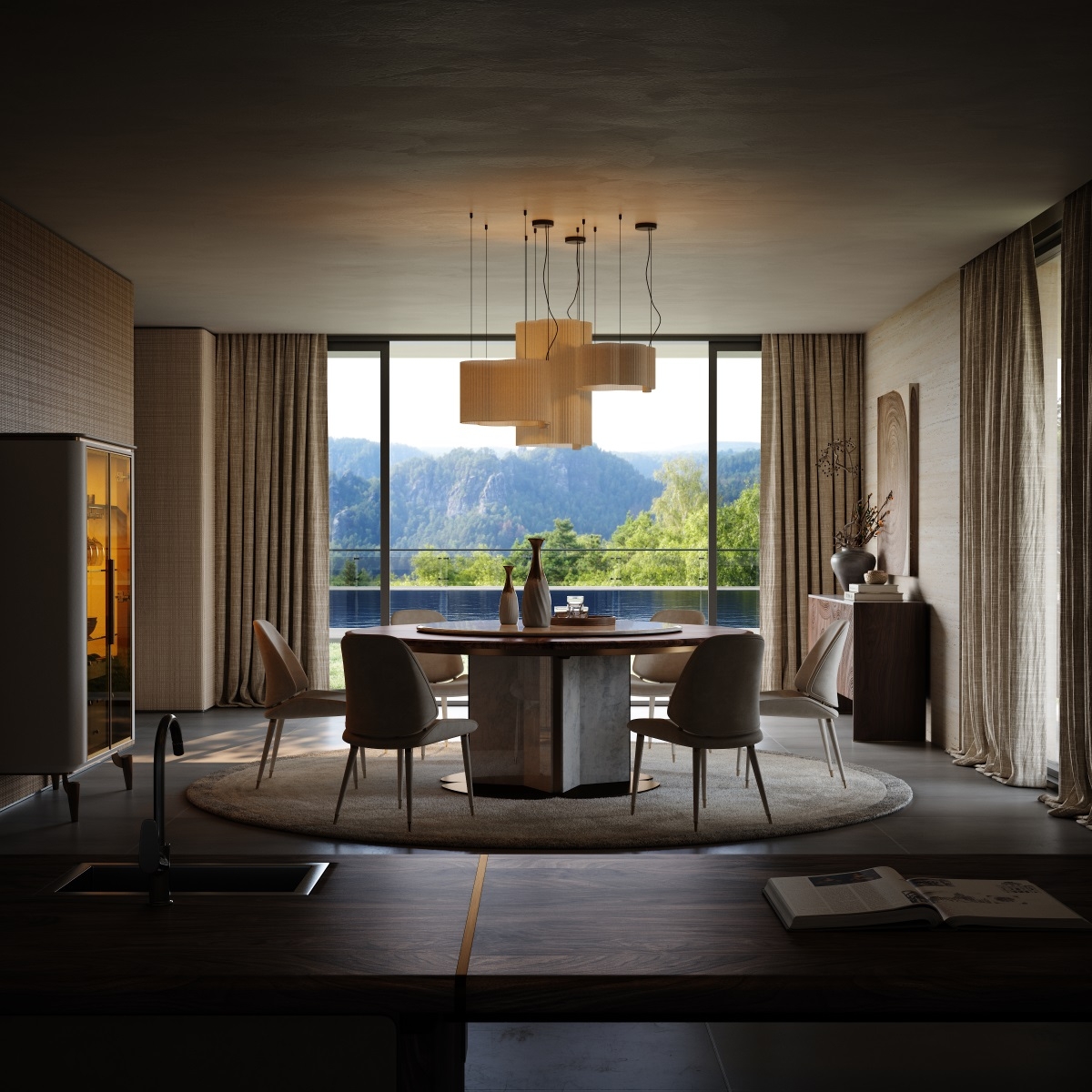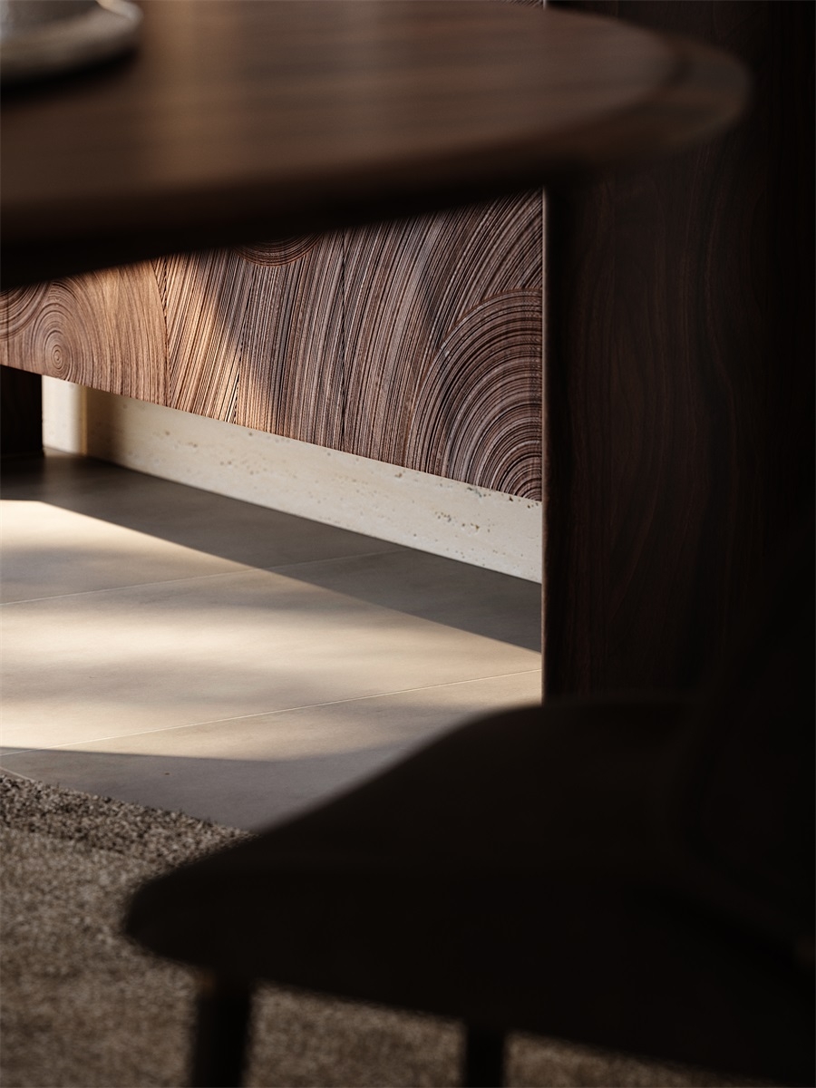 Clean, flowing lines define the collection area. The tabletop combines solid wood and natural stone,