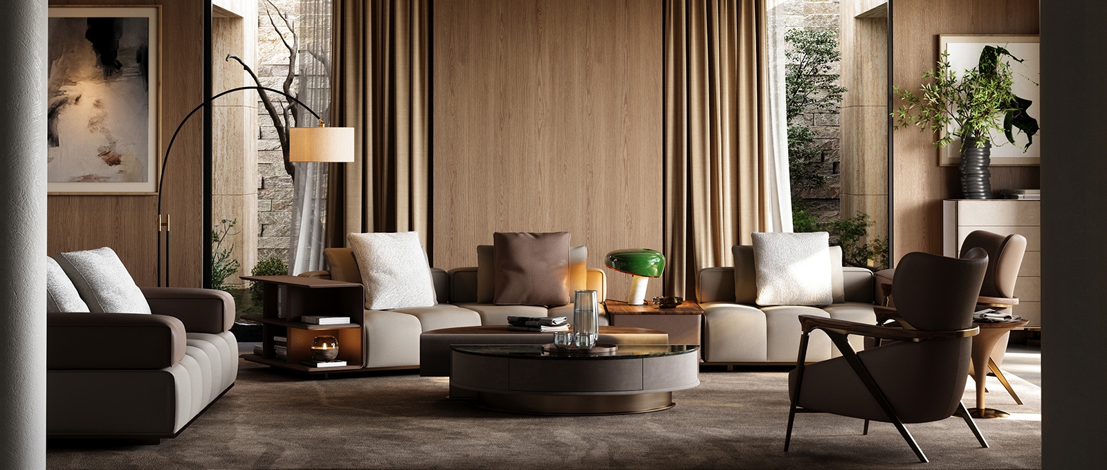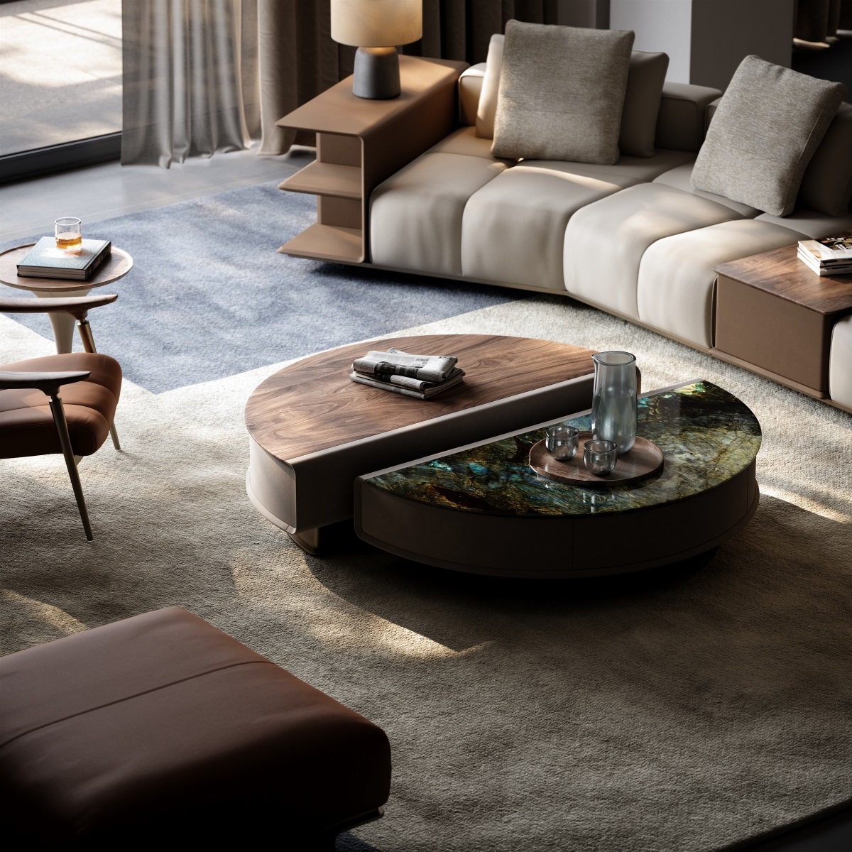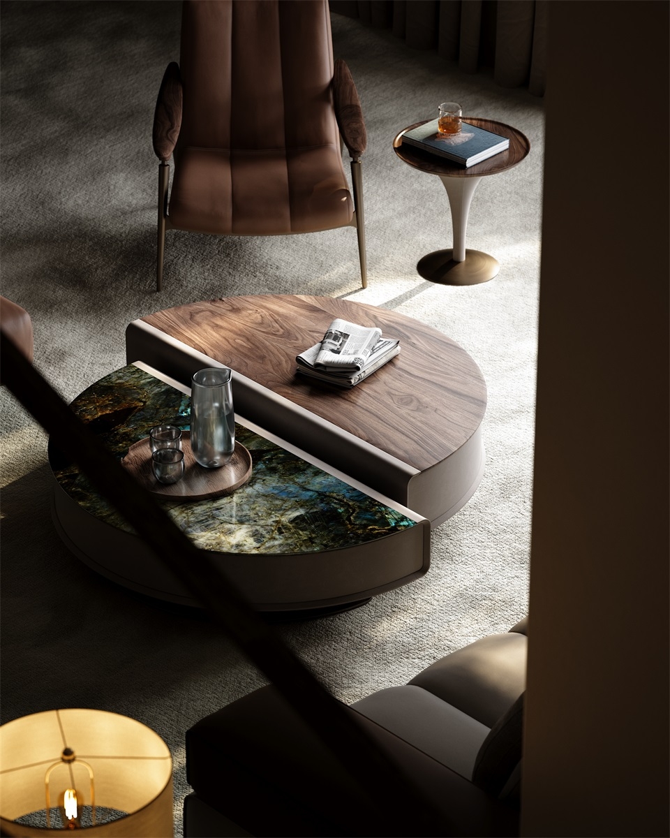 Merges wood, marble, leather - like fabric, and metal for a sumptuous, timeless appeal.