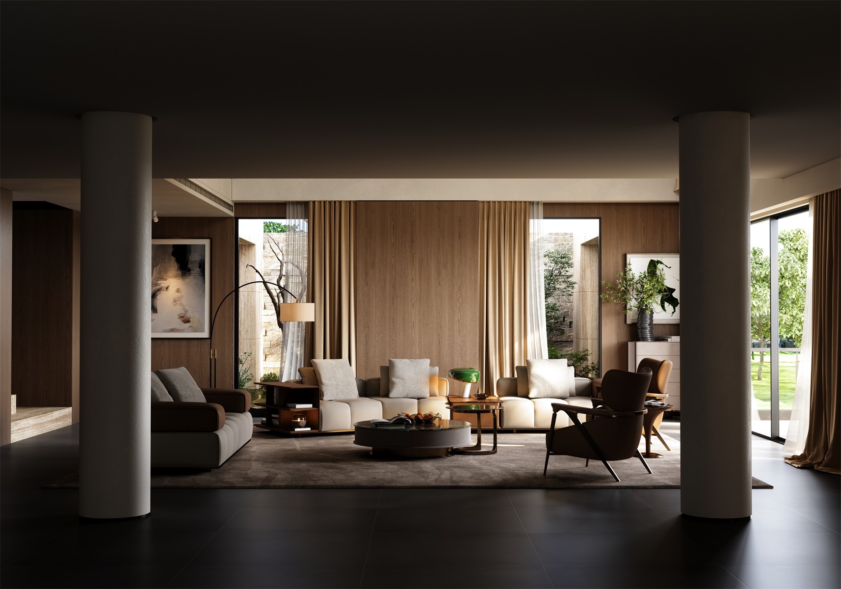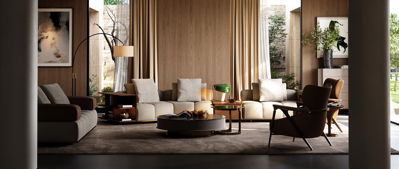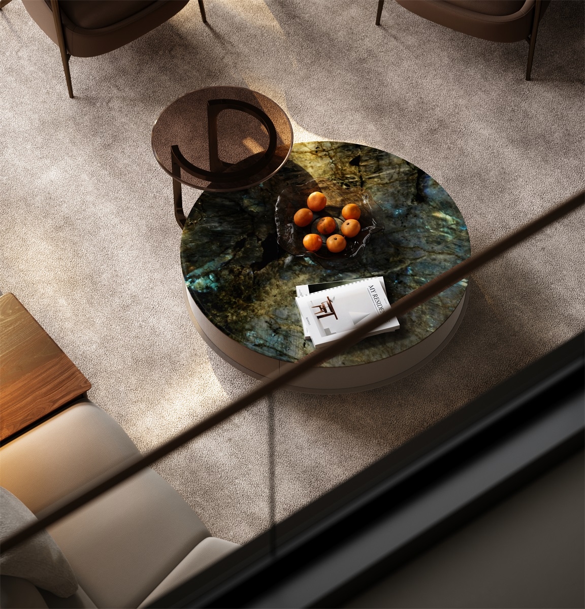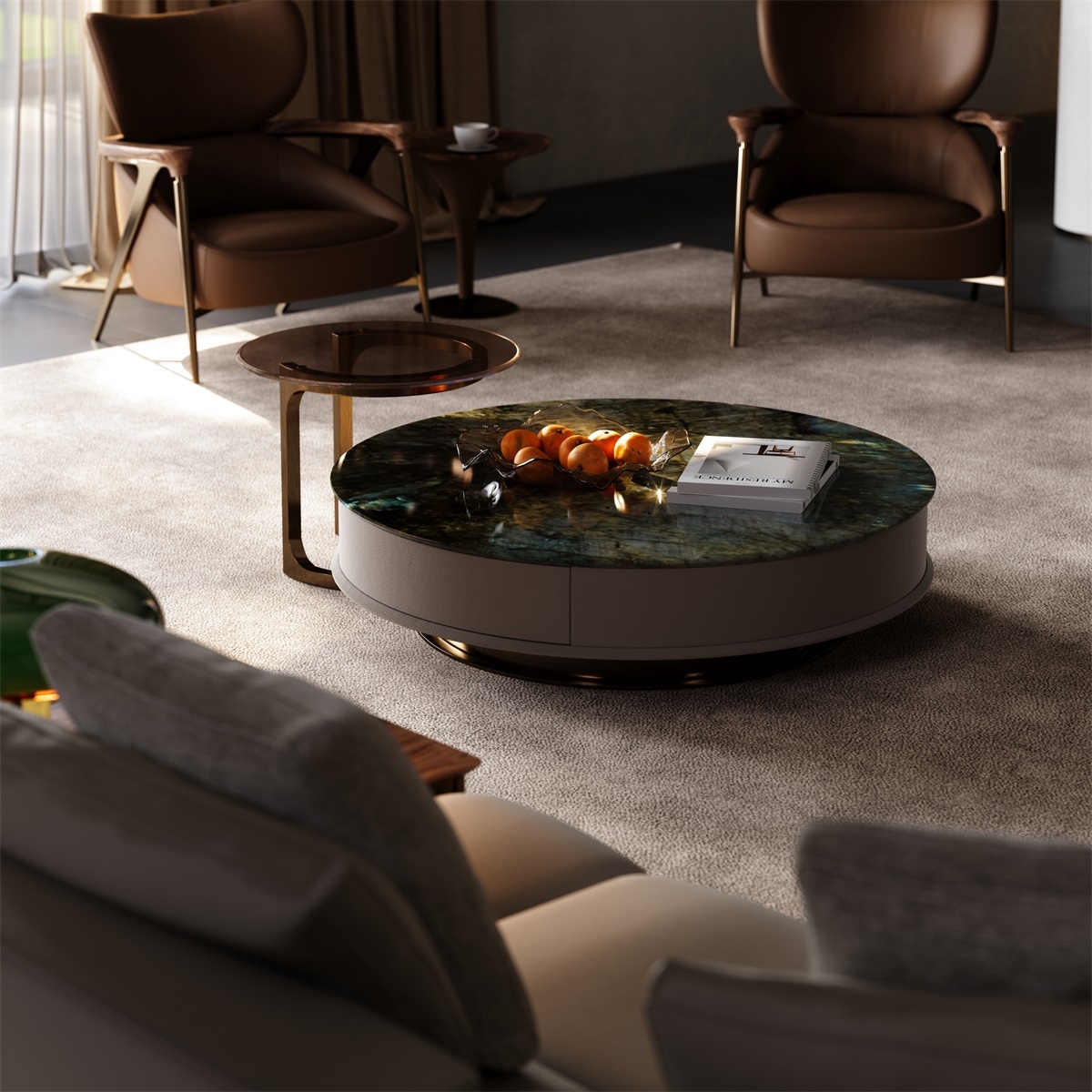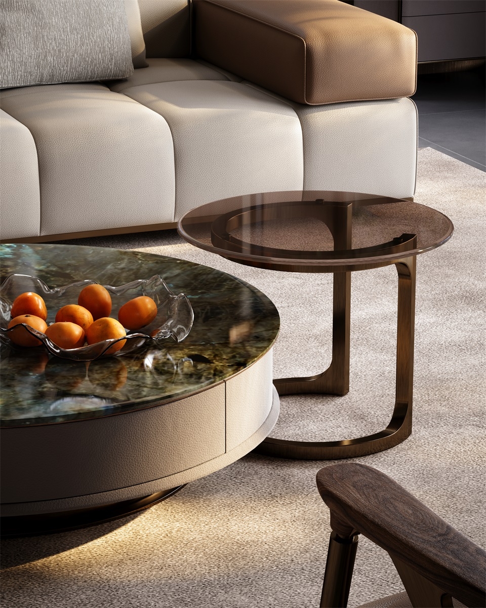 The circular outline of the large coffee table echoes the semi-circular support of the small side table, creating a spatial philosophy of "enclosed communication". The hidden drawers of the large coffee table meet the storage needs, while the suspended countertop of the small side table can flexibly place tea cups and books, forming a functional zone of "main and auxiliary interaction", transforming the living room from an "empty space" to an "intimate communication venue".