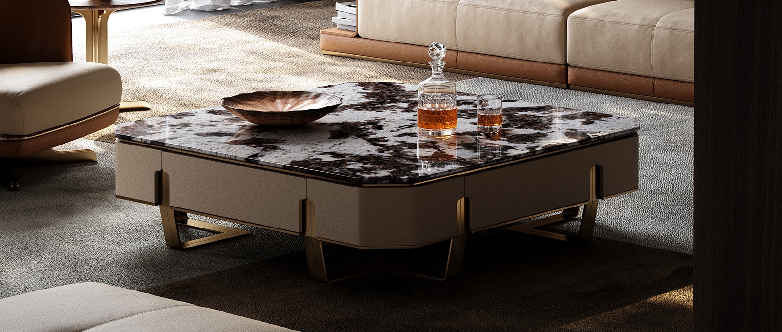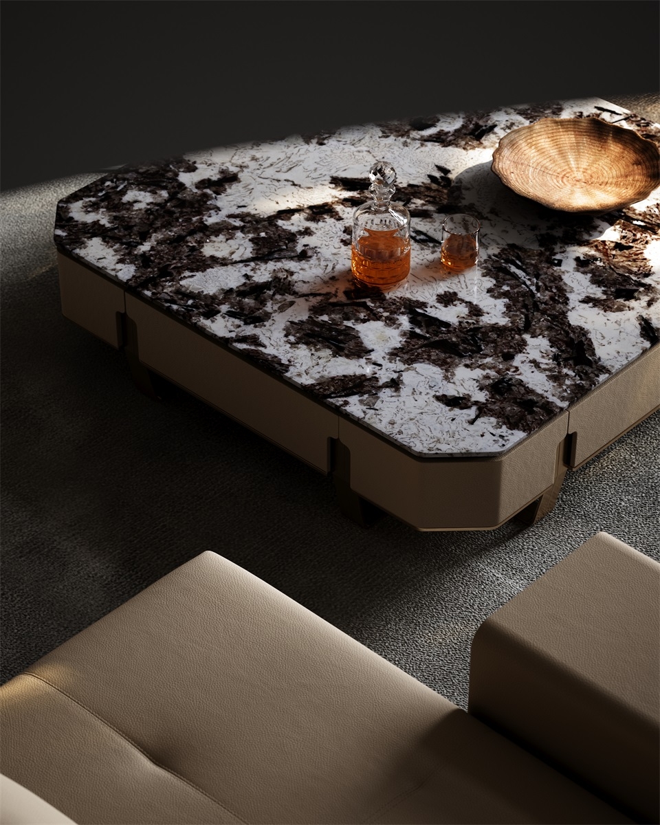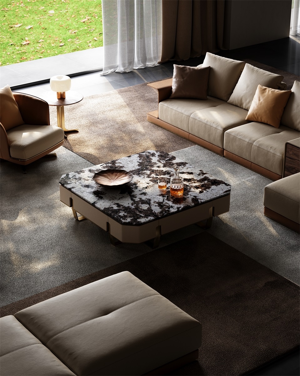 The design of simplifying complexity is a bold innovation in art, using minimalist lines to express spatial art and promoting the integration of minimalist lifestyle attitude and design.Merges marble, leather - like fabric, and metal for a sumptuous, timeless appeal.Integrated storage adds practicality, keeping your space tidy. Ideal for showcasing decor or everyday items, enhancing living room aesthetics.