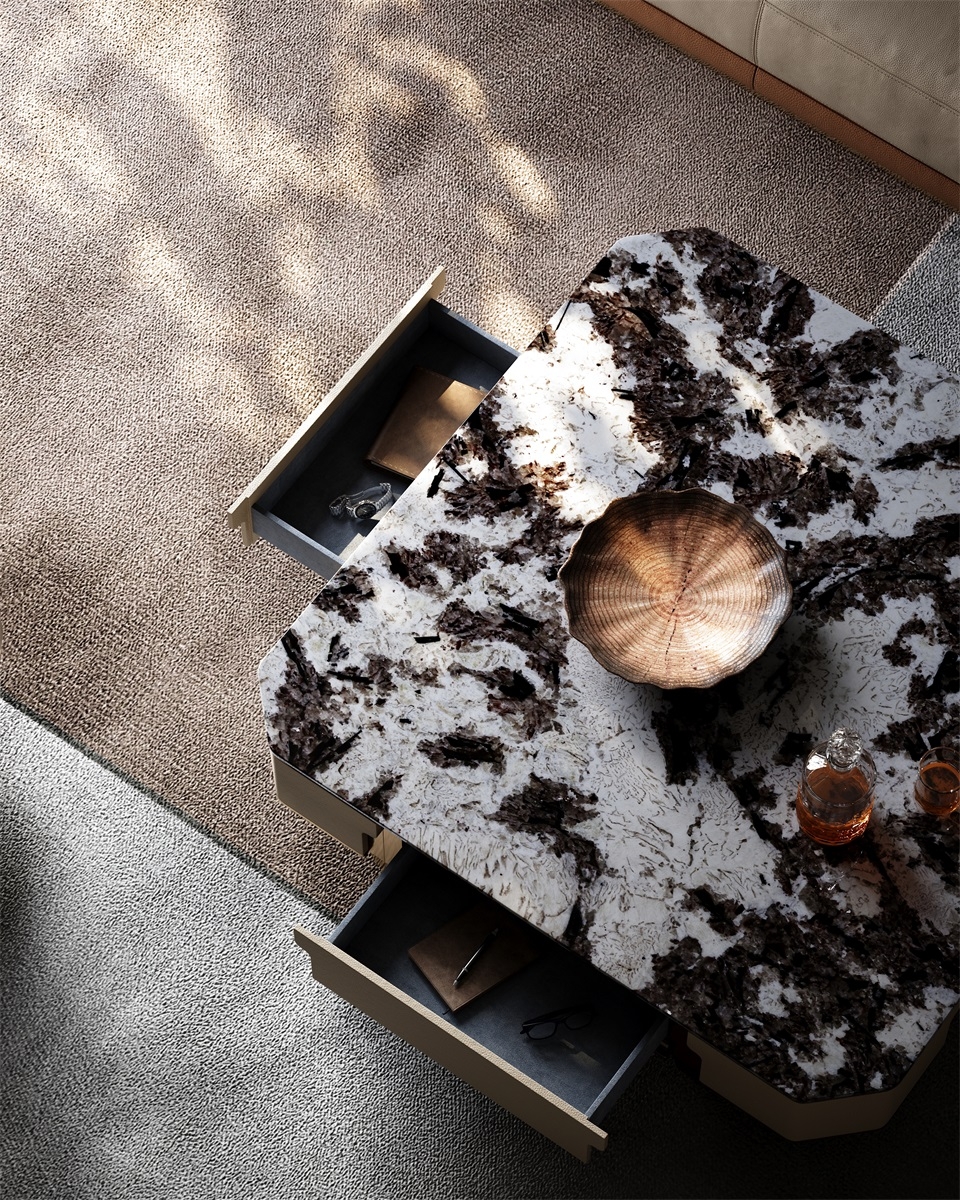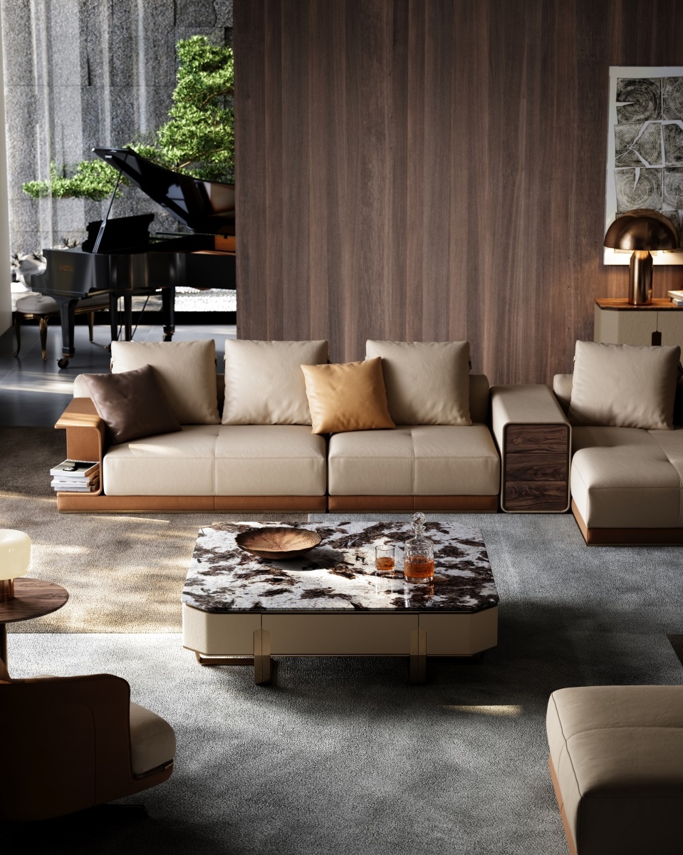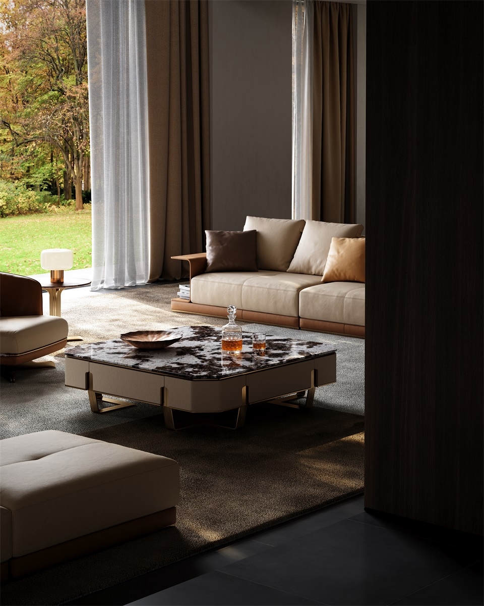 The design of simplifying complexity is a bold innovation in art, using minimalist lines to express spatial art and promoting the integration of minimalist lifestyle attitude and design.Merges marble, leather - like fabric, and metal for a sumptuous, timeless appeal.Integrated storage adds practicality, keeping your space tidy. Ideal for showcasing decor or everyday items, enhancing living room aesthetics.