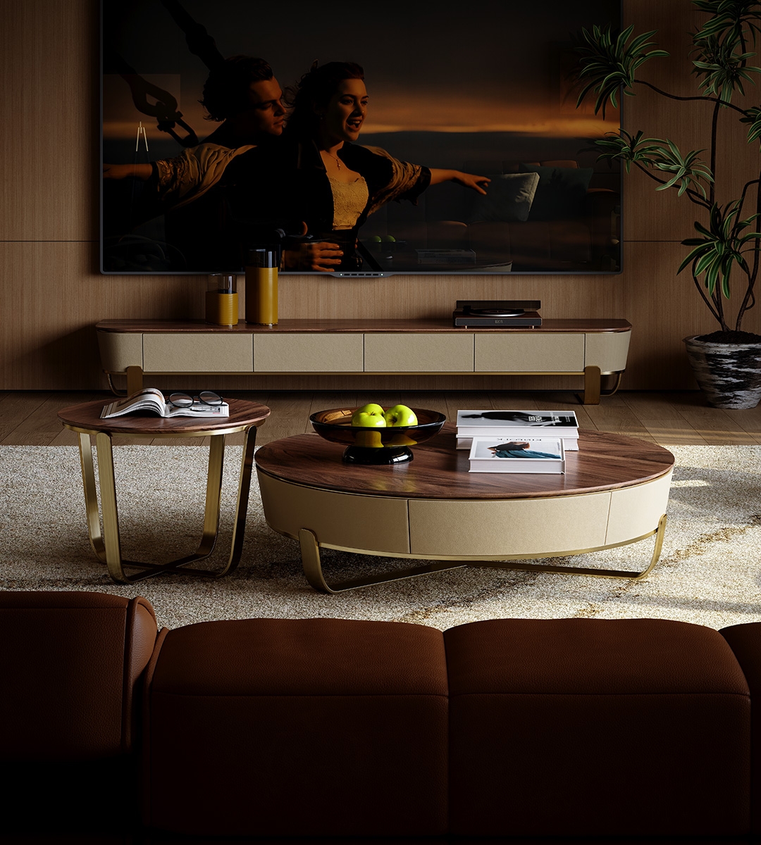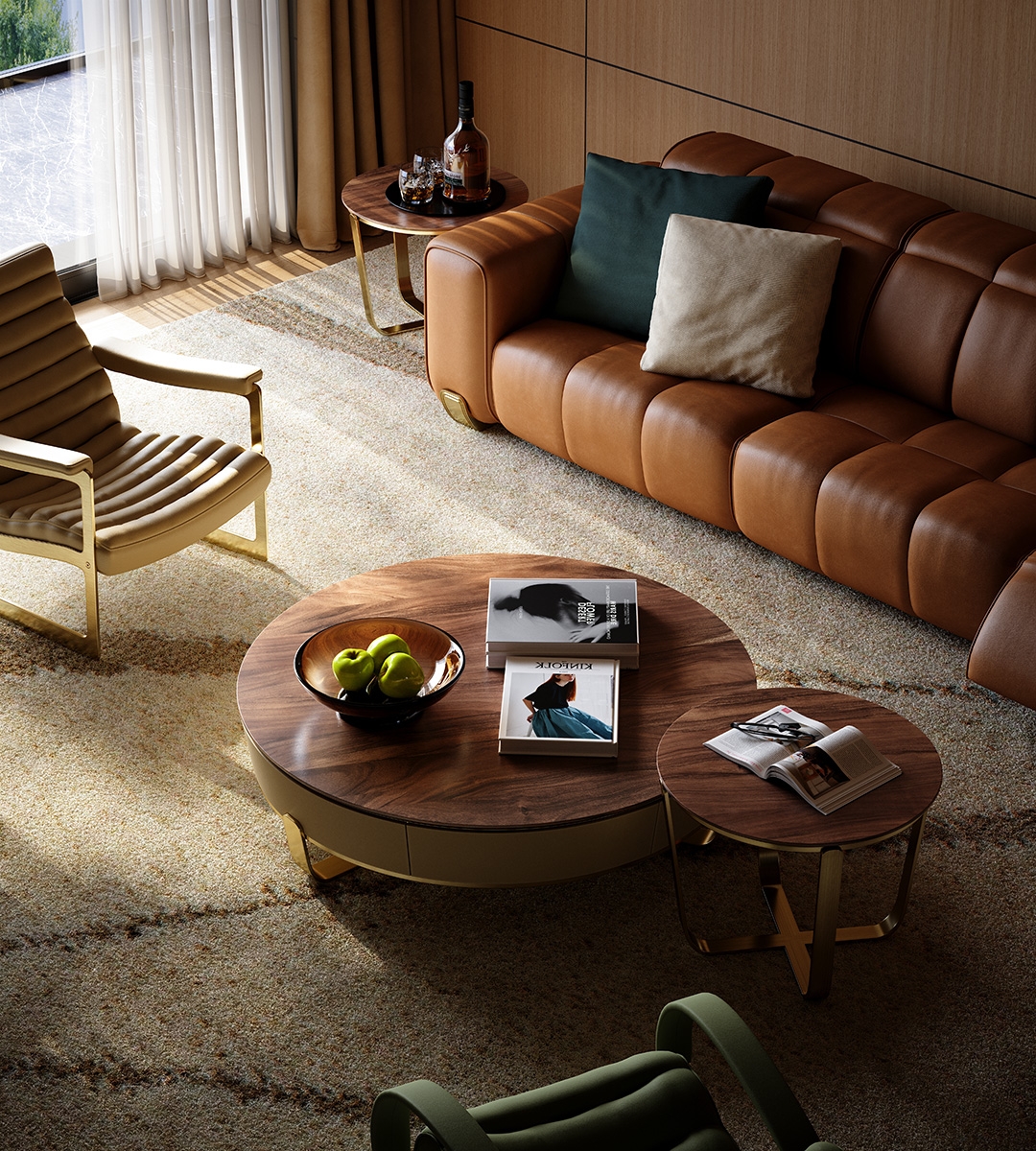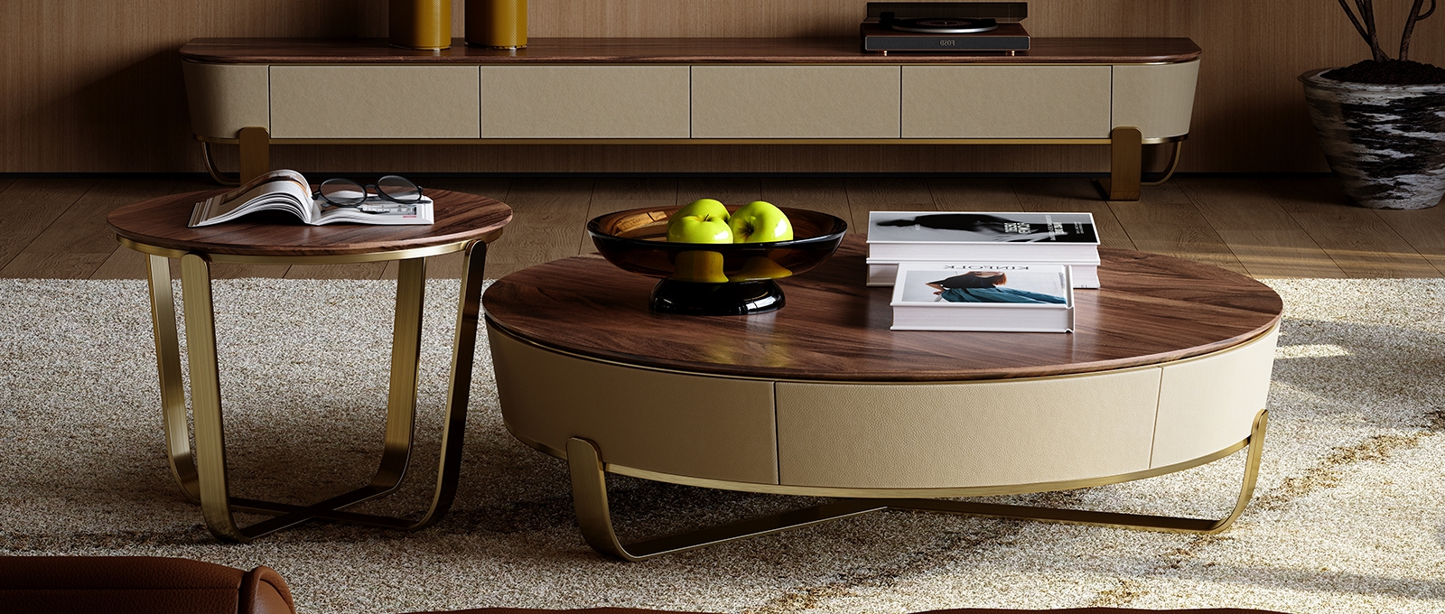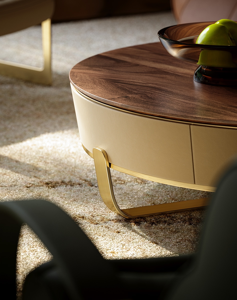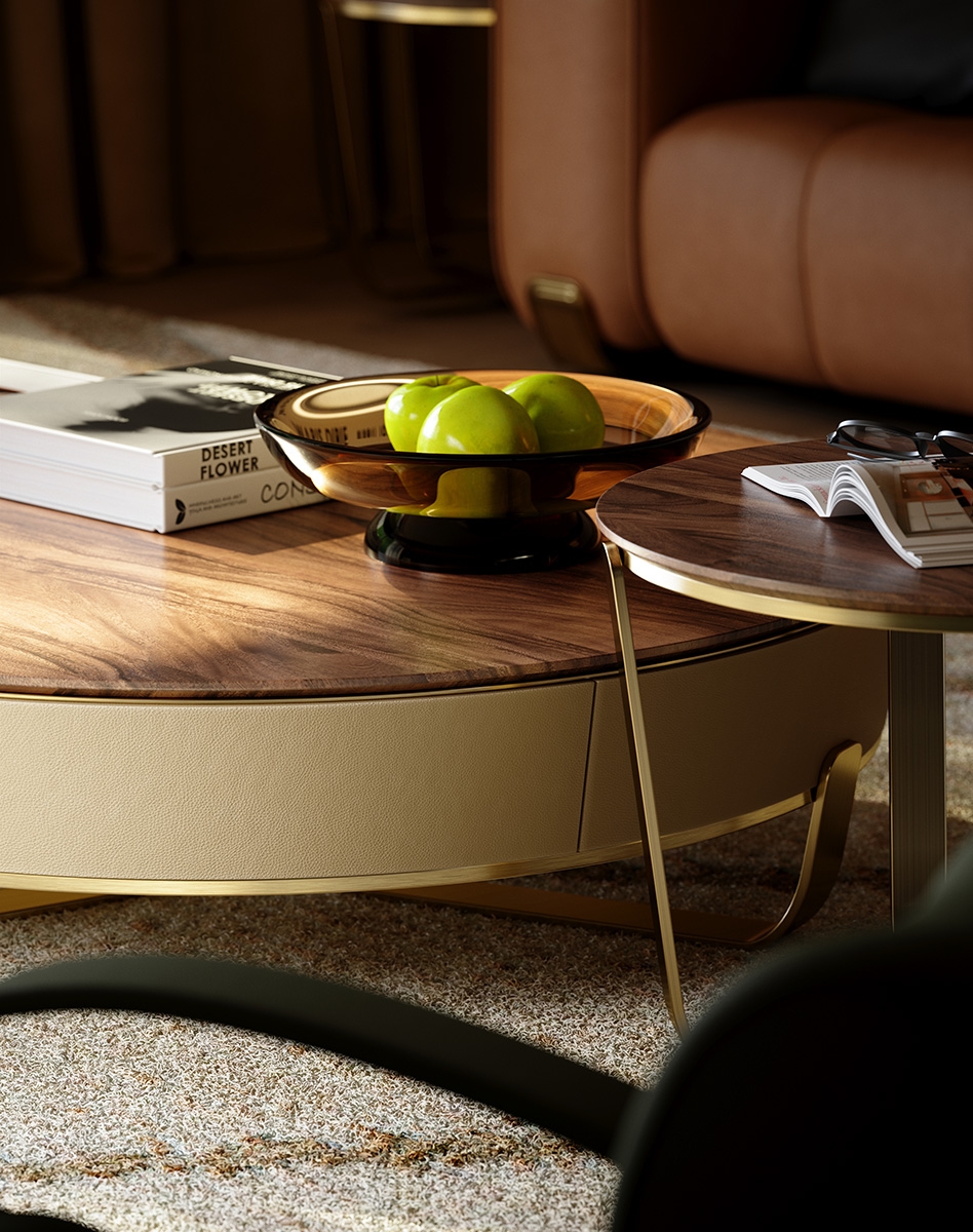 The top of the large coffee table is made of solid walnut wood, with natural texture like traces of time. It is hand-polished and painted with wood wax oil, making it warm and shiny. The cabinet body is covered with soft leather, and the light beige color is delicate and skin-friendly. It is soft to the touch and wear-resistant after an ecological tanning process. The frame of the small round table is matched with bronze metal.